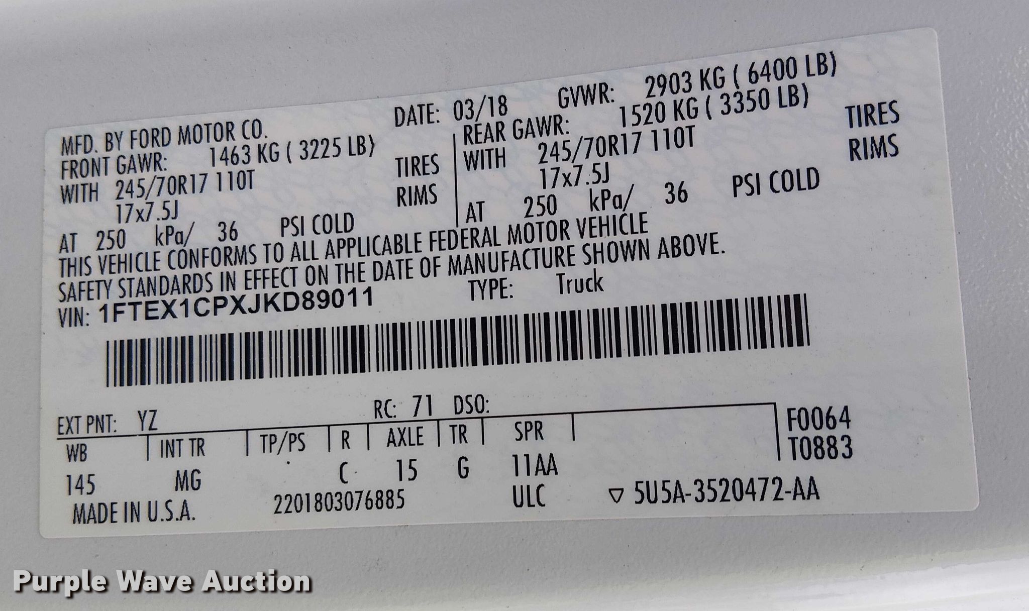 Purple Wave is selling a used 1/2 Ton Pickup or Van in California. This item is a 2018 Ford F150 Ext. Cab pickup truck with the following: Miles: 199,940 on odometer, Hours: 7,275 on meter, VIN: 1FTEX1CPXJKD89011