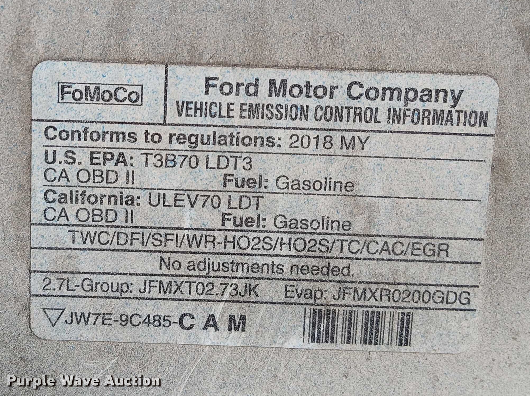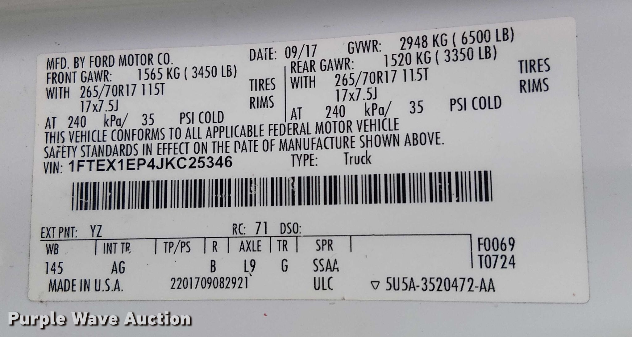 2018 Ford F150 Ext. Cab pickup truck. Miles: 183,396 on odometer, Hours: 7,736 on meter, VIN: 1FTEX1EP4JKC25346. Engine Displacement: 2.7L, Cylinders: 6, Fuel type: Gas. Transmission Automatic, Four wheel drive. Interior AC, Heat, Power windows, Power locks, Cruise control, Backup camera. Tires Size: 265/70R17. Notes Dash warning indicator: Airbag, Possible water damage.. Please review REQUIRED REMOVAL INSTRUCTIONS. Buyer responsible for all aspects of state emissions compliance. Titles will be distributed after confirmation of payment and removal. California title. Title distribution may be delayed up to 30 days from verification of funds. W.A. Rasic Construction. Colton, CA 92324
