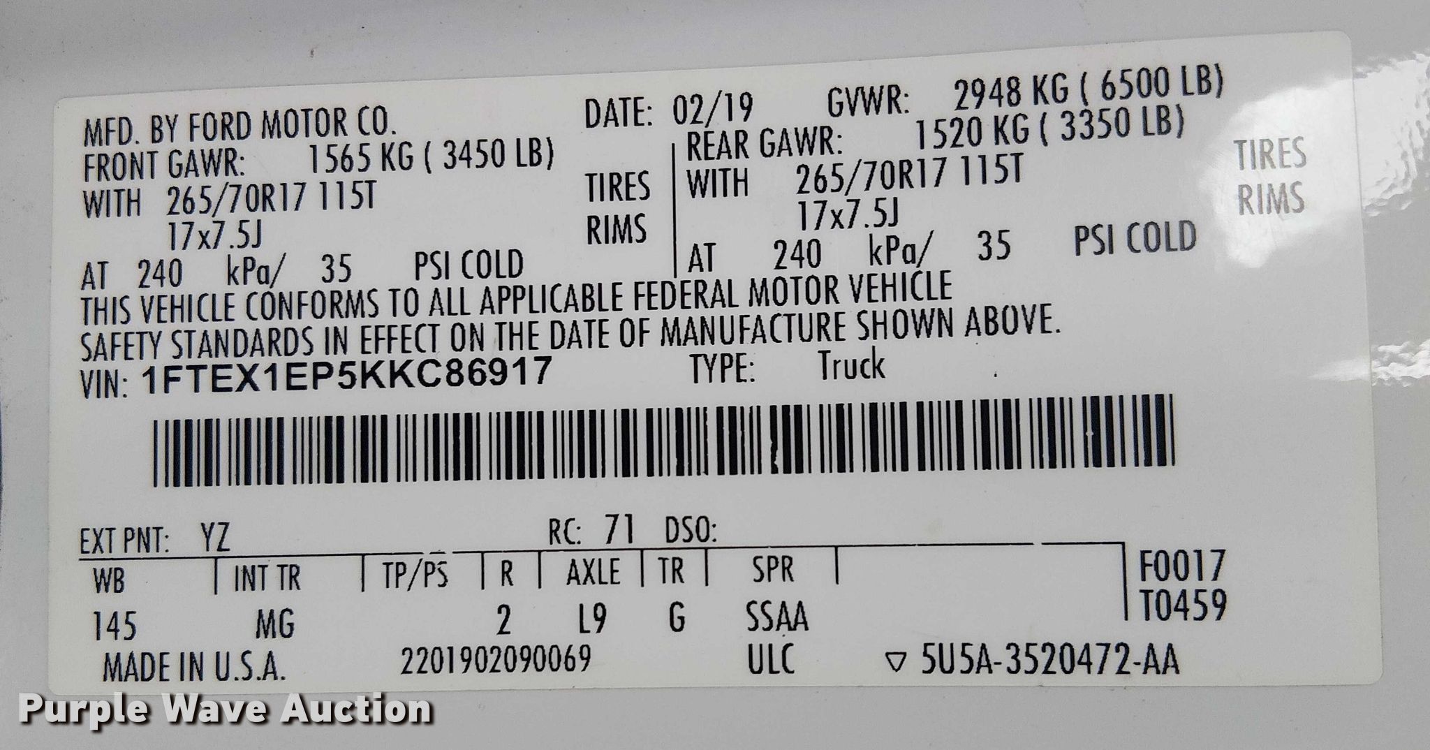 - VIN: 1FTEX1EP5KKC86917
