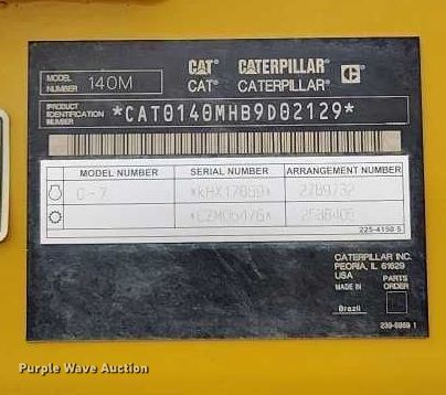 2010 Caterpillar 140M motor grader. Hours: 6,130 on meter, Serial: CAT0140MHB9D02129. Engine Caterpillar C7 Acert, Cylinders: 6, Fuel type: Diesel. Transmission Powershift, 8F - 6R. Chassis Differential lock. Operators station Enclosed cab, AC, Heat, Steering: Joystick, Hydraulic control valves: 8. Features Moldboard: Tip control, Side shift, Moldboard total width: 14', Circle slip clutch, Rear ripper Caterpillar, Ripper shanks: 5, Scarifier teeth: 9. Tires Front: 17.5R25. Notes Unknown operating condition of rear differential lock Due to differing rear tire manufacturer. Estate of Randy Hopwood. Byers, CO 80103