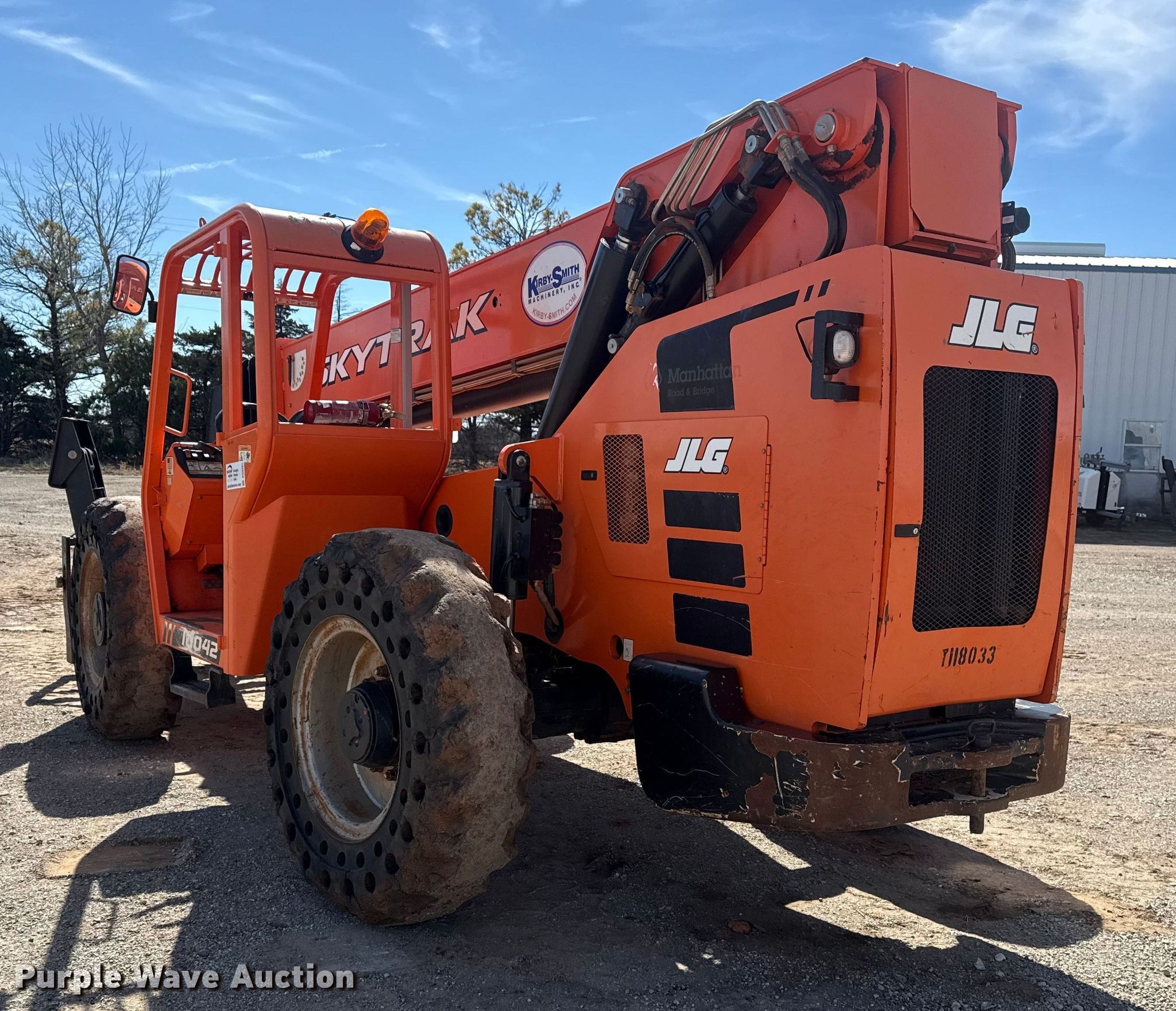 JLG Skytrak 10052 telehandler. Hours: 5,221 on meter, Unit #: 80-232. Engine Cylinders: 4, Fuel type: Diesel. Transmission Powershift, 4F - 4R, Four wheel drive. Operators station Steering: Crab, Four wheel. Features Maximum lift capacity: 10,000 lbs, Maximum lift height: 44', Boom stages: 2, Fork length: 47", Tilt carriage, Hydraulic outriggers. Tires Size: 14.00-24. Manhattan Road & Bridge. Perry, OK 73077