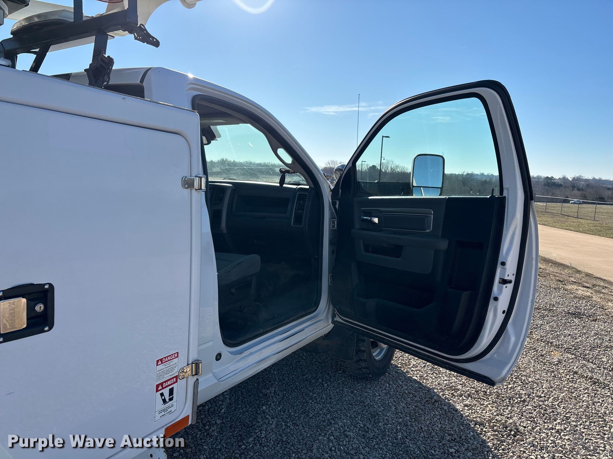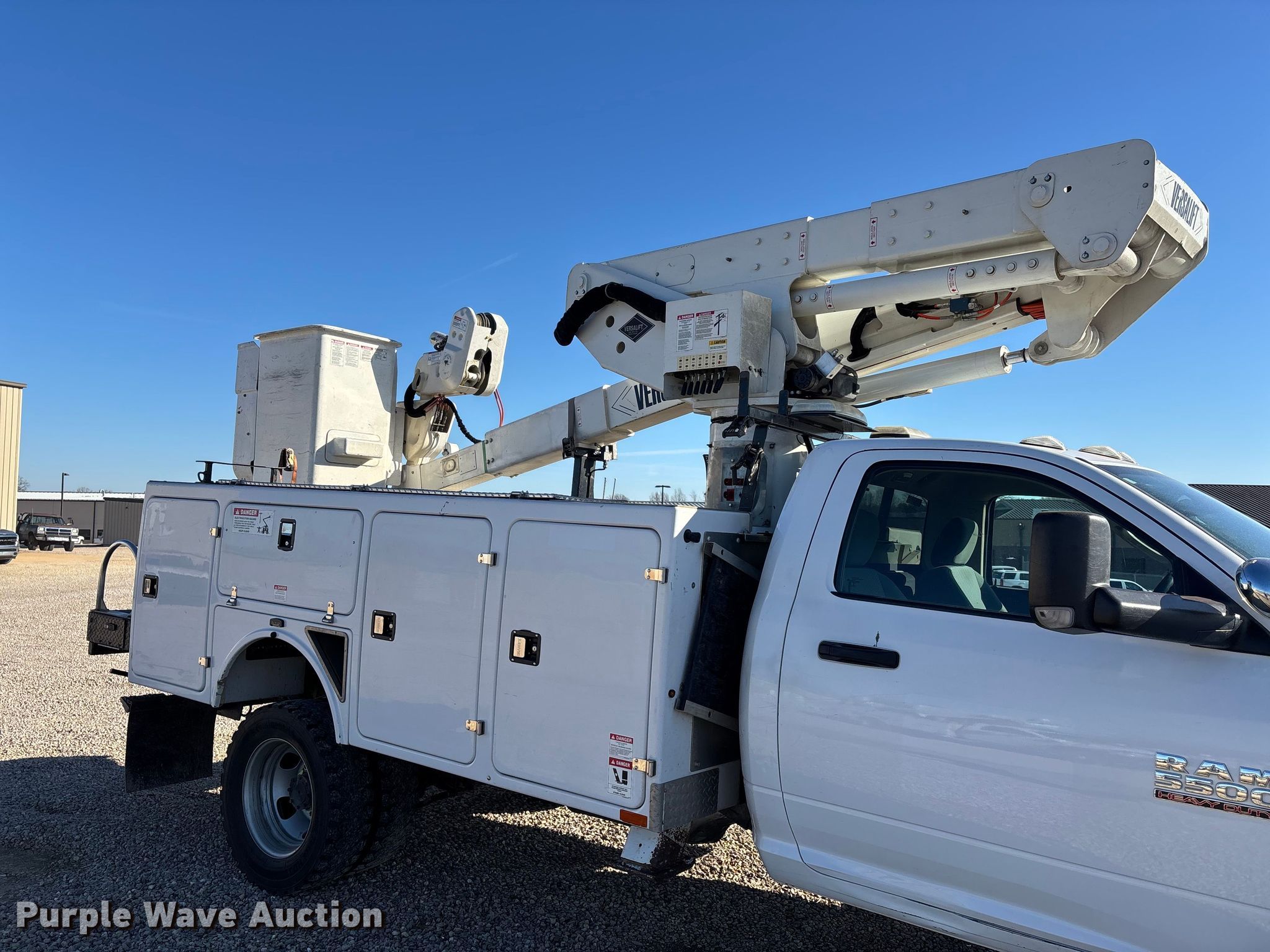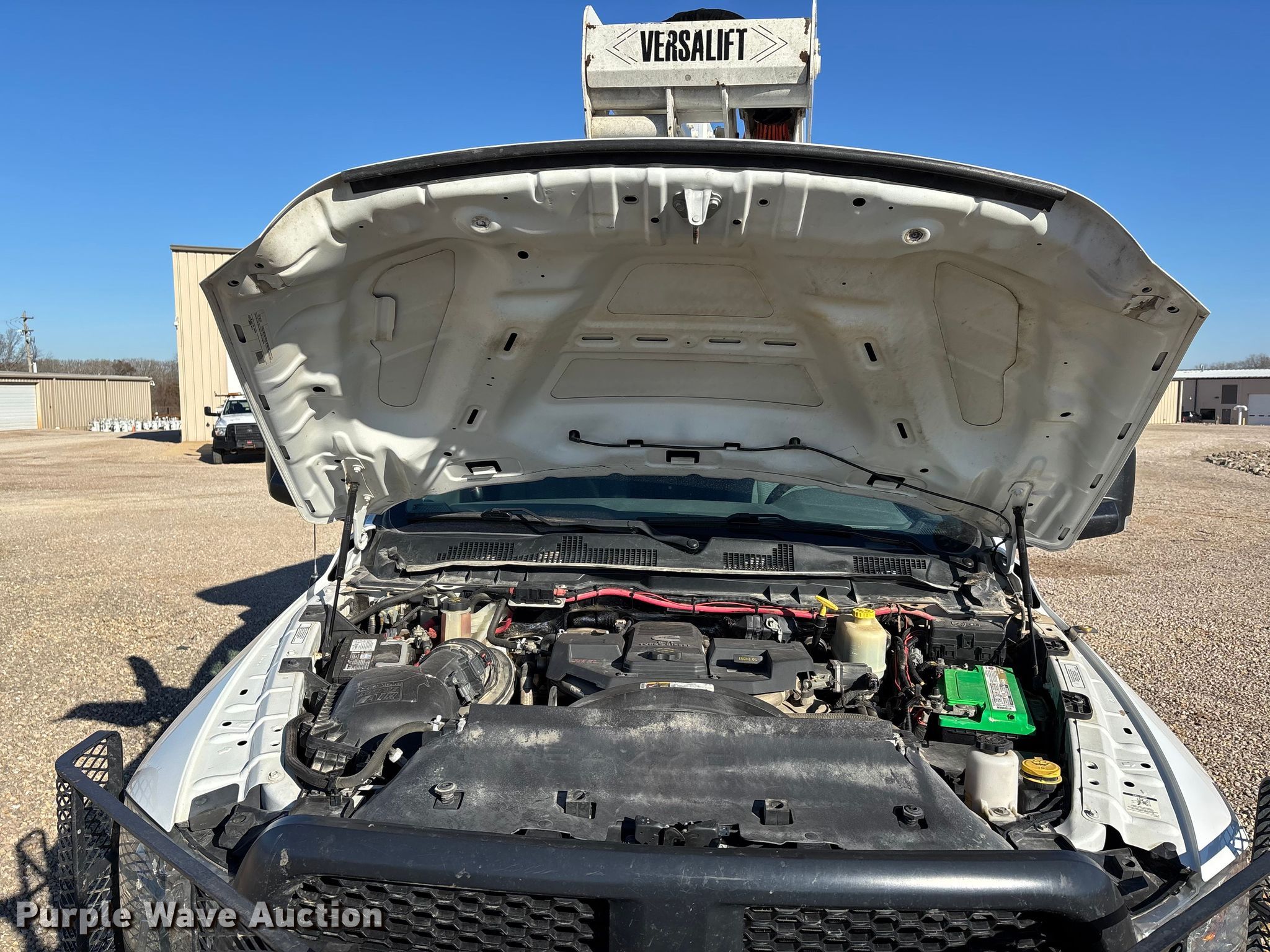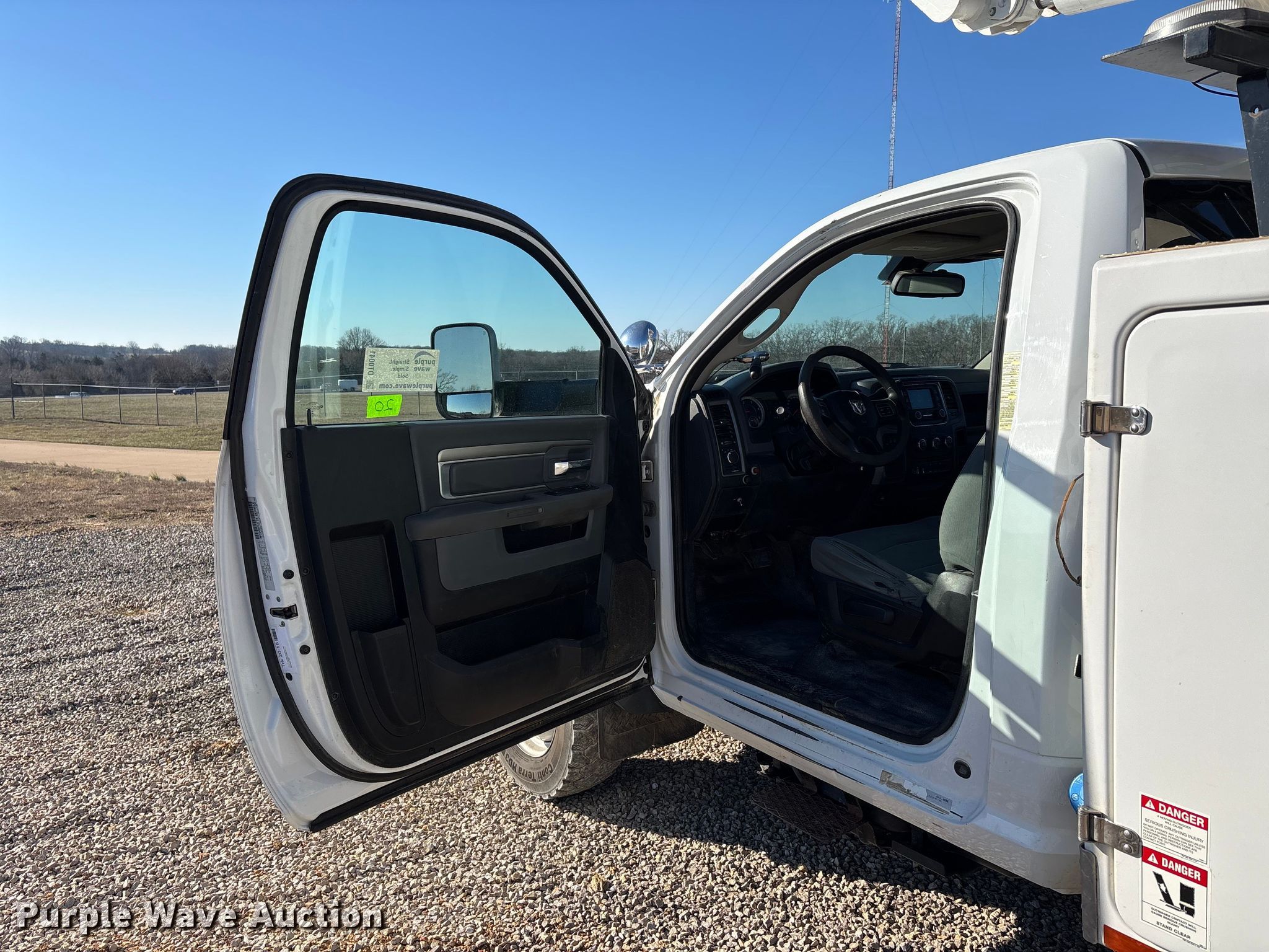 2016 RAM 5500 bucket truck. Miles: 165,173 on odometer, Miles or hours may vary, unit still in use, VIN: 3C7WRNBL8GG251555, Unit #: 20. Engine Displacement: 6.7L, Cylinders: 6, Fuel type: Diesel. Transmission Automatic. Chassis Four wheel drive, Axles: Single, Suspension: Spring, Brakes: Hydraulic, PTO, GVWR: 19,500 lbs. Interior AC, Heat, Heated mirrors, Power windows, Power locks, Cruise control, Backup camera, Auxiliary controls, Brake controller. Features Bed Utility bed, BrandFX, Serial: 1658091, Length: 11', Width: 8', Boom 2016 Versalift VST 40I, Serial: KW160090, Boom type: Articulating, Insulated, Telescopic, Elevator man basket, Boom controls Lower, Basket, Material handler, Warn Industrial Series 18 winch Capacity: 18,000 lbs. Tires Size: 245/70R19.5. Notes Owner's manual, Material handler boom parts missing, Dash warning indicator: Check engine, Center console missing. Missouri title. Title distribution may be delayed up to 14 days from verification of funds. Crawford Electric Cooperative. Bourbon, MO 65441