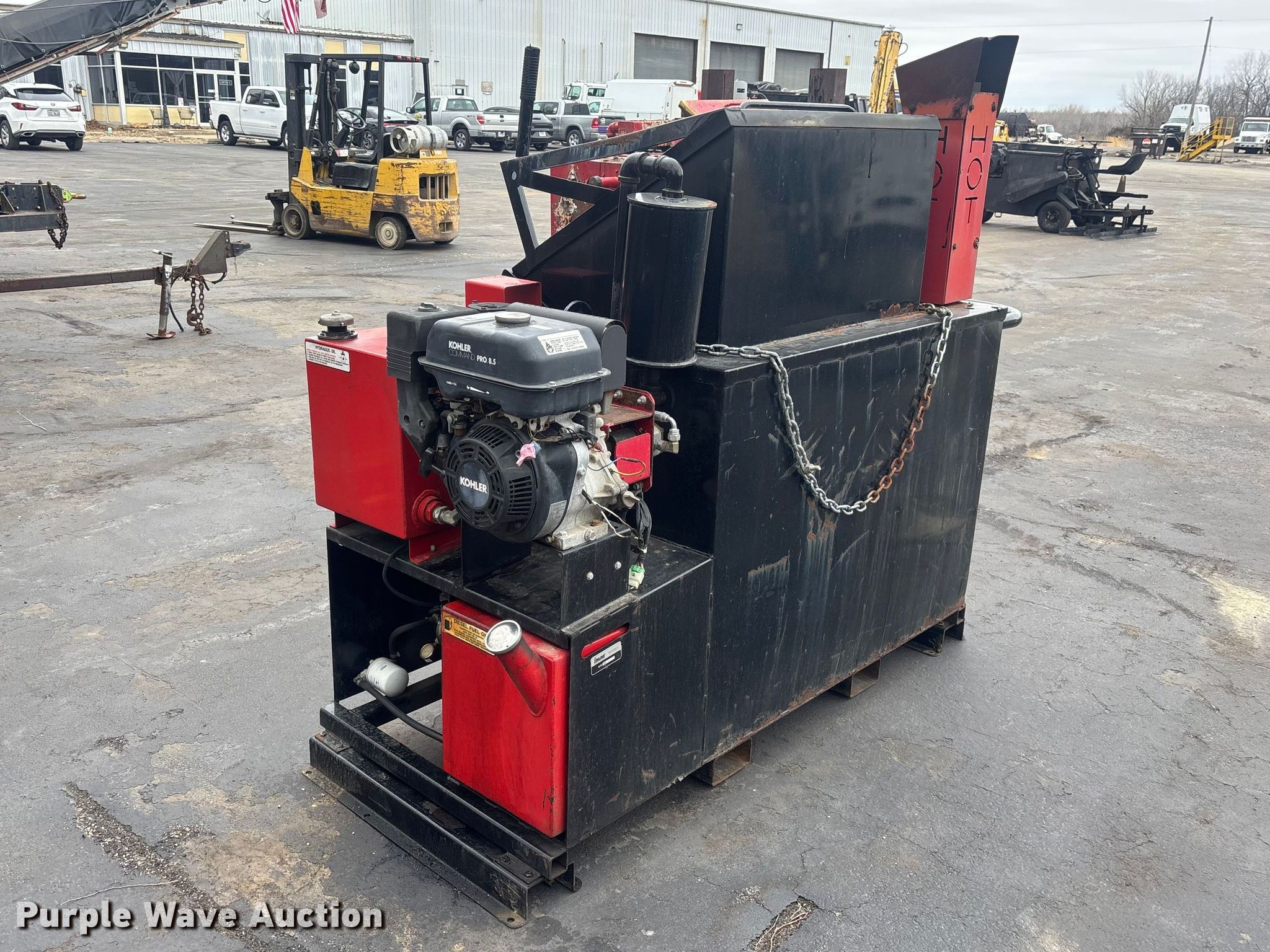 Cimline pothole patcher. Serial: 10-14863. Dimensions Overall Length: 7' 4", Width: 2' 8", Height: 5' 9". Engine Kohler Command Pro 8.5, Cylinders: 1, Fuel type: Gas. Hoerr's Blacktop and Sealcoating. Trivoli, IL 61569