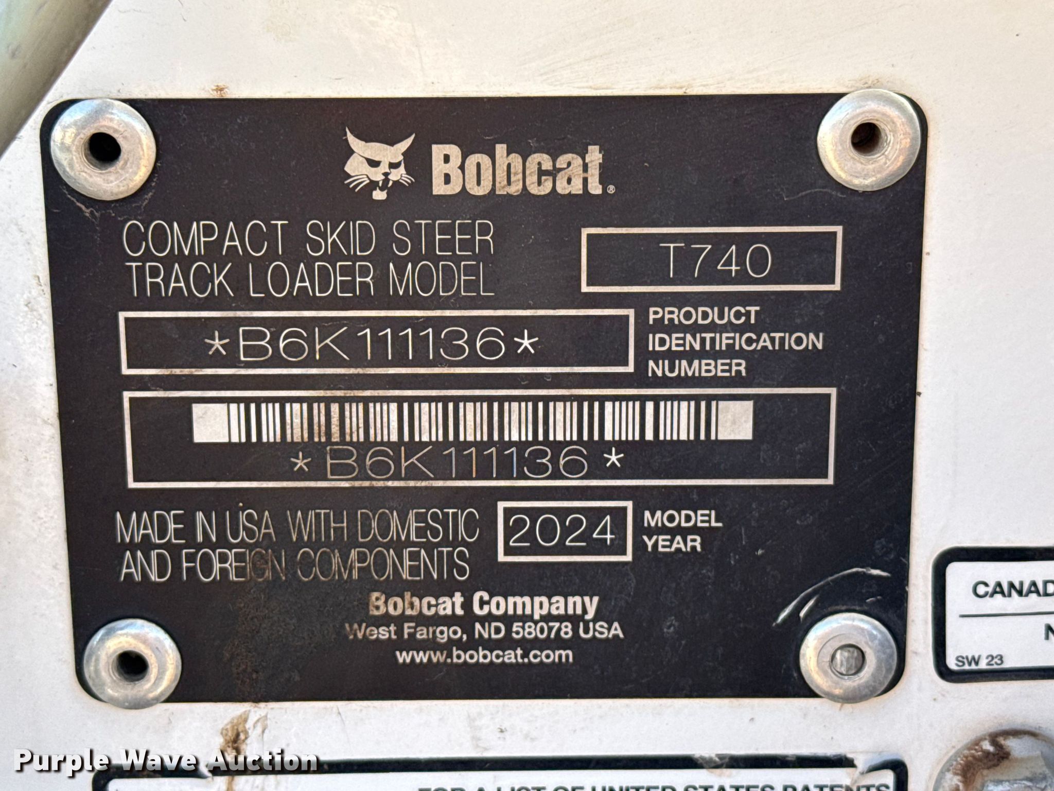 Purple Wave is selling a used Skid Steer Loader in Oklahoma. This item is a 2024 Bobcat T740 tracked skid steer loader with the following: Hours: 801 on meter, Serial: B6K111136