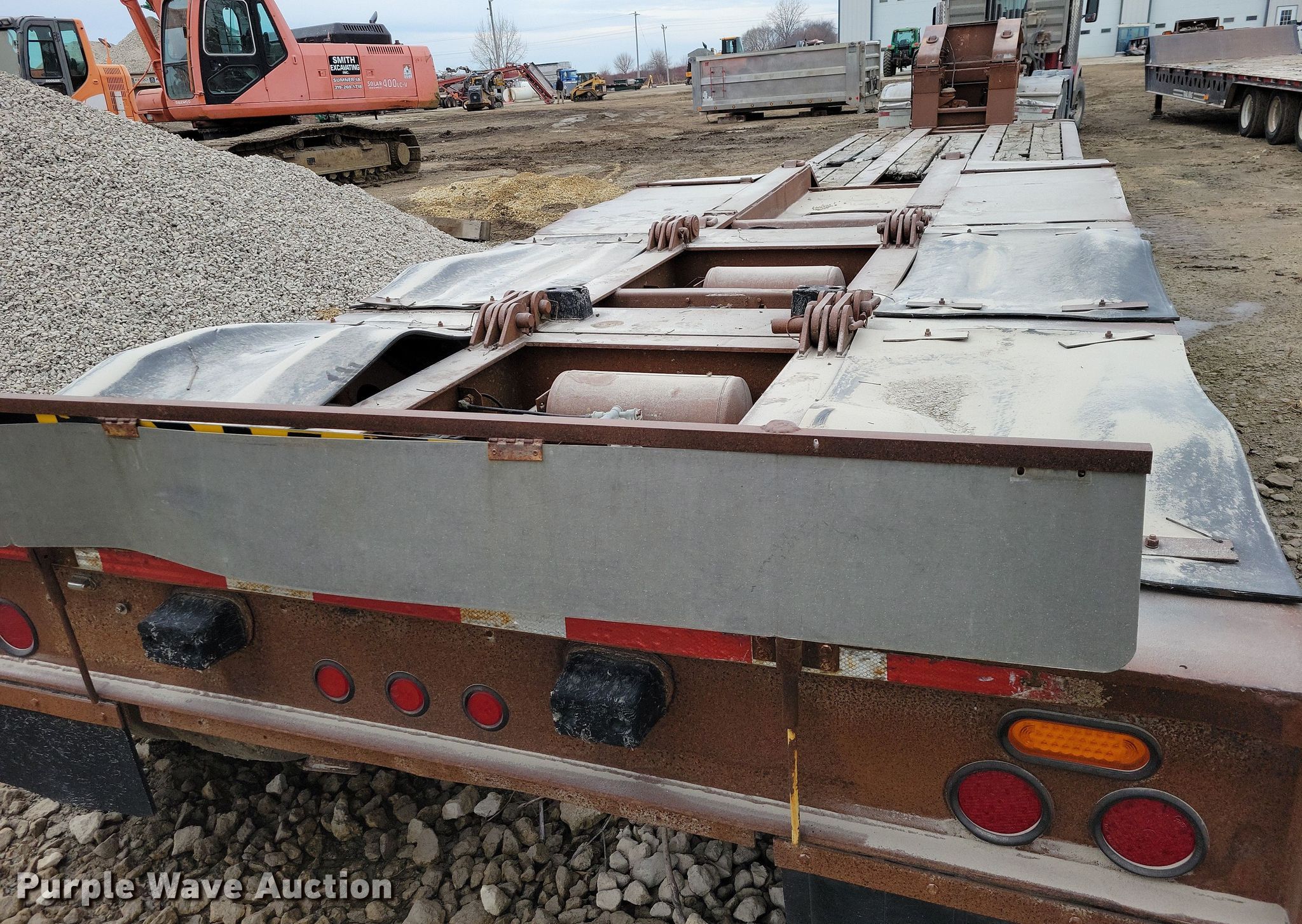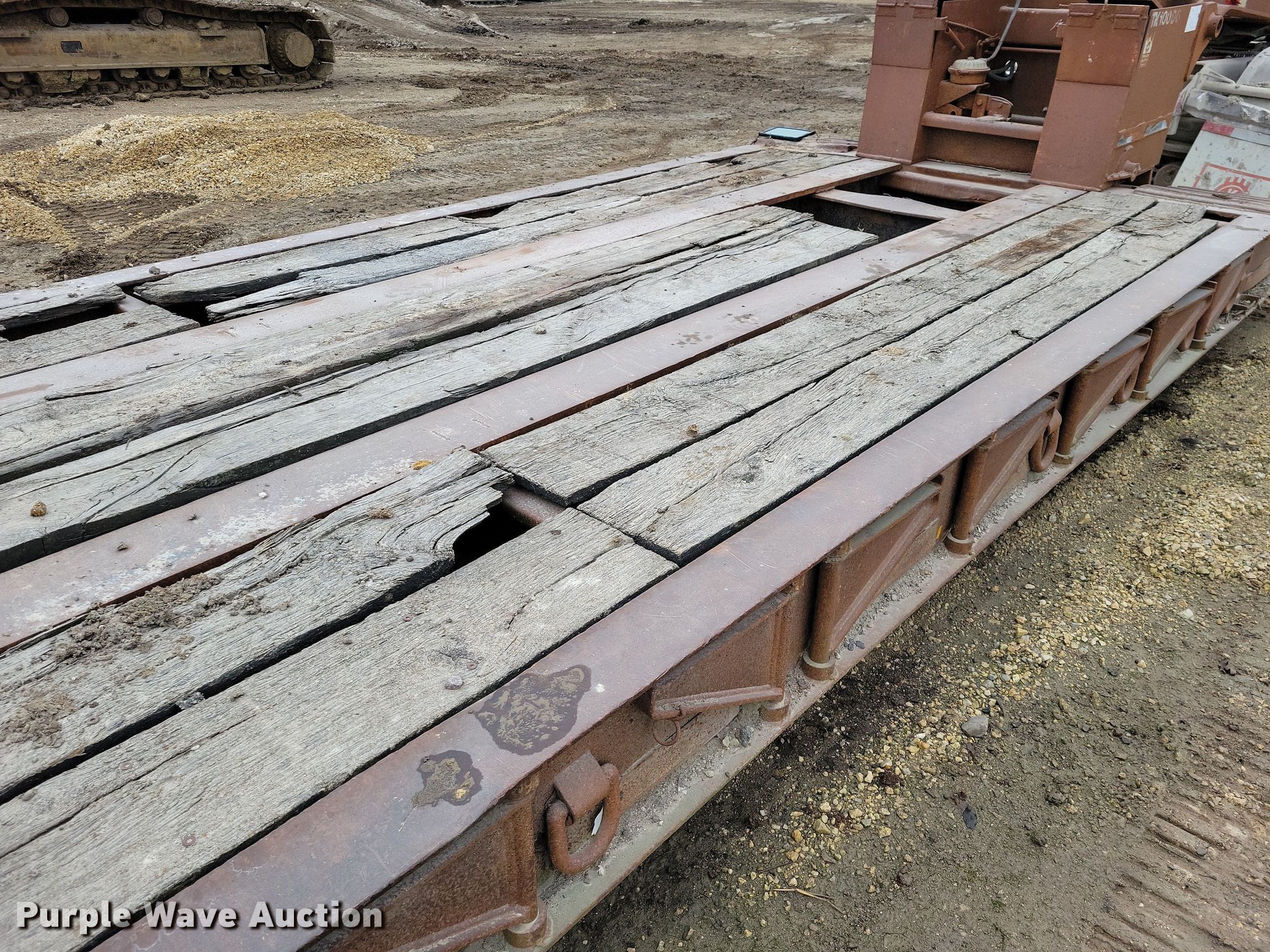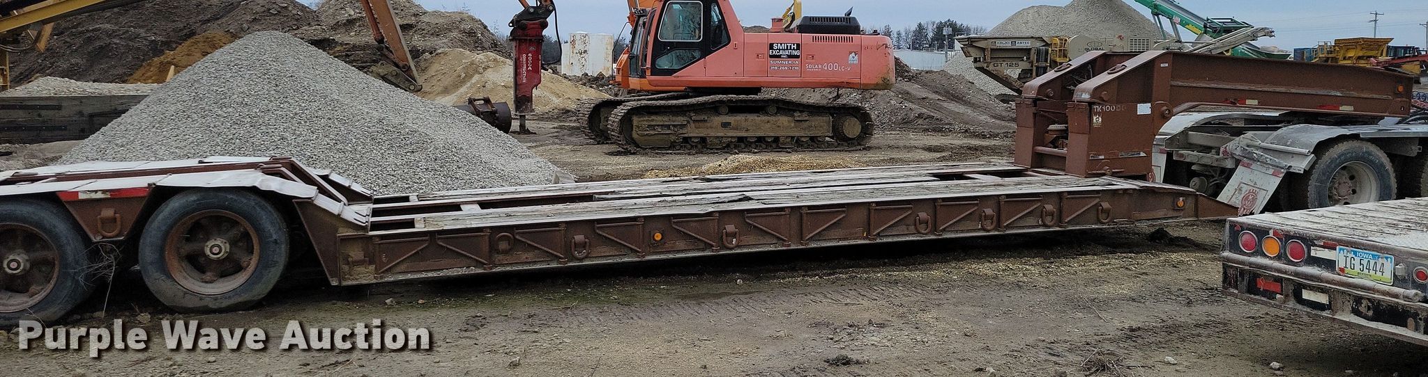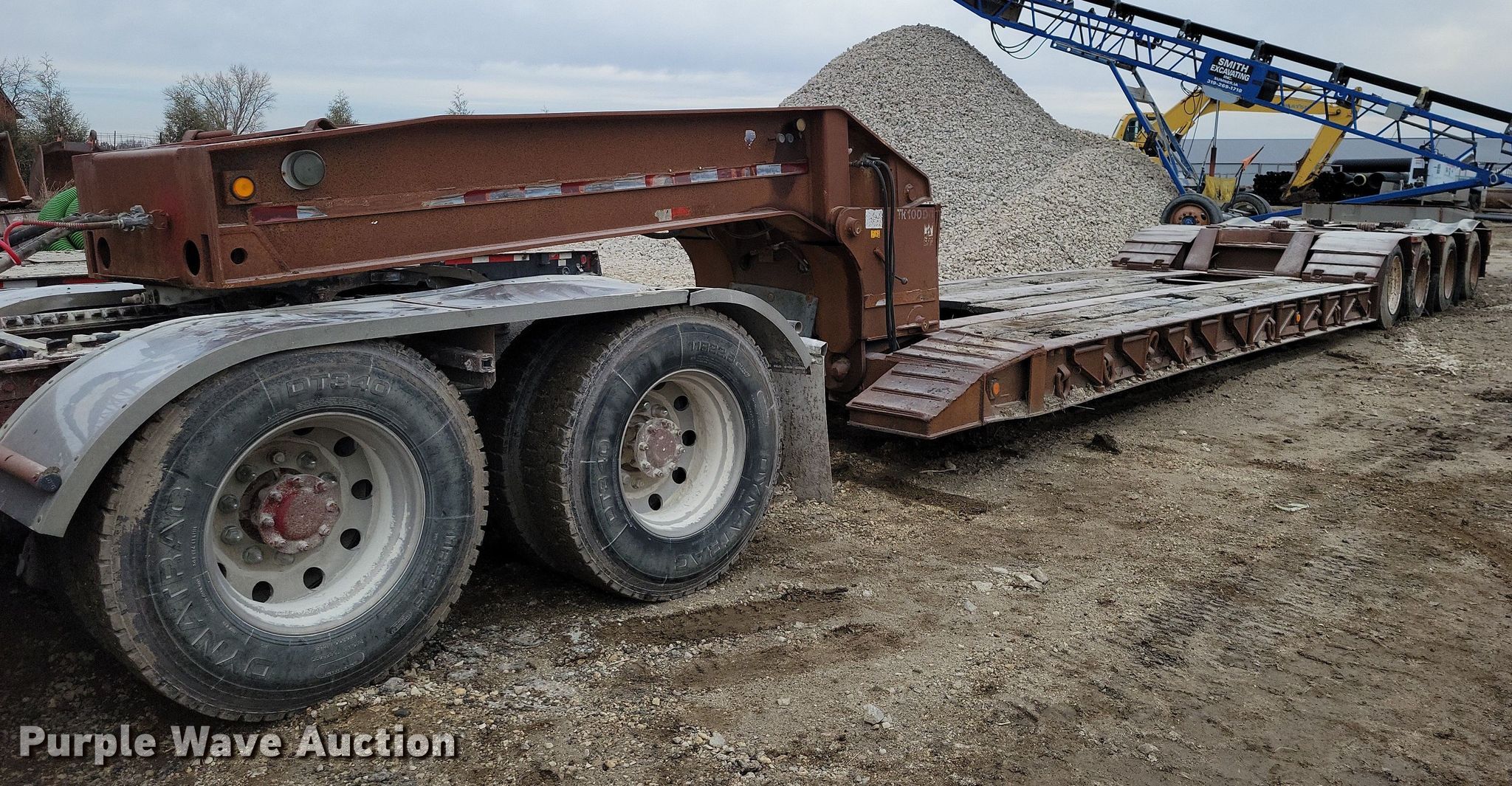 1990 Trail King TK100DG lowboy equipment trailer. VIN: IA046038. Dimensions Overall Length: 54', Width: 102", Deck Length: 21' 4", Width: 102", Deck height: 22" Length: 3' 9". Features Deck type: Wood, Outriggers: Swing-out Board size: 12", Neck type: Detachable, Hydraulic controls: Manual. Chassis Suspension: Air, Brakes: Air, Axles: Quad. Tires Steel wheels, Size: 255/70R22.5. Notes Truck not included, Outriggers rust damage. Iowa title. Title distribution may be delayed up to 14 days from verification of funds. Smith Excavating, Inc.. Sumner, IA 50674
