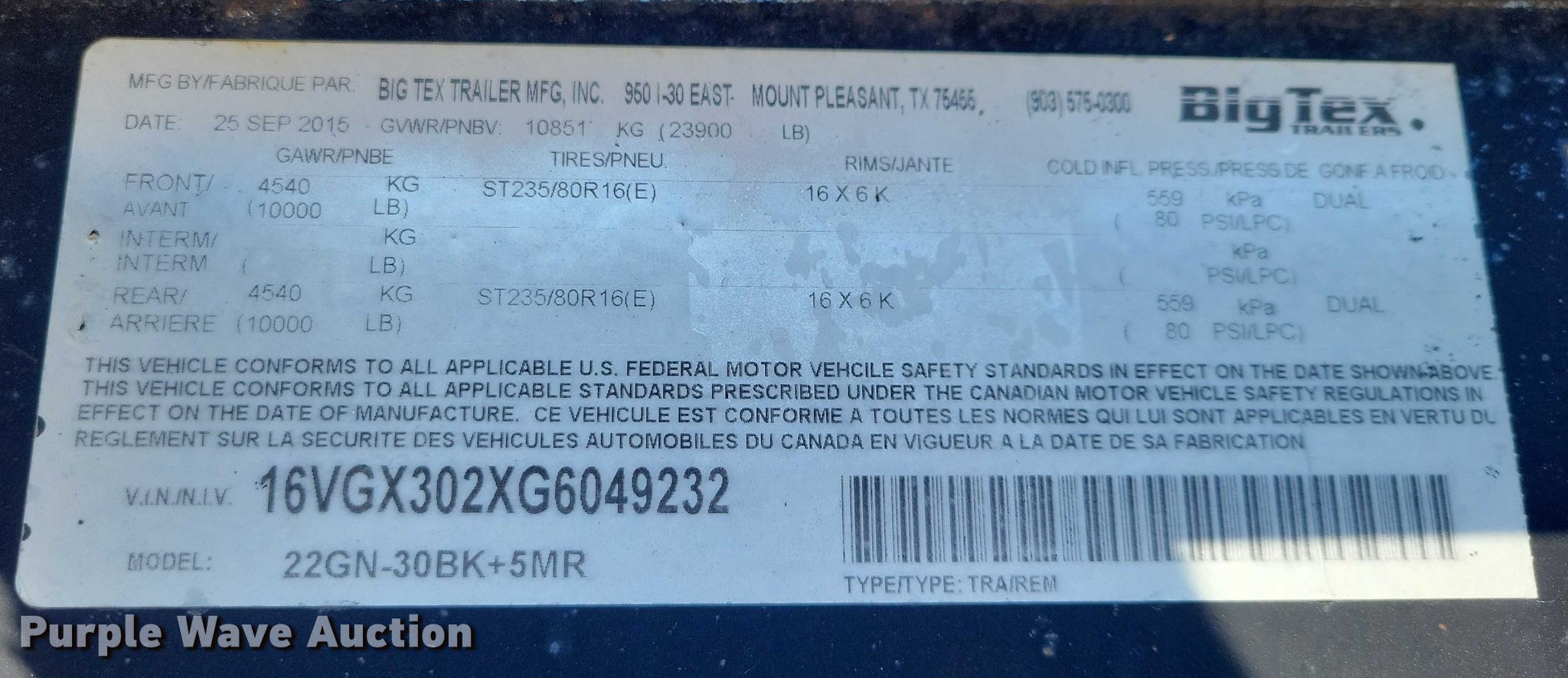 Purple Wave is selling a used Equip. Trailer in Missouri. This item is a 2016 Big Tex 22GN HD equipment trailer with the following: VIN: 16VGX302XG6049232