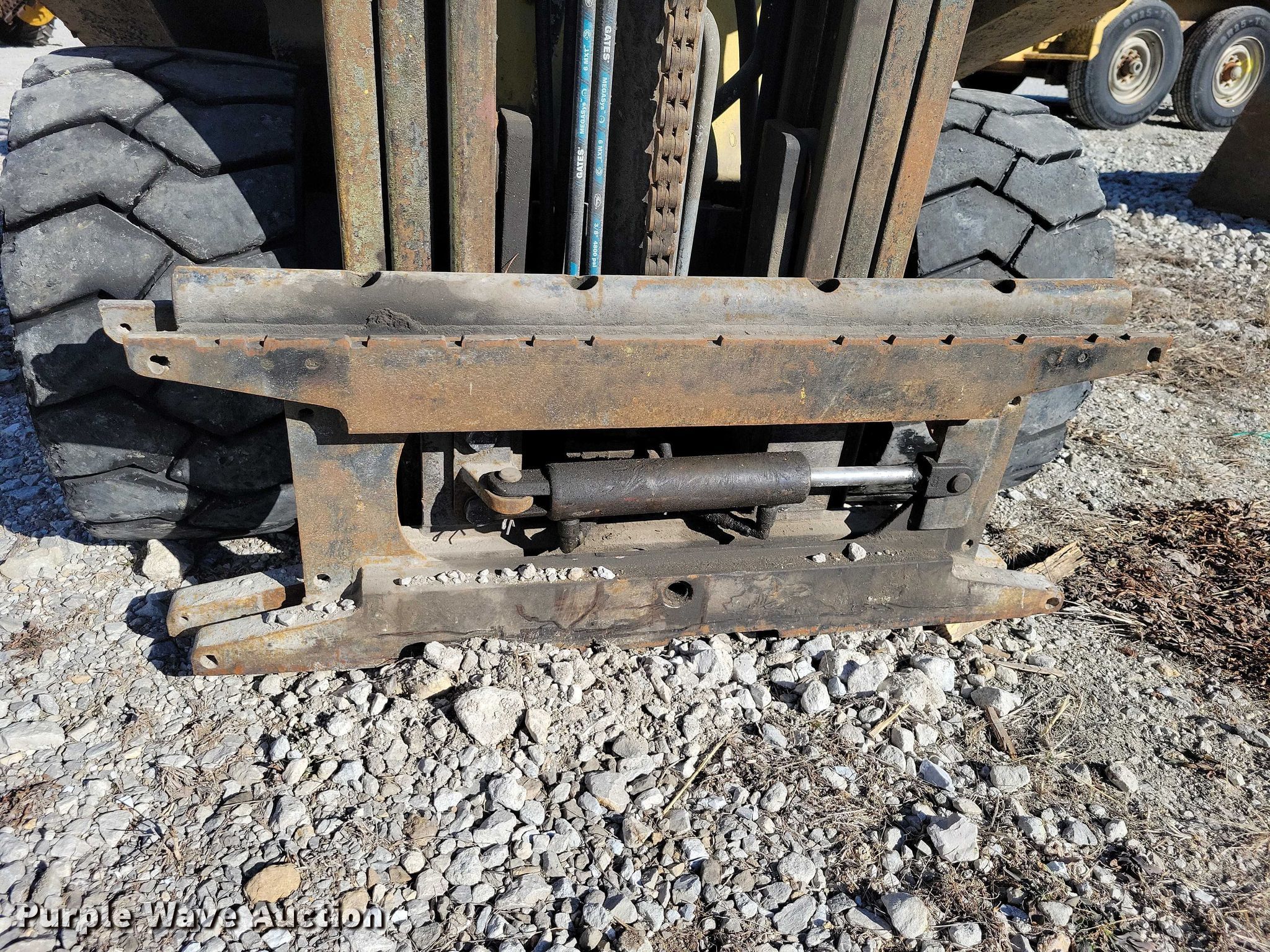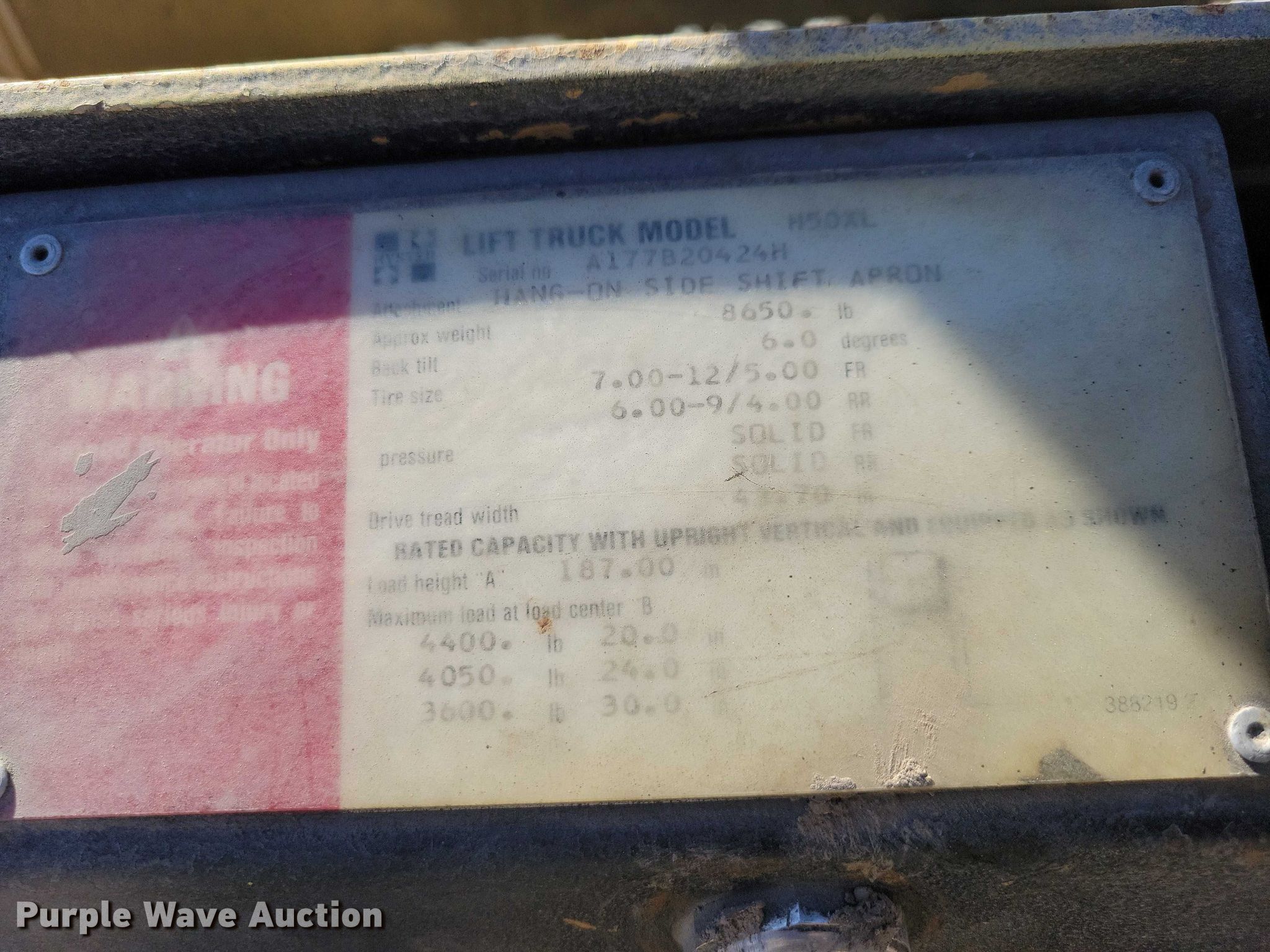 Hyster H50XL forklift. Hours: 6,119 on meter, Serial: A177B20424H. Engine Cylinders: 4, Fuel type: LPG LP bottle: Not included. Transmission Powershift. Operators station OROPS. Features Maximum lift capacity: 4,400 lbs, Maximum lift height: 187", Collapsed mast height: 82", Mast stages: 3, Side shift, Mast tilt. Tires Front: 28X12-15NHS, Rear: 6-9, Solid. Notes Engine issues, seized , Non-operational unit. Utility Safety and Design Inc.. Unionville, MO 63565