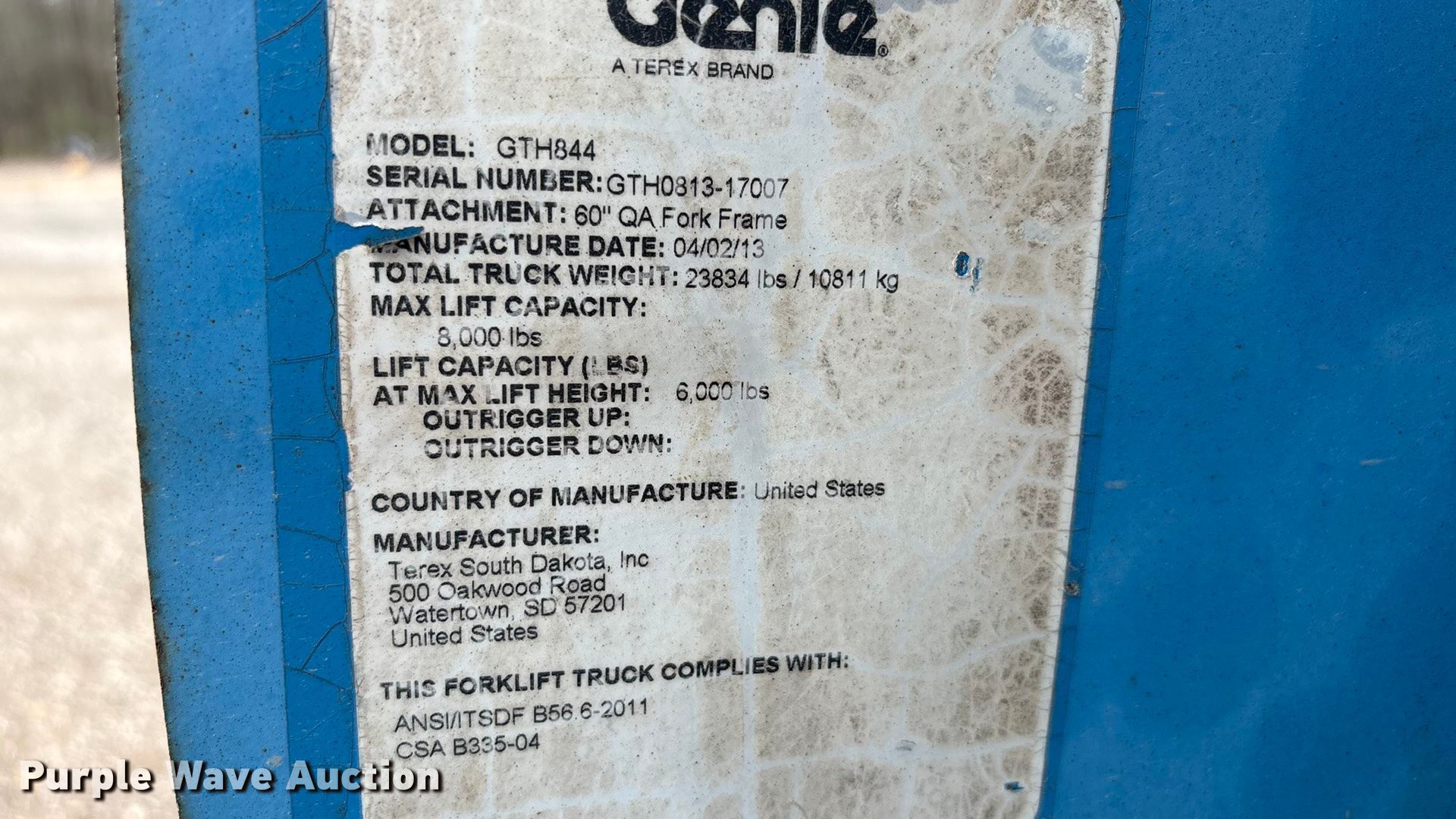 2014 Genie GTH844 telehandler. Hours: Unknown, Serial: GTH0813-17007. Engine Deutz TDC3.6L4, Serial: 11381798, Displacement: 3.6L, Cylinders: 4, Fuel type: Diesel. Transmission Shuttle shift, 3F - 3R, Four wheel drive. Operators station OROPS, Steering: Crab, Four wheel. Features Maximum lift capacity: 8,000 lbs, Boom stages: 3, Fork length: 71", Hydraulic leveling, Quick attach: Manual. Tires Size: 13.00-24, Solid. Iron Ranch LLC. Grand Saline, TX 75140