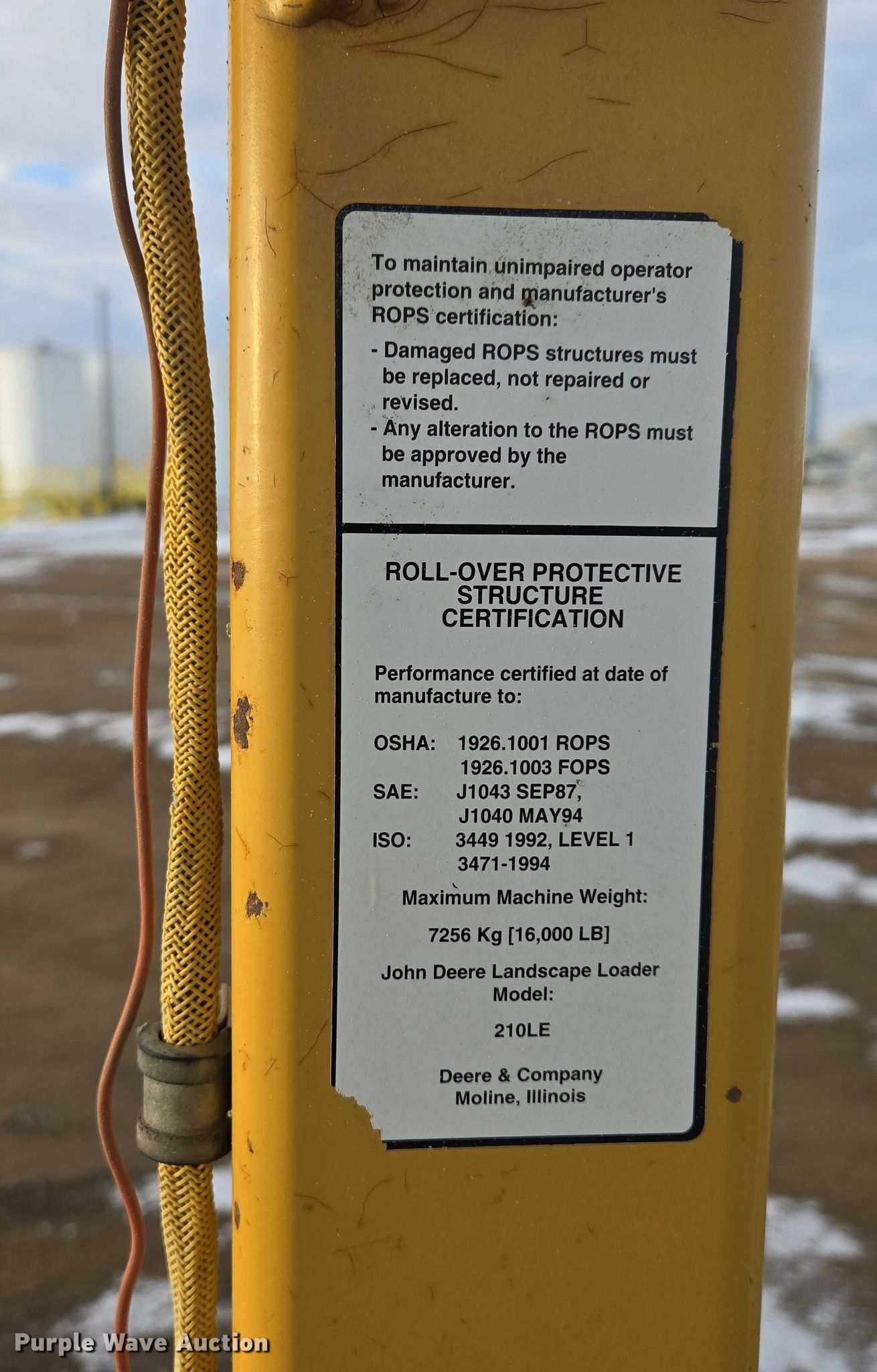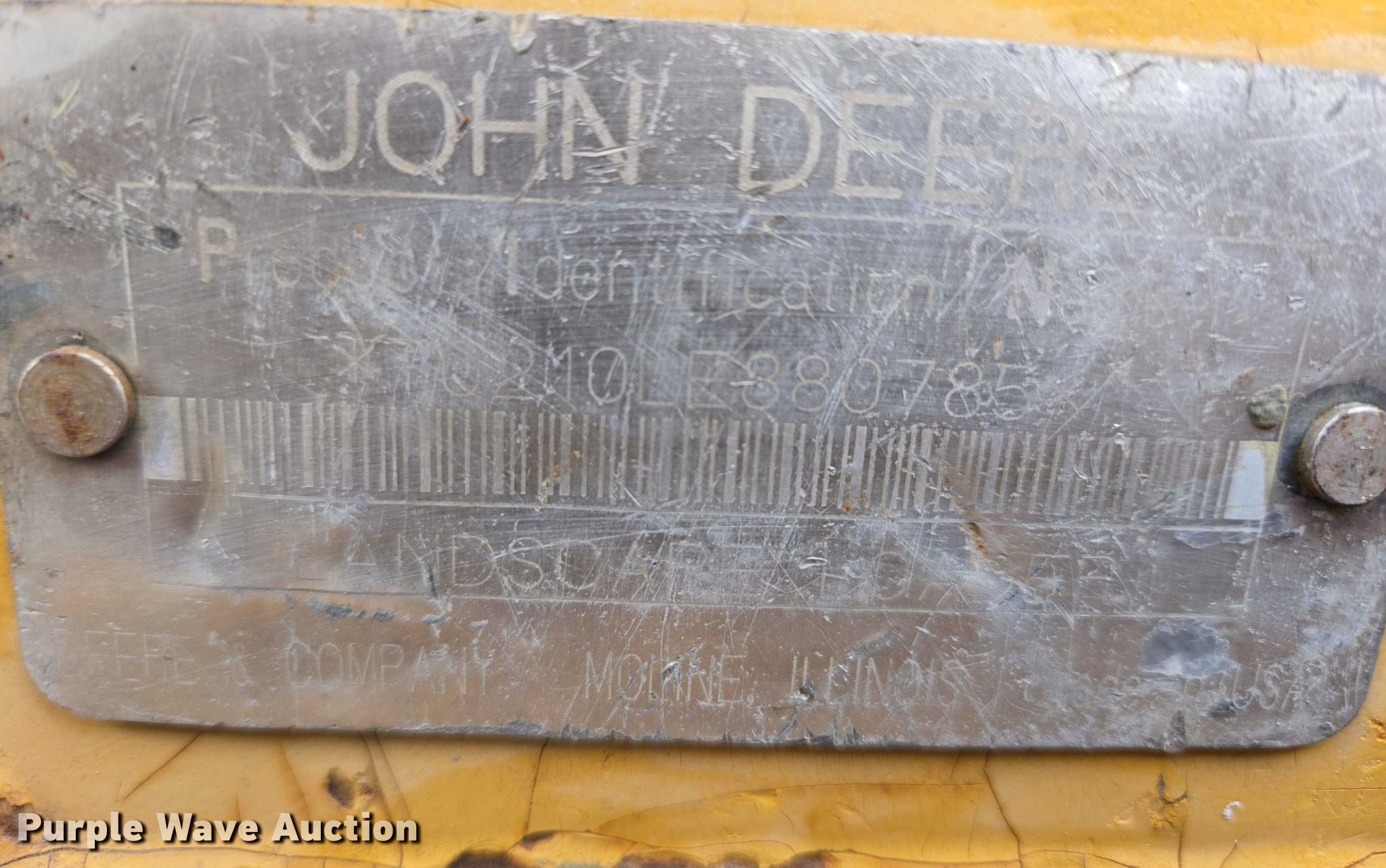 2000 John Deere 210LE landscape tractor. Hours: 8,489 on meter, Serial: T0210LE880785, Unit #: 48.126132-07132. Engine John Deere PowerTech, Displacement: 4.5L, Cylinders: 4, Fuel type: Diesel. Transmission Shuttle shift, 4F - 4R. Chassis Four wheel drive. Operators station OROPS. Features Loader Bucket Bucket leveler, Width: 84", Cutting edge: Bolt-on, Box blade Width: 85", Cutting edge: Front, Rear, Bolt-on. Tires Front: 305/70D16.5, Rear: 16.9-24. Notes Key not included. Knife River. Grand Forks, ND 58203