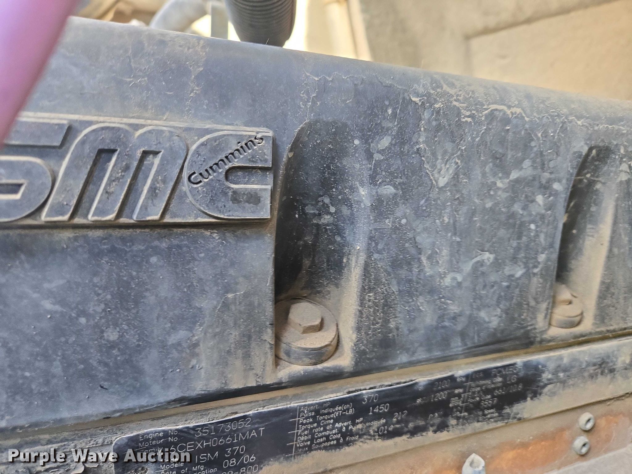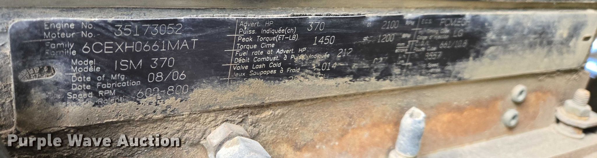 2007 International 9200i semi truck. Miles: 622,913 on odometer, Hours: 16,543 on meter, VIN: 2HSCEAHRX7C500491, Unit #: 48.026111-15111. Engine Cummins ISM 370, Displacement: 10.8L, Cylinders: 6, Fuel type: Diesel, HP: 370, Engine brake. Transmission Eaton Fuller, Manual, Speed: 10. Chassis Axles: Tandem, Differential lock: Inter-axle, Suspension: Air Dump valves, Brakes: Air, PTO, Wet kit, GVWR: 52,000 lbs FAWR: 12,000 lbs, IAWR: 20,000 lbs, RAWR: 20,000 lbs. Interior AC, Heat, Heated mirrors, Power windows, Power locks, Cruise control. Features Deck plate: Aluminum, Fifth wheel type: Air operated, Sliding, Fuel tank: Dual. Tires Size: 11R22.5. Notes Oil leak, Windshield chipped or cracked. North Dakota title. Title distribution may be delayed up to 30 days from verification of funds. Knife River. Grand Forks, ND 58203