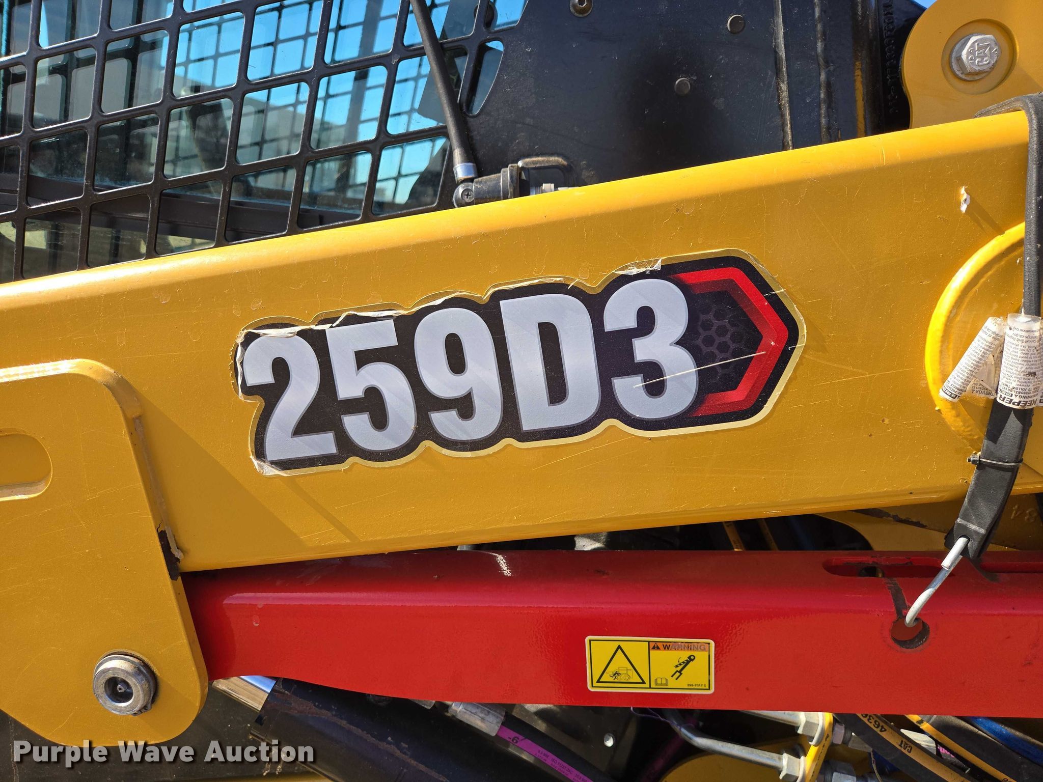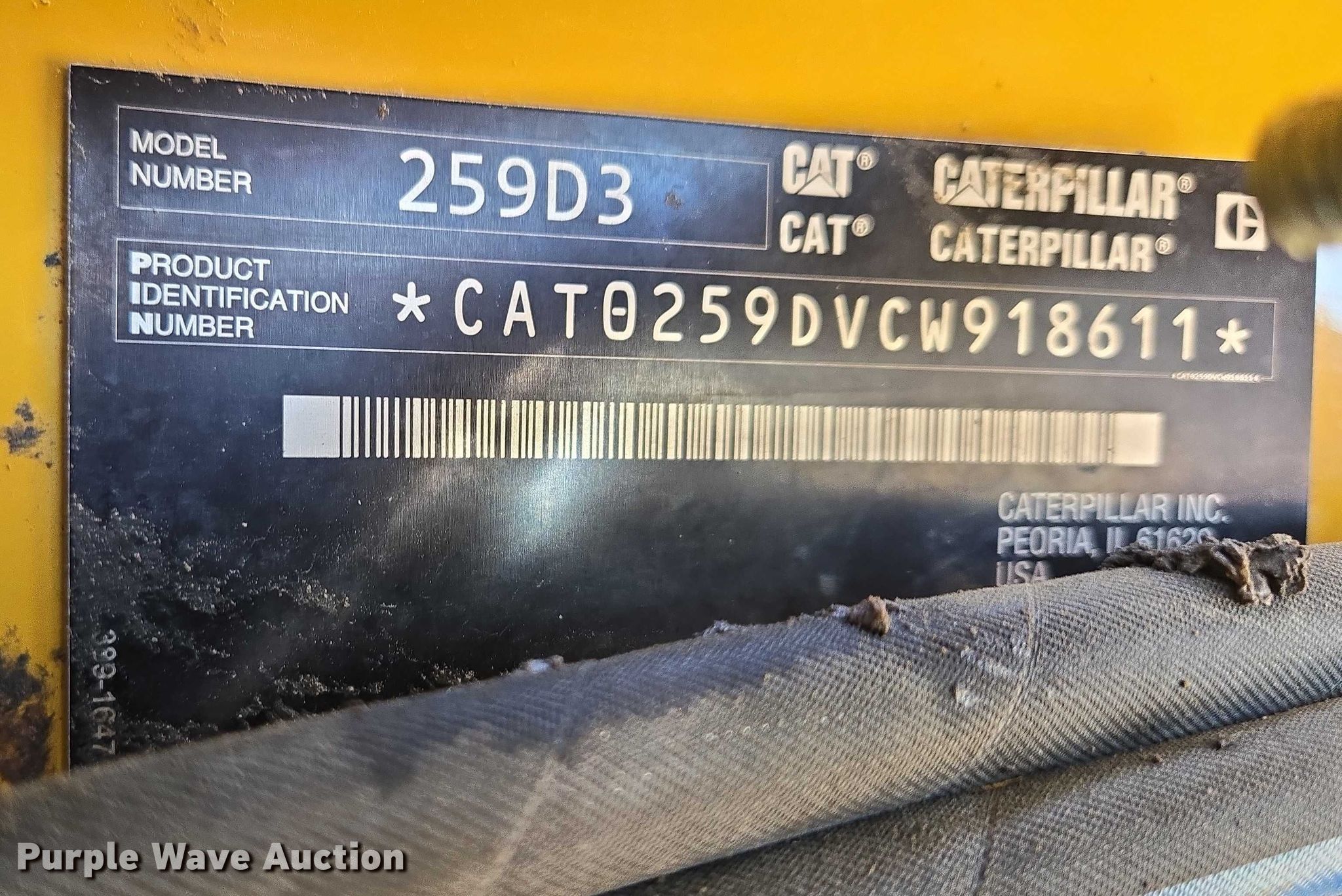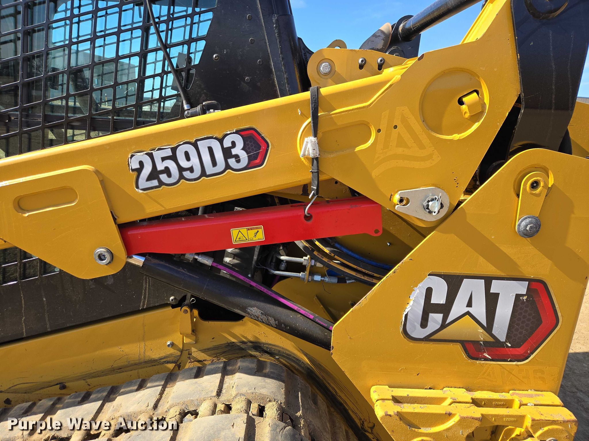 2022 Caterpillar 259D3 tracked skid steer loader. Hours: 3,918 on meter, Serial: CAT0259DVCW918611. Engine Caterpillar C3.3B-CR-T-EF04, Displacement: 3.3L, Cylinders: 4, Fuel type: Diesel. Transmission Hydrostatic, Two speed travel. Operators station Enclosed cab, AC, Heat, Backup camera, Bucket control: Hand, Electronic Monitoring System panel. Features Auxiliary hydraulics, Auxiliary electrical outlet, Quick coupler: Hydraulic, Counter weights, Bucket Caterpillar, Width: 74", Cutting edge: Bolt-on. Tracks Width: 15". Butler CAT. Sioux Falls, SD 57107