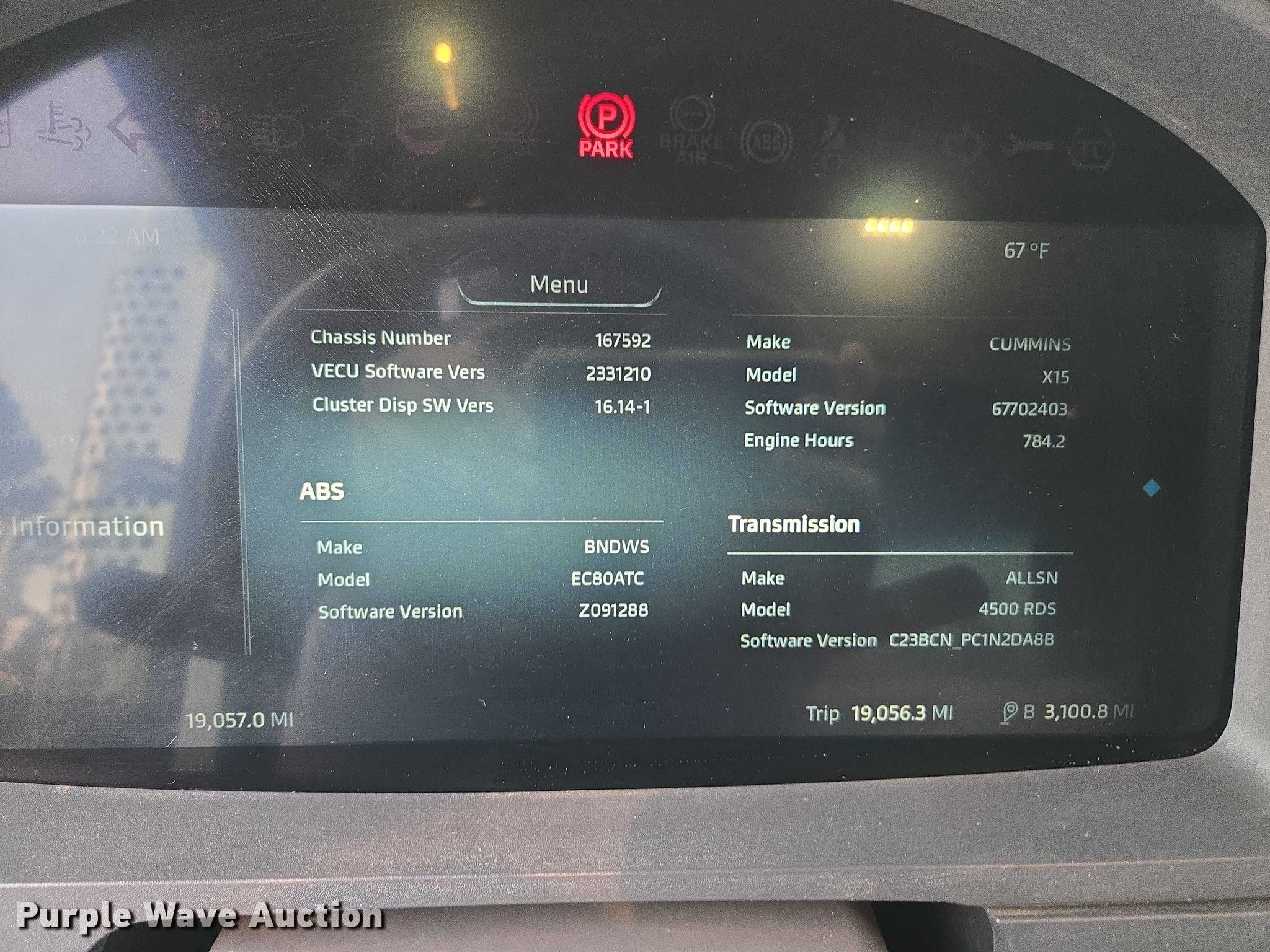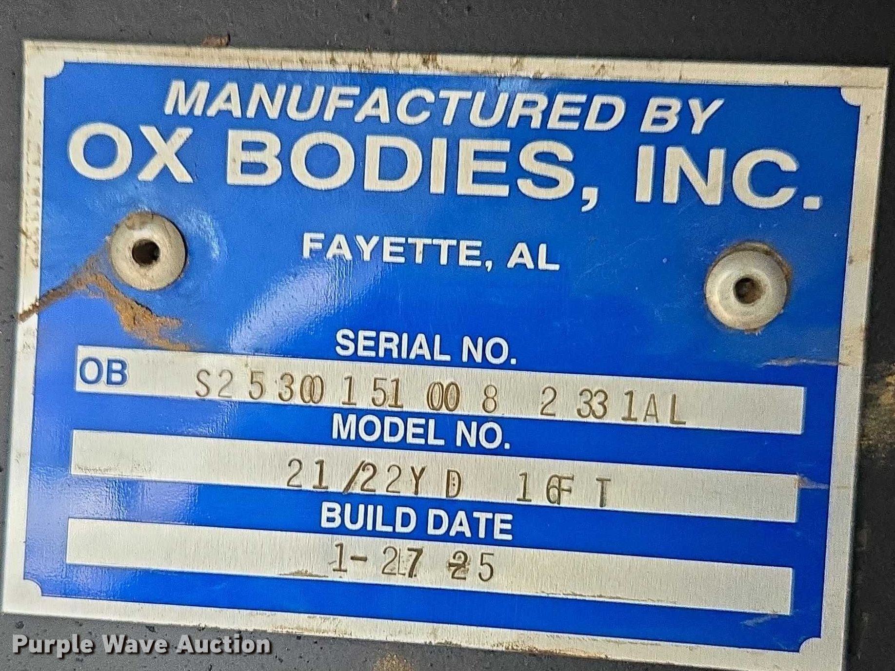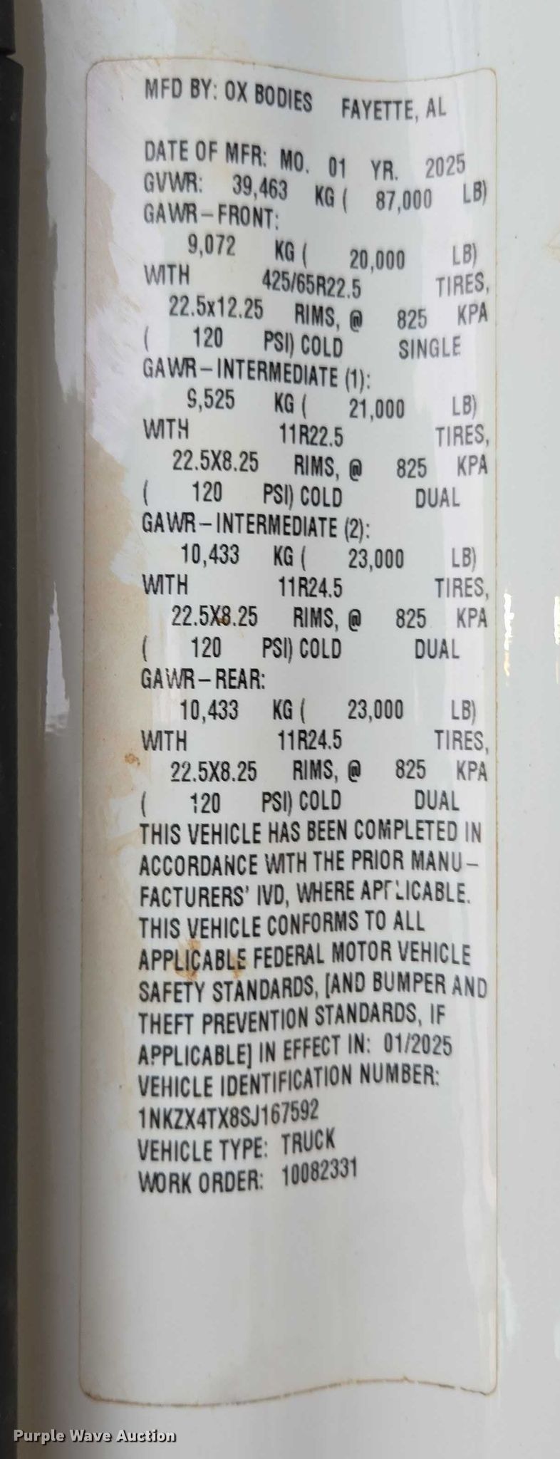 2025 Kenworth T880 dump truck. Miles: 19,057 on odometer, Hours: 746 on meter, VIN: 1NKZX4TX8SJ167592. Engine Cummins X15 500V, Displacement: 15.0L, Cylinders: 6, Fuel type: Diesel, Engine brake. Transmission Allison 4500, Automatic. Chassis Double frame, Axles: Triple, Pusher axle, Differential lock: Full, Suspension: Spring over walking beam, Brakes: Air, PTO, GVWR: 87,000 lbs FAWR: 20,000 lbs, IAWR: 23,000 lbs, RAWR: 23,000 lbs, Lift axle GAWR: 21,000 lbs. Interior AC, Heat, Heated mirrors, Power windows, Cruise control, Power locks. Features Bed Dump bed, Ox Bodies 21/22YD, Length: 16', Width: 98", Capacity: 21 cu.yd., Side height: 60", Bed type: Steel, Bed vibrator, Roll tarp, Ram: Single, End gate: Air operated. Tires Front: 425/65R22.5, Rear: 11R24.5, Lift axle: 11R22.5. Alabama title. Title has a lien that will be released following the close of the auction. Seller is a government entity who will be assigning and distributing the title. Please contact the seller for distribution questions. Title distribution may be delayed up to 30 days from verification of funds. Pickens County, AL. Carrollton, AL 35447