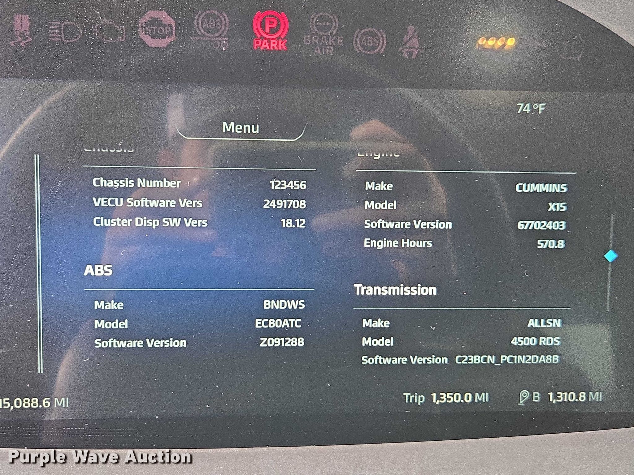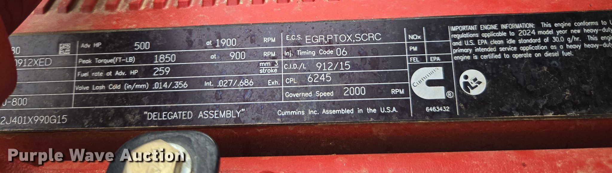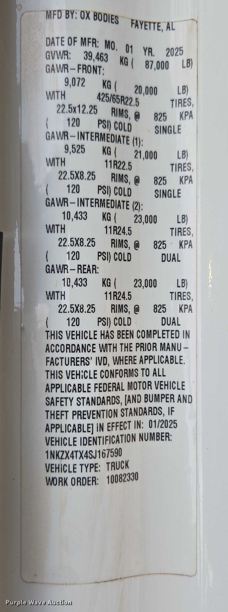 2025 Kenworth T880 dump truck. Miles: 15,088 on odometer, Hours: 506 on meter, VIN: 1NKZX4TX4SJ167590. Engine Cummins X15 500V, Displacement: 15.0L, Cylinders: 6, Fuel type: Diesel, Engine brake. Transmission Allison 4500, Automatic. Chassis Axles: Triple, Pusher axle, Differential lock: Full, Suspension: Spring over walking beam, Brakes: Air, PTO, GVWR: 87,000 lbs FAWR: 20,000 lbs, IAWR: 23,000 lbs, RAWR: 23,000 lbs, Lift axle GAWR: 21,000 lbs. Interior AC, Heat, Heated mirrors, Power windows, Cruise control, Power locks. Features Bed Dump bed, Ox Bodies, Serial: 21/22YD, Length: 16', Width: 98", Capacity: 21 cu.yd., Side height: 60", Bed type: Steel, Bed vibrator, Roll tarp, Ram: Single, End gate: Air operated. Tires Front: 425/65R22.5, Rear: 11R24.5, Lift axle: 11R22.5. Alabama title. Title has a lien that will be released following the close of the auction. Seller is a government entity who will be assigning and distributing the title. Please contact the seller for distribution questions. Title distribution may be delayed up to 30 days from verification of funds. Pickens County, AL. Carrollton, AL 35447
