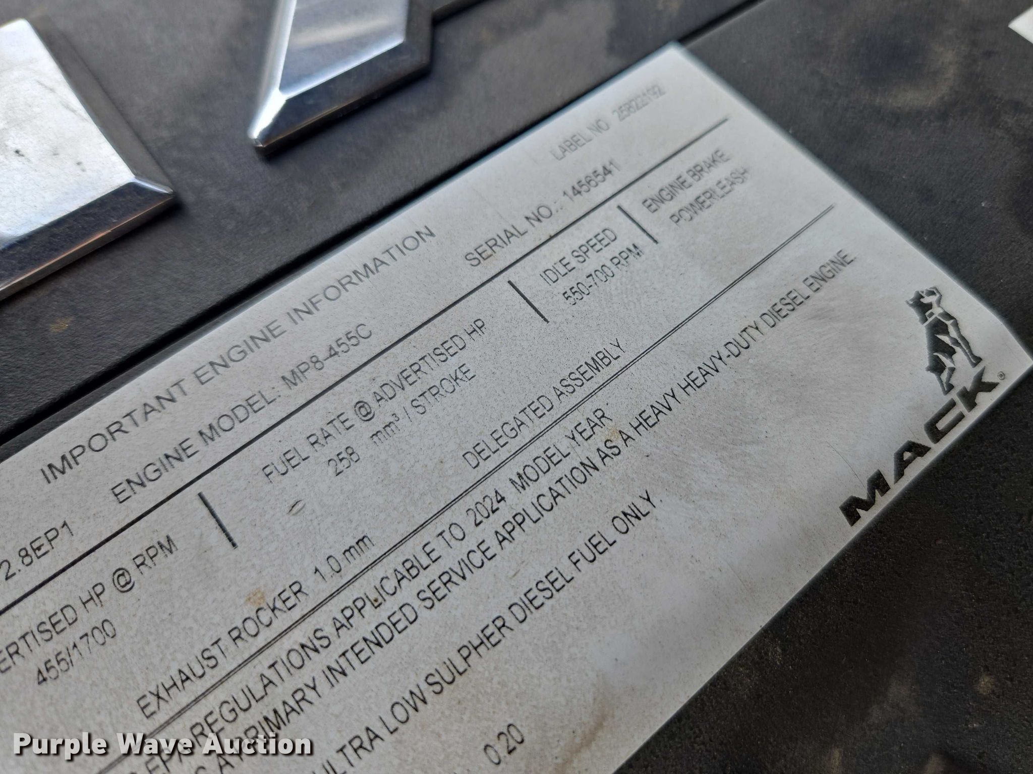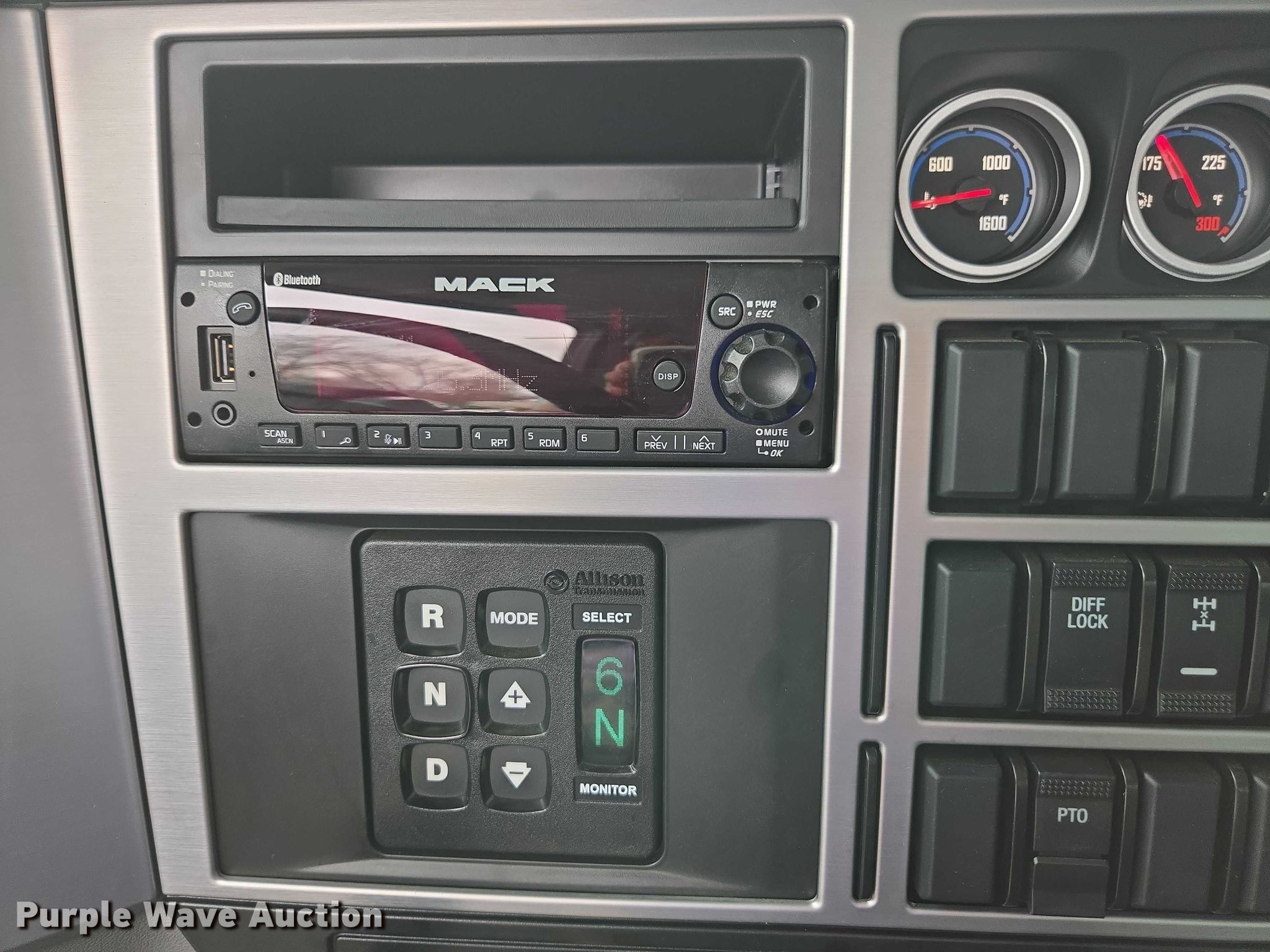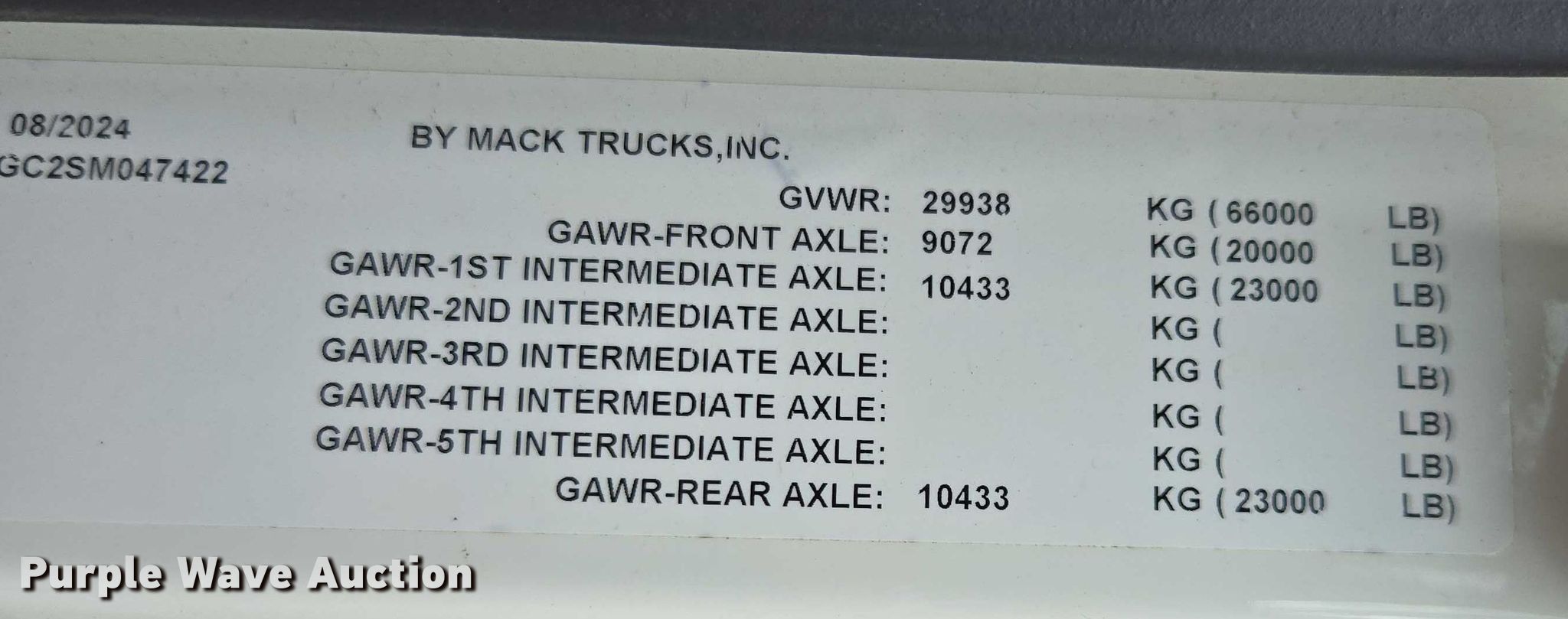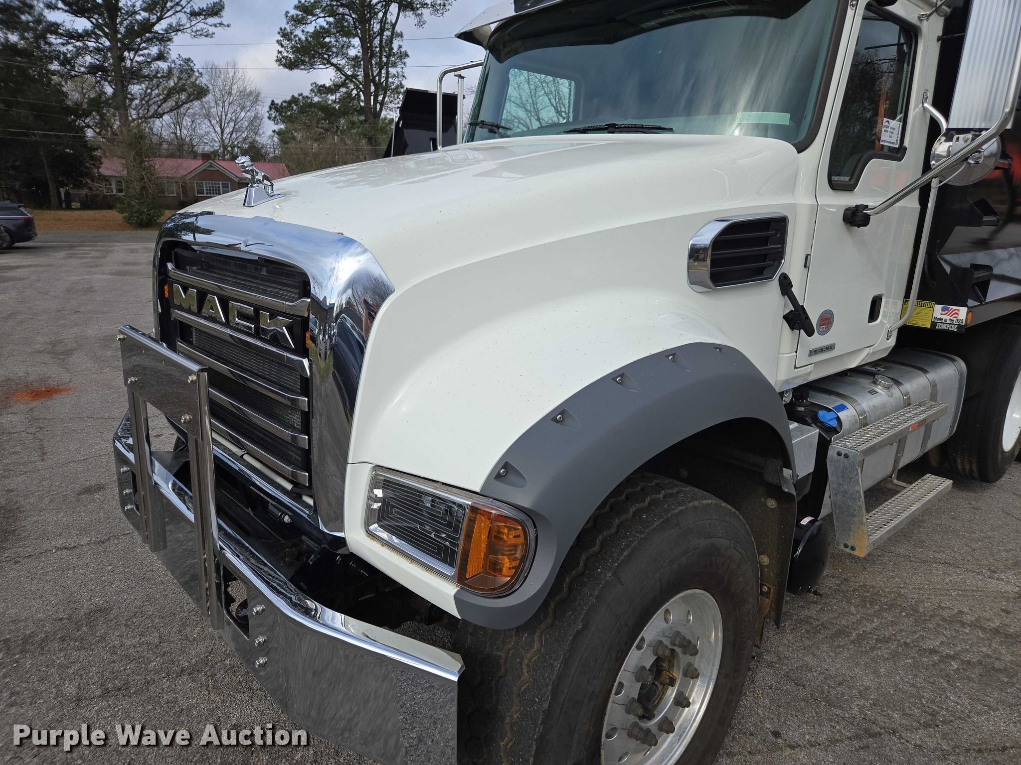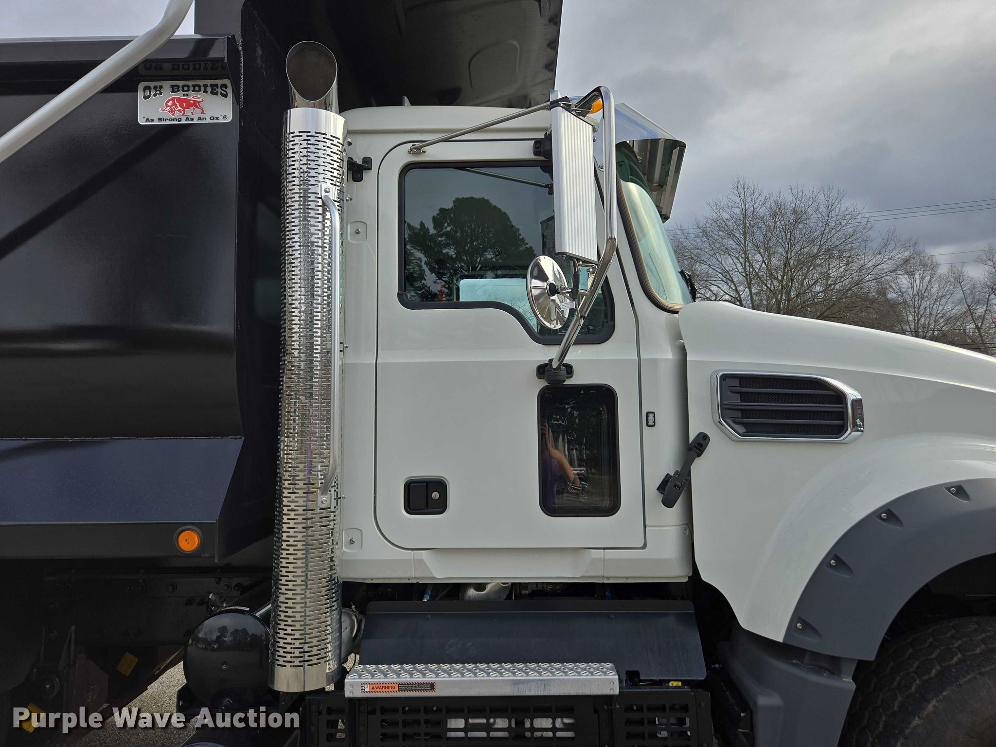 2025 Mack Granite dump truck. Miles: 3,963 on odometer, Hours: 174 on meter, VIN: 1M2GR4GC2SM047422. Engine Mack MP8, Displacement: 12.8L, Cylinders: 6, Fuel type: Diesel, Engine brake. Transmission Allison, Automatic. Chassis Axles: Triple, Pusher axle, Differential lock: Full, Suspension: Camelback, Brakes: Air, PTO, GVWR: 86,000 lbs FAWR: 20,000 lbs, IAWR: 23,000 lbs, RAWR: 23,000 lbs, Lift axle GAWR: 20,000 lbs. Interior AC, Heat, Heated mirrors, Power windows, Cruise control, Power locks. Features Bed Dump bed, Ox Bodies 21/22YD, Length: 16', Width: 98", Side height: 60", Bed type: Steel, Bed vibrator, Roll tarp, Ram: Single, End gate: Air operated. Tires Front: 425/65R22.5, Rear: 11R24.5, Lift axle: 11R22.5. Alabama title. Title distribution may be delayed up to 30 days from verification of funds. Pickens County, AL. Carrollton, AL 35447
