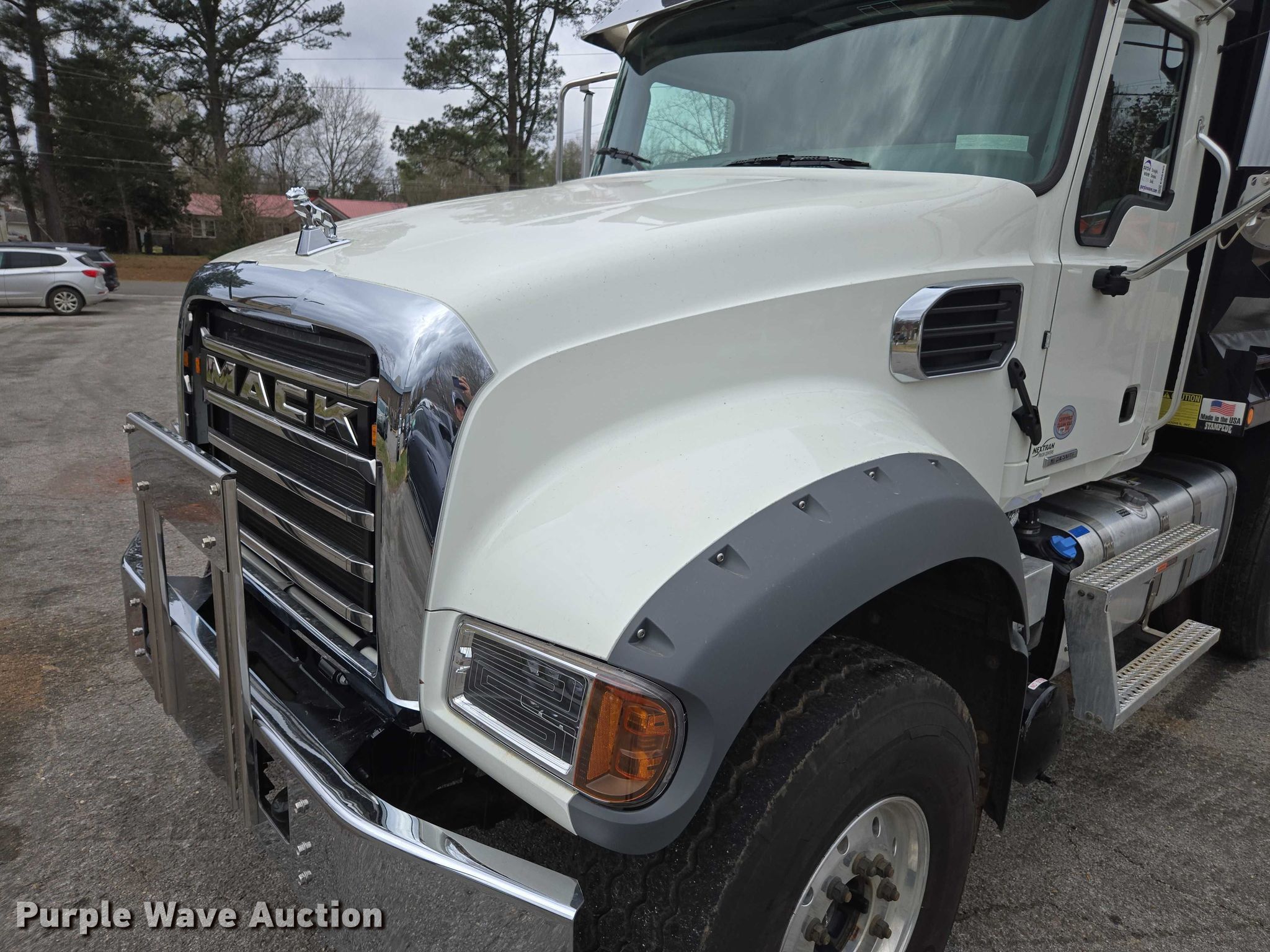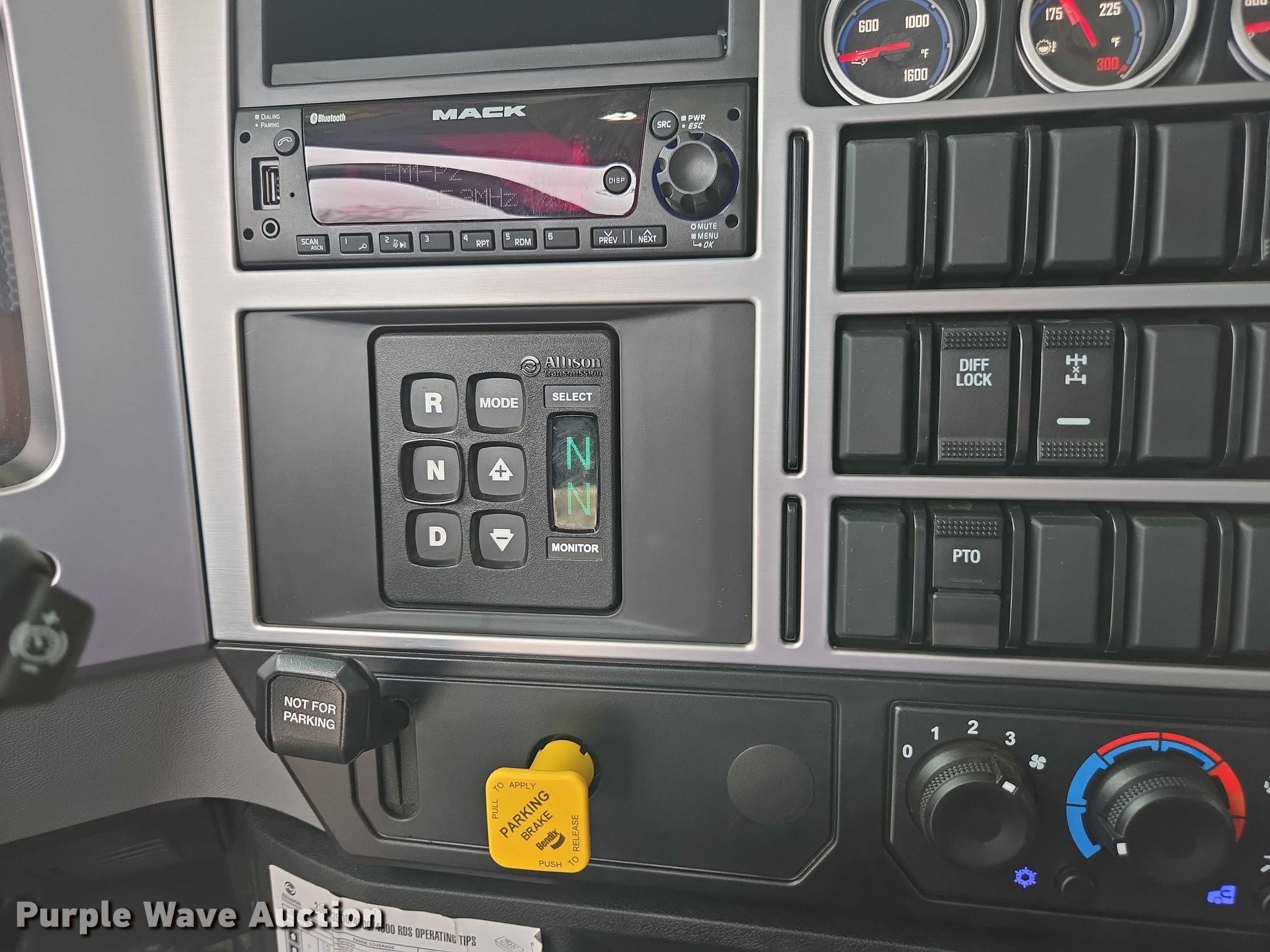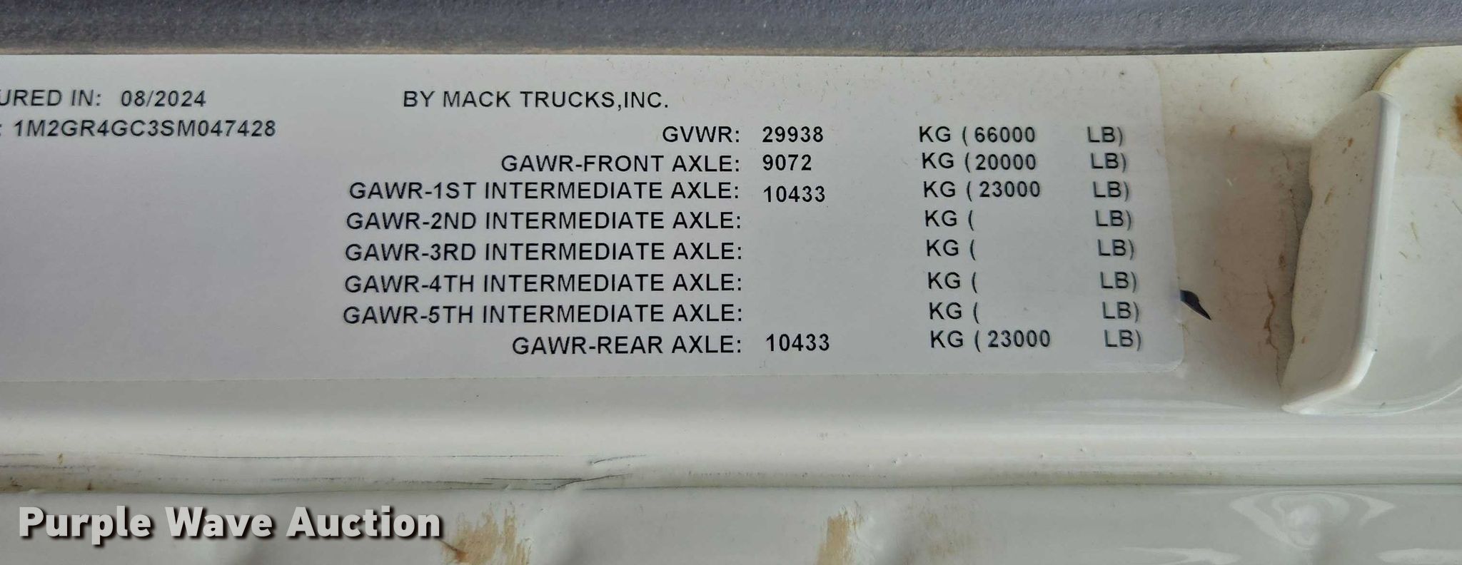2025 Mack Granite dump truck. Miles: 7,641 on odometer, Hours: 356 on meter, VIN: 1M2GR4GC3SM047428. Engine Mack MP8, Displacement: 12.8L, Cylinders: 6, Fuel type: Diesel, Engine brake. Transmission Allison, Automatic. Chassis Axles: Triple, Pusher axle, Differential lock: Full, Suspension: Camelback, Brakes: Air, PTO, GVWR: 86,000 lbs FAWR: 20,000 lbs, IAWR: 23,000 lbs, RAWR: 23,000 lbs, Lift axle GAWR: 20,000 lbs. Interior AC, Heat, Heated mirrors, Power windows, Cruise control, Power locks. Features Bed Dump bed, Ox Bodies 21/22YD, Length: 16', Width: 98", Capacity: 21 cu.yd., Side height: 60", Bed type: Steel, Bed vibrator, Roll tarp, Ram: Single, End gate: Air operated. Tires Front: 425/65R22.5, Rear: 11R24.5, Lift axle: 11R22.5. Alabama title. Title distribution may be delayed up to 30 days from verification of funds. Pickens County, AL. Carrollton, AL 35447