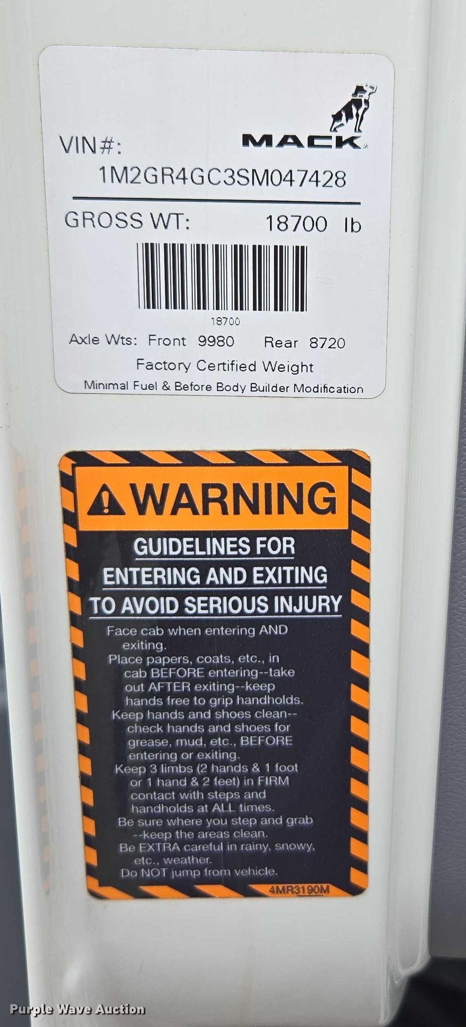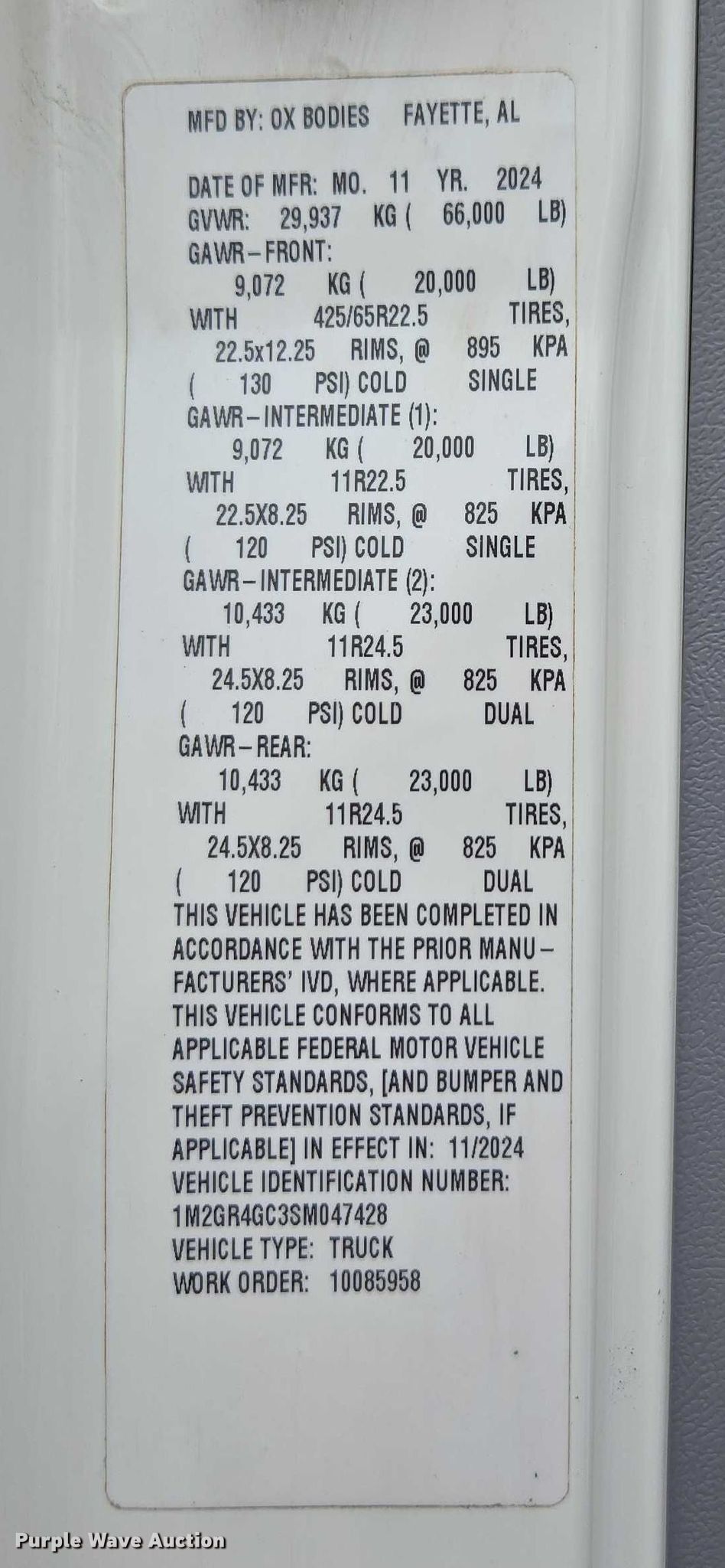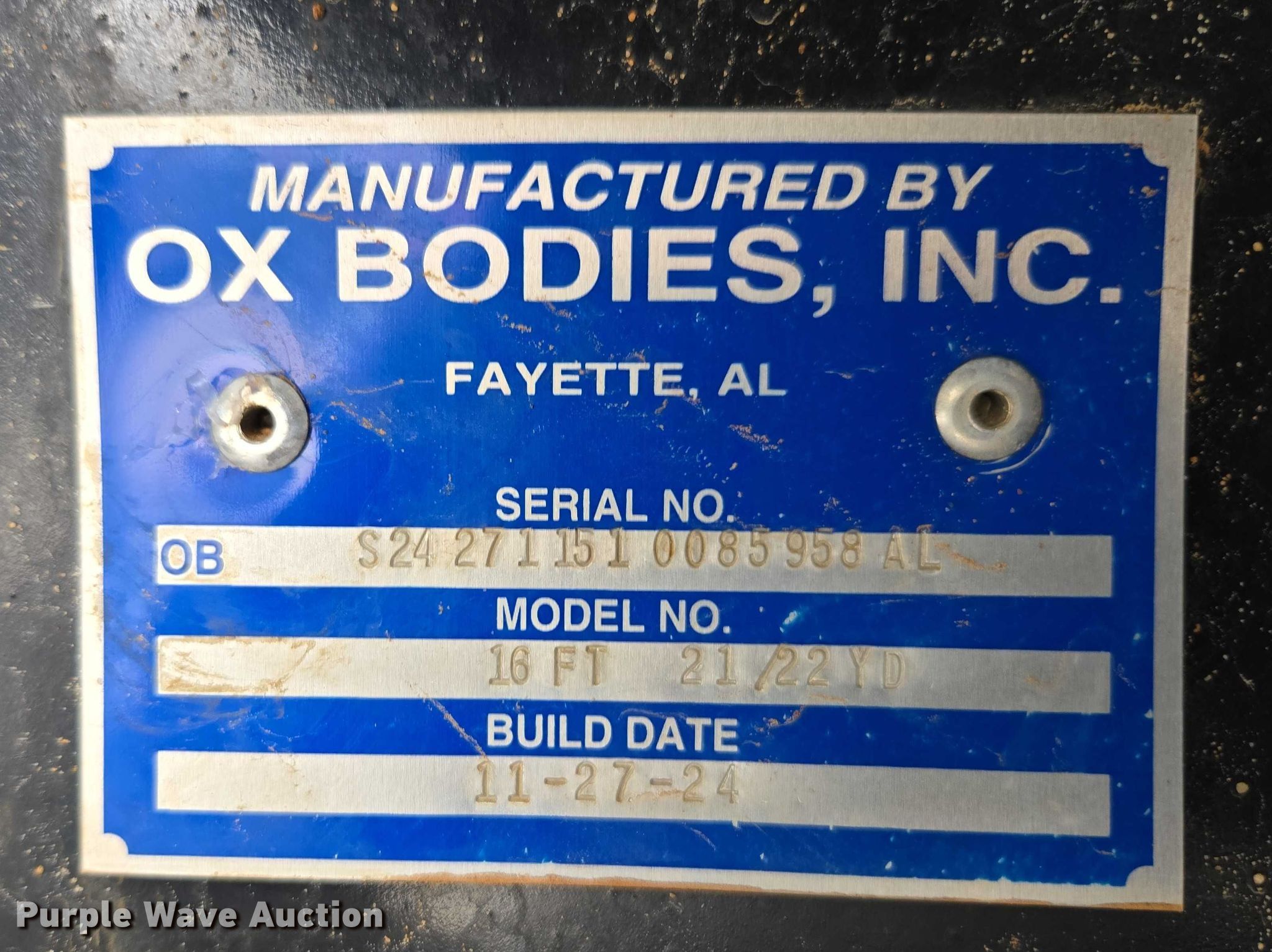 2025 Mack Granite dump truck. Miles: 7,641 on odometer, Hours: 356 on meter, VIN: 1M2GR4GC3SM047428. Engine Mack MP8, Displacement: 12.8L, Cylinders: 6, Fuel type: Diesel, Engine brake. Transmission Allison, Automatic. Chassis Axles: Triple, Pusher axle, Differential lock: Full, Suspension: Camelback, Brakes: Air, PTO, GVWR: 86,000 lbs FAWR: 20,000 lbs, IAWR: 23,000 lbs, RAWR: 23,000 lbs, Lift axle GAWR: 20,000 lbs. Interior AC, Heat, Heated mirrors, Power windows, Cruise control, Power locks. Features Bed Dump bed, Ox Bodies 21/22YD, Length: 16', Width: 98", Capacity: 21 cu.yd., Side height: 60", Bed type: Steel, Bed vibrator, Roll tarp, Ram: Single, End gate: Air operated. Tires Front: 425/65R22.5, Rear: 11R24.5, Lift axle: 11R22.5. Alabama title. Title distribution may be delayed up to 30 days from verification of funds. Pickens County, AL. Carrollton, AL 35447