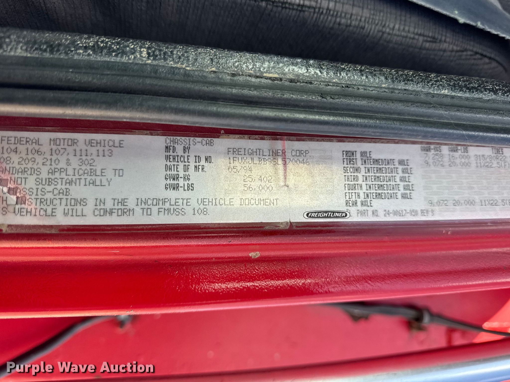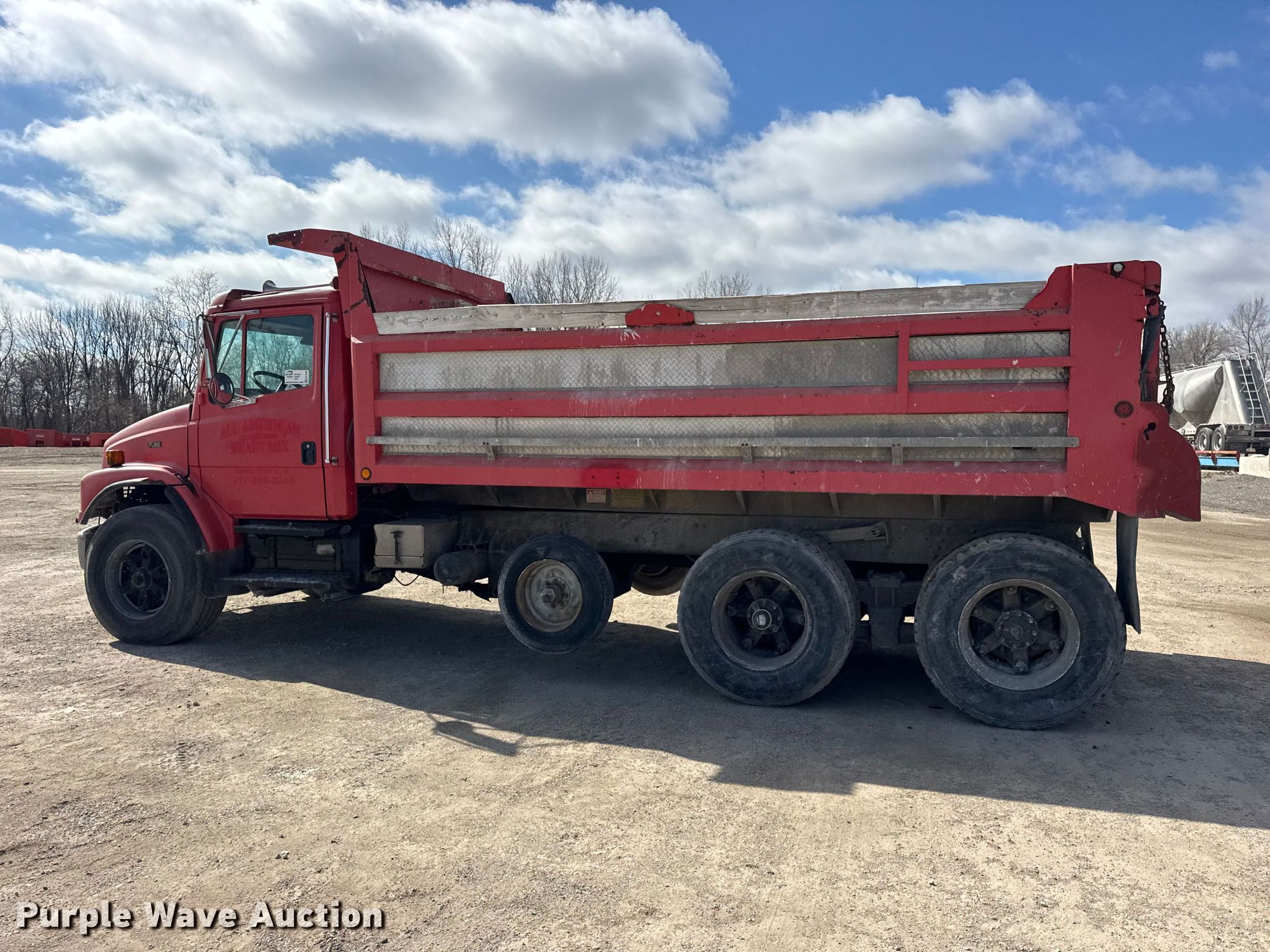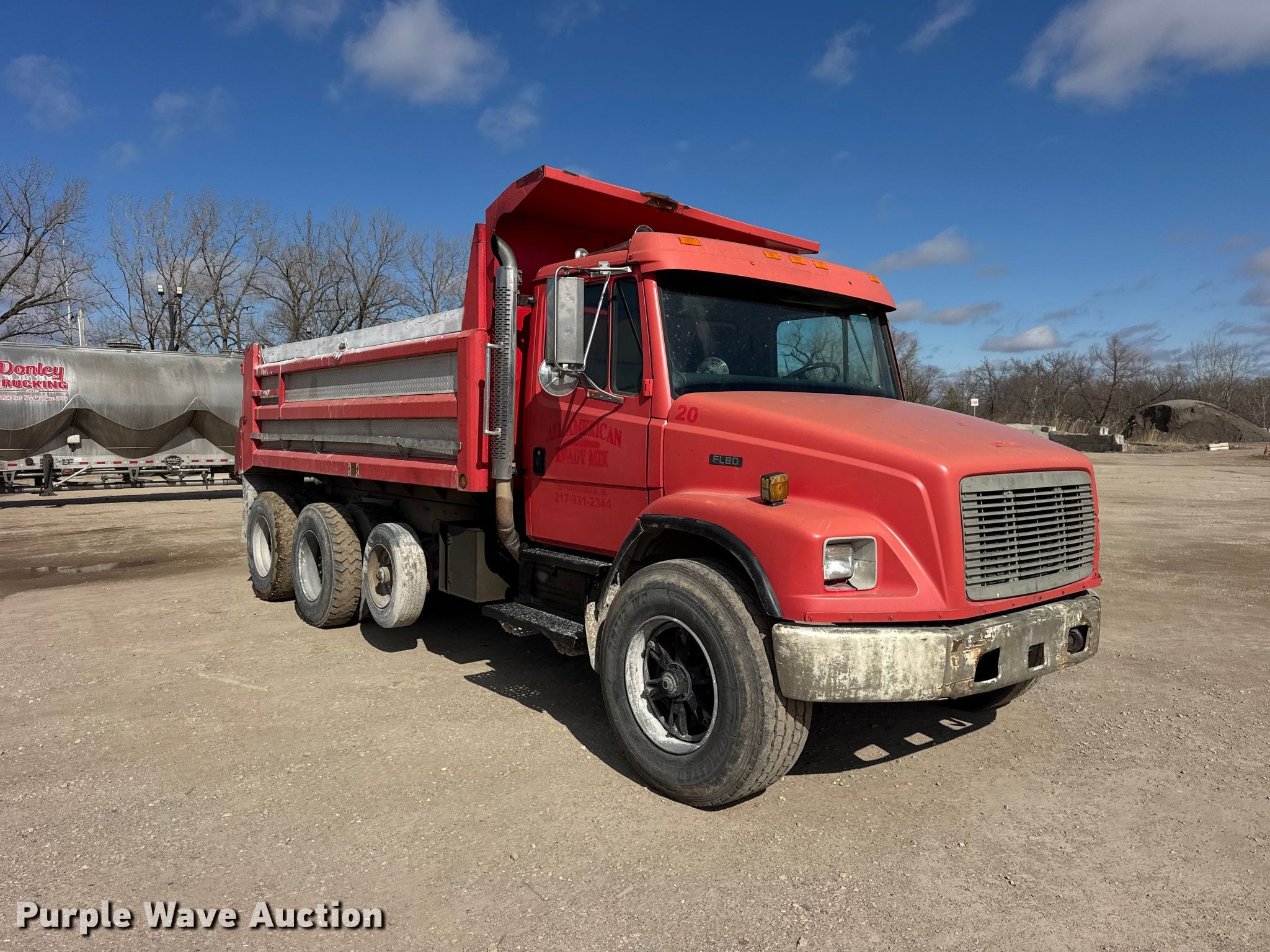 1995 Freightliner FL80 dump truck. Miles: 60,258 on odometer, VIN: 1FVXJLBB9SL570046. Engine Cummins C8.3-250, Serial: 45173915, Displacement: 8.3L, Cylinders: 6, Fuel type: Diesel. Transmission Eaton Fuller, Manual. Chassis Axles: Triple, Pusher axle, Differential lock: Inter-axle, Suspension: Spring over walking beam, Brakes: Air, PTO, GVWR: 56,000 lbs FAWR: 16,000 lbs, IAWR: 20,000 lbs, RAWR: 20,000 lbs. Interior AC, Heat. Features Bed Dump bed, Length: 15' 6", Width: 96", Side height: 38", Side board height: 6", Bed type: Steel, Ram: Single, End gate: Air operated. Tires Front: 385/65R22.5, Rear: 11R22.5, Lift axle: 215/75R17.5. Notes Dash warning indicator: Engine coolant temperature, Oil pressure, Windshield chipped or cracked, AC belt missing, Non-operational pusher axle. Illinois title. Title distribution may be delayed up to 14 days from verification of funds. All American Ready Mix. Springfield, IL 62702