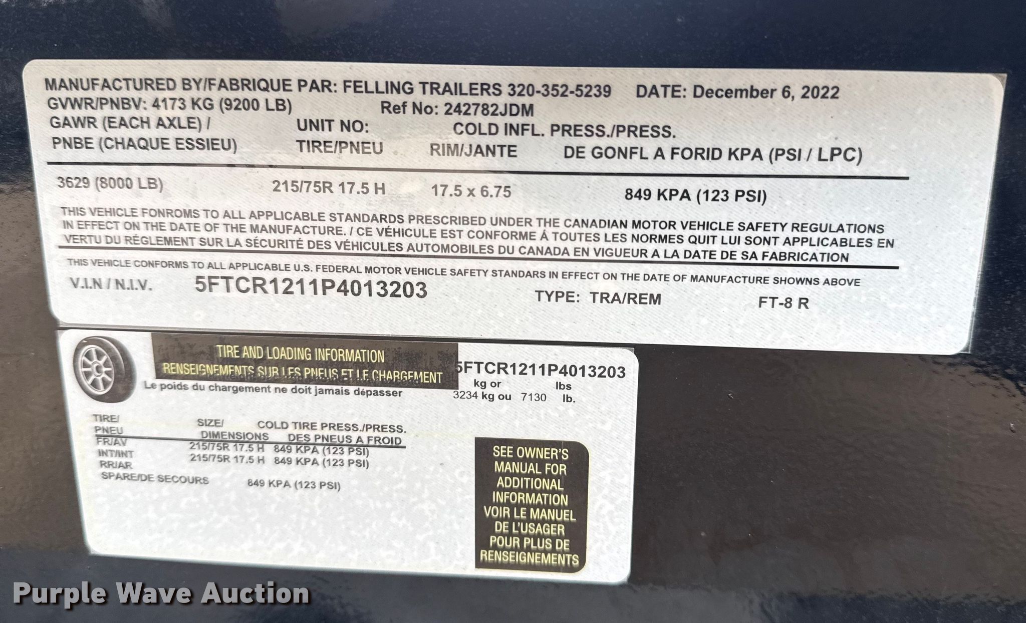 2023 Felling Trailers Felling Trailers reel trailer. VIN: 5FTCR1211P4013203. Dimensions Overall Length: 12', Width: 99". Features Reel: Single, Maximum reel width: 66", Maximum reel diameter: 80", Hydraulic height adjustment. Chassis Hitch: Pintle, Landing gear: Single, GVWR: 9,200 lbs, GAWR: 8,000 lbs. Tires Size: 315/75R17.5. Notes Spare tire included. Oklahoma title. Seller is an Oklahoma licensed motor vehicle dealer. Buyers may be required to provide identification to the licensed dealer to comply with state laws. Title will be assigned and distributed by the dealer. Please contact the seller for distribution questions. Title distribution may be delayed up to 30 days from verification of funds. Collinsville, OK 74021