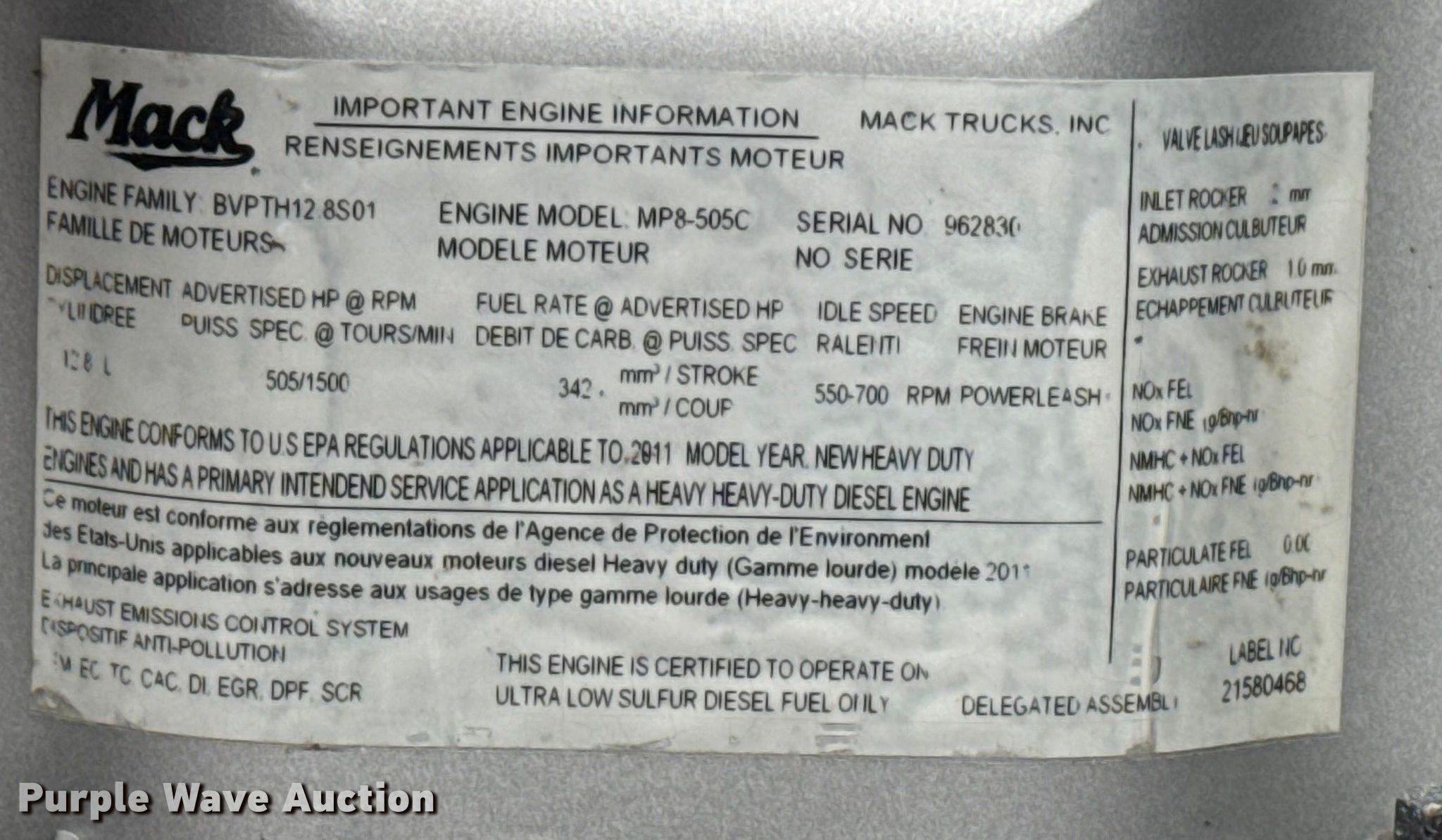 2012 Mack GU713 vacuum truck. Miles: 578,349 on odometer, VIN: 1M2AX07CXCM012214. Engine Mack MP8, Serial: 962830, Displacement: 12.8L, Cylinders: 6, Fuel type: Diesel, HP: 505. Transmission Eaton Fuller, Manual, Speed: 18. Chassis Axles: Triple, Pusher axle, Differential lock: Inter-axle, Suspension: Air Dump valves, Brakes: Air, PTO, GVWR: 64,000 lbs. Interior AC, Heat, Heated mirrors, Cruise control. Features Bed Tank bed, Tremcar TRU/CAM, Serial: 9256, Length: 18' 4", Width: 99", Capacity: 3,800 gallons, Top hatches: 2, Rear outlet: 7", Vacuum pump Fruitland. Tires Front: 425/65R22.5, Rear: 11R24.5, Pusher: 425/65R22.5. Oklahoma title. Seller is an Oklahoma licensed motor vehicle dealer. Buyers may be required to provide identification to the licensed dealer to comply with state laws. Title will be assigned and distributed by the dealer. Please contact the seller for distribution questions. Title distribution may be delayed up to 30 days from verification of funds. Collinsville, OK 74021