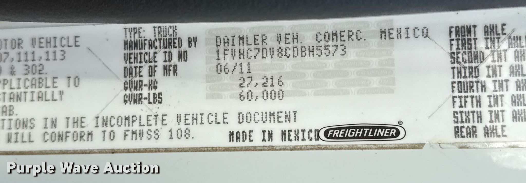 Purple Wave is selling a used Crane Truck in Oklahoma. This item is a 2012 Freightliner Business Class M2 crane truck with the following: Miles: 157,346 on odometer, Hours: 12,905 on meter, VIN: 1FVHC7DV8CDBH5573