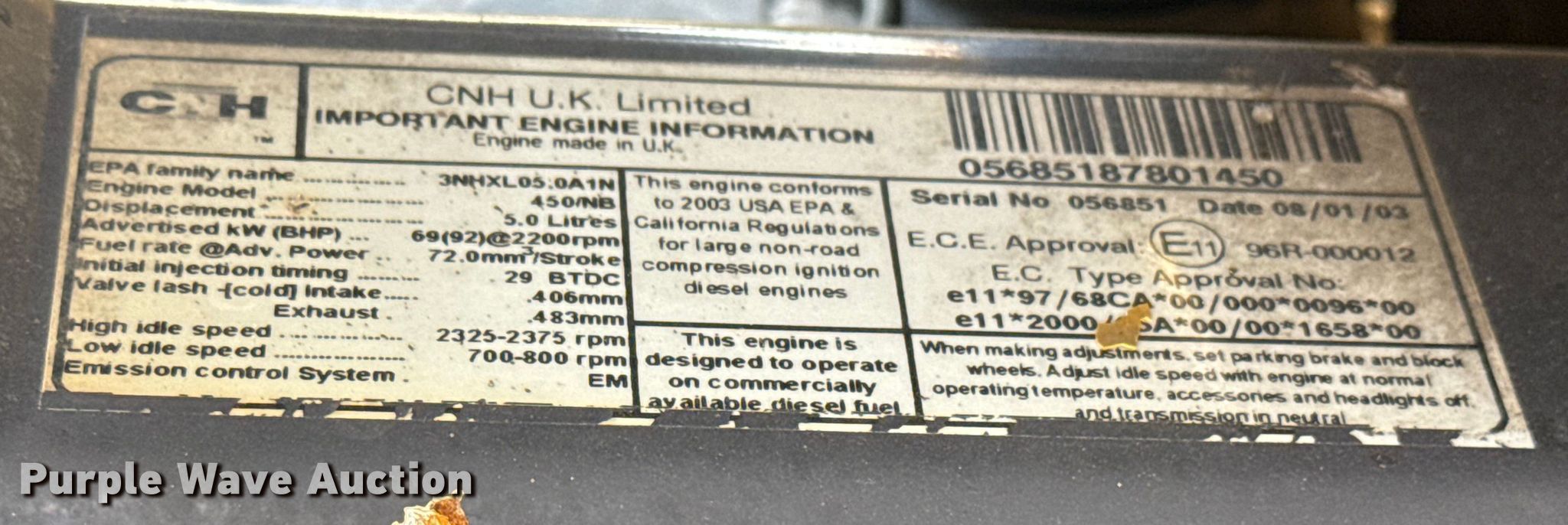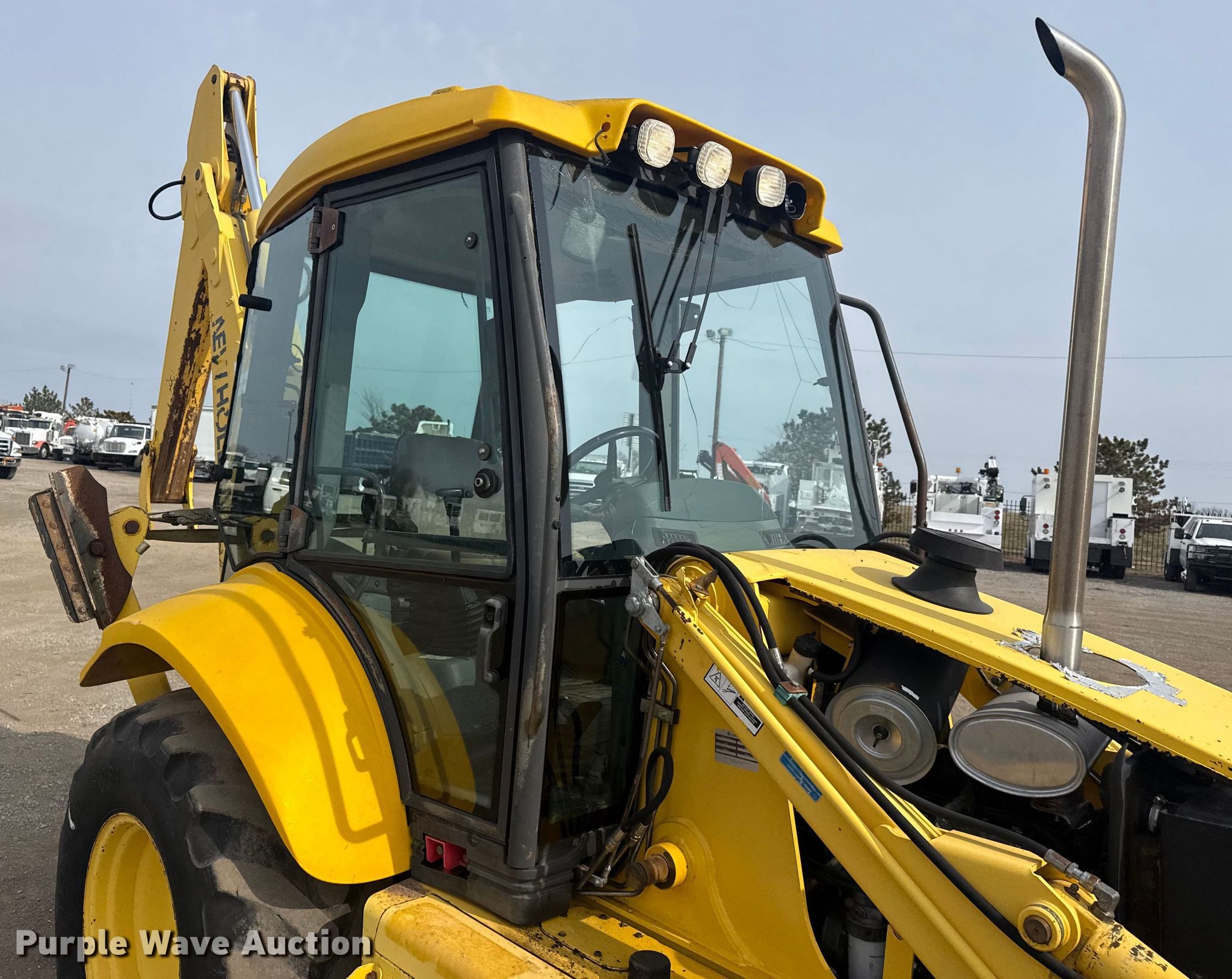New Holland LB75B backhoe. Hours: 9,794 on meter, Serial: 031044130. Engine CNH 450NES, Displacement: 5.0L, Cylinders: 4, Fuel type: Diesel. Transmission Shuttle shift, 4F - 4R. Chassis Four wheel drive, Differential lock. Operators station Enclosed cab, Heat, Backhoe controls: Wobble stick / two stick. Features Loader Bucket Width: 88", Cutting edge: Bolt-on.. Tires Front: 12x16.5 NHS, Rear: 19.5L-25. Notes Glass cracked, Glass missing, Hydraulic loader arm cylinder missing, Hydraulic cylinder outriggers missing. Collinsville, OK 74021