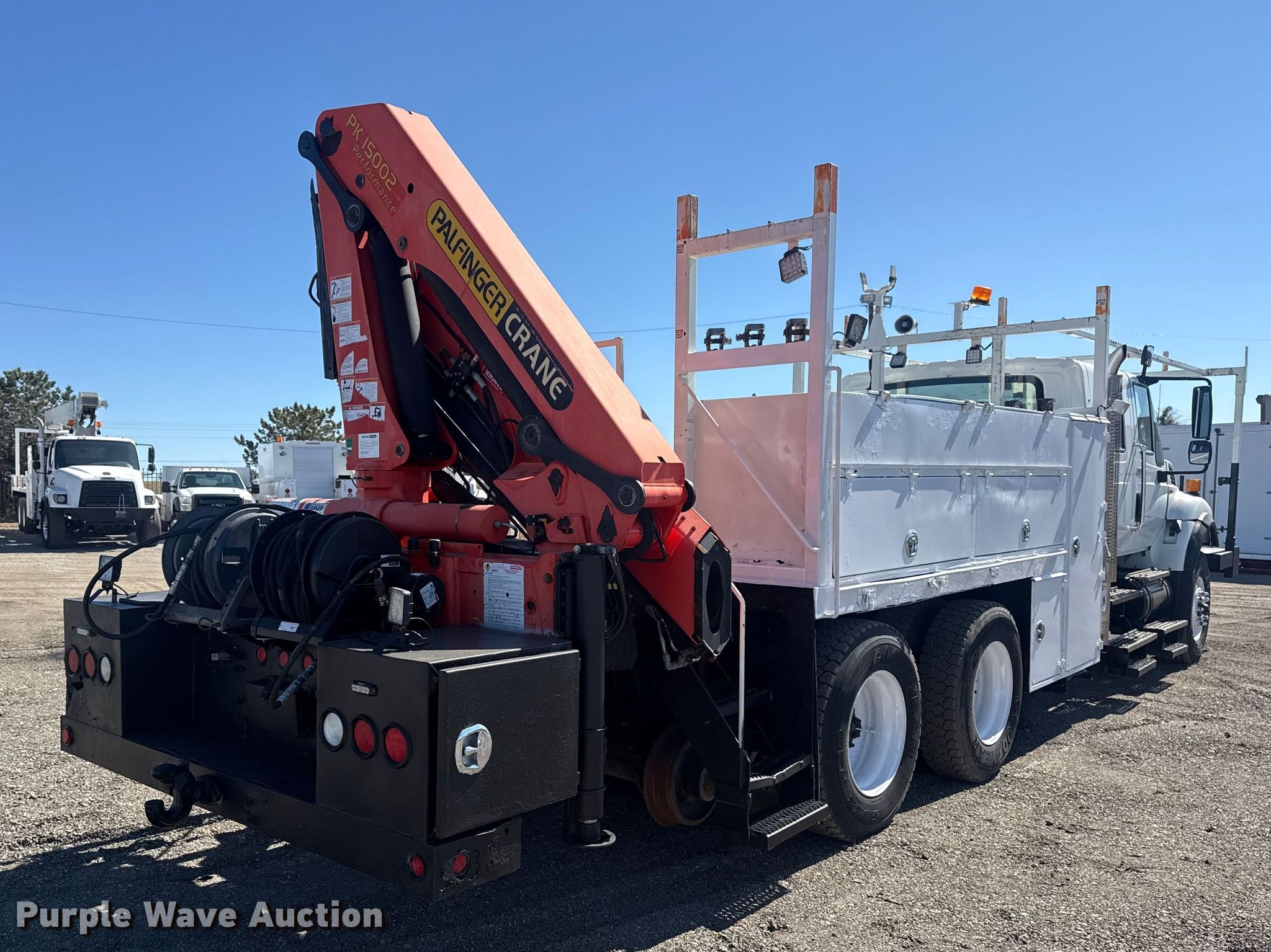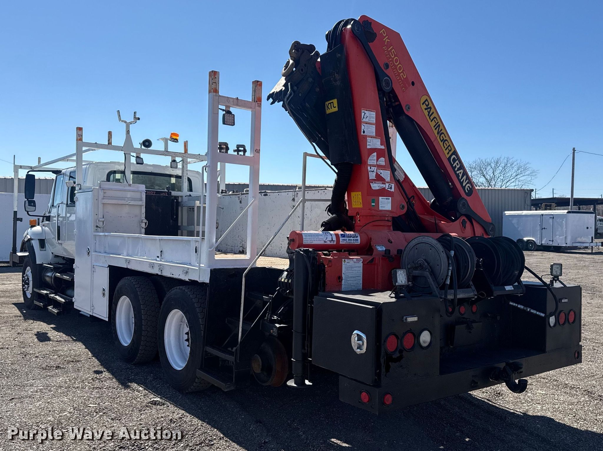 2010 International 7500 crane truck. Miles: 223,264 on odometer, Hours: 20,274 on meter, VIN: 1HTWNAZTXAJ242680. Engine Displacement: 9.3L, Cylinders: 6, Fuel type: Diesel, Engine brake. Transmission Eaton Fuller 8LL, Manual, Speed: 10. Chassis Hi-rail system, Axles: Tandem, Differential lock: Inter-axle, Suspension: Air, Brakes: Air, PTO, GVWR: 56,000 lbs FAWR: 16,000 lbs, IAWR: 20,000 lbs, RAWR: 20,000 lbs. Interior AC, Heat, Heated mirrors, Cruise control, Brake controller. Features Bed Flatbed, Length: 15', Width: 96", Crane 2009 Palfinger PK15002 Serial: 100105776, Boom Telescopic, Knuckle, Maximum boom length: 33' Sections: 3, Maximum lift capacity: 13,670 lbs, Boom controls Ground, Remote control.. Tires Front: 315/80R22.5, Rear: 11R22.5. Notes Windshield chipped or cracked. Oklahoma title. Seller is an Oklahoma licensed motor vehicle dealer. Buyers may be required to provide identification to the licensed dealer to comply with state laws. Title will be assigned and distributed by the dealer. Please contact the seller for distribution questions. Title distribution may be delayed up to 30 days from verification of funds. Collinsville, OK 74021