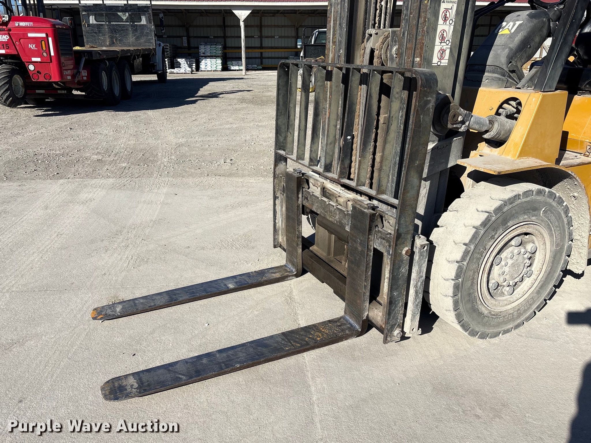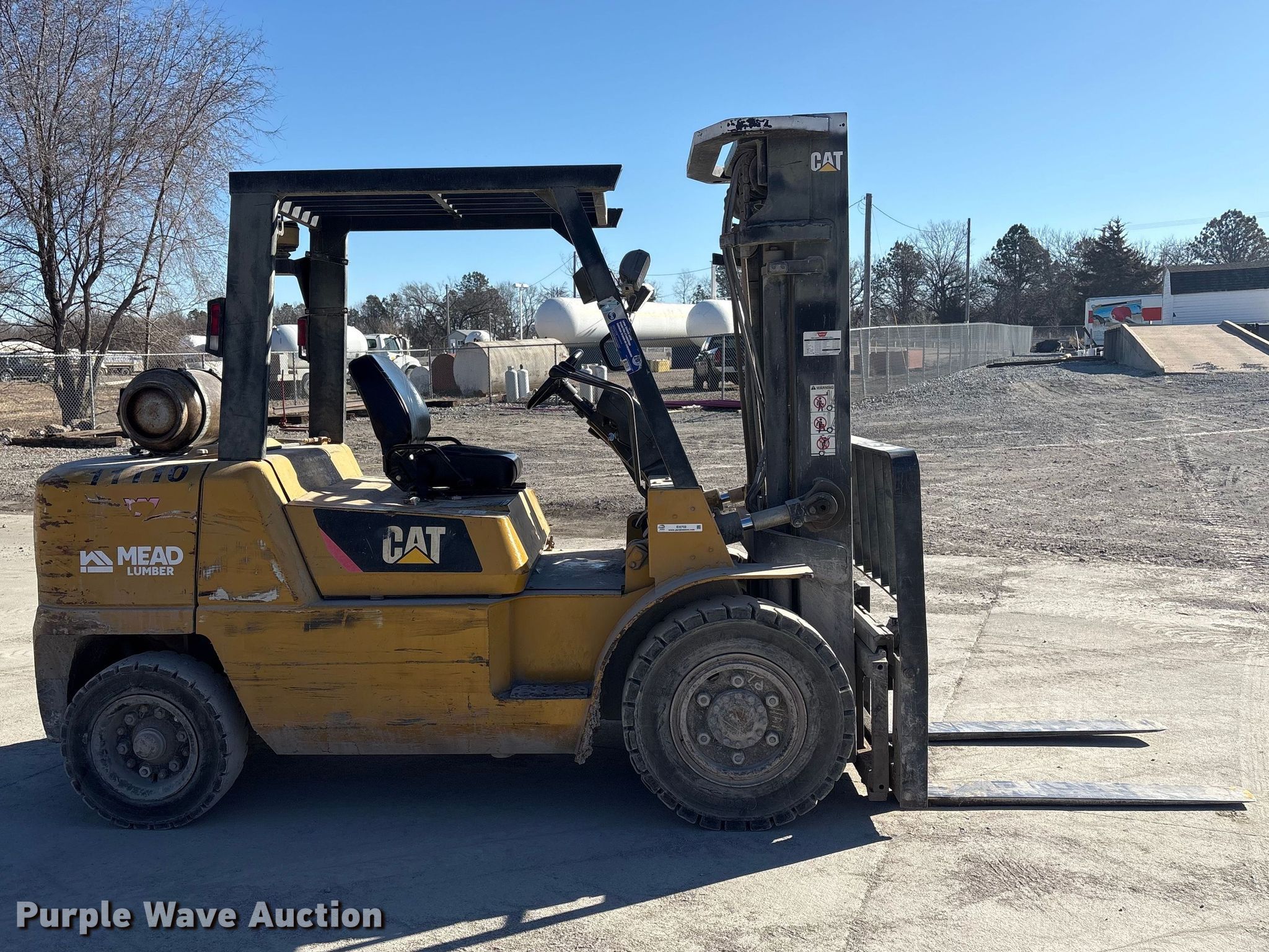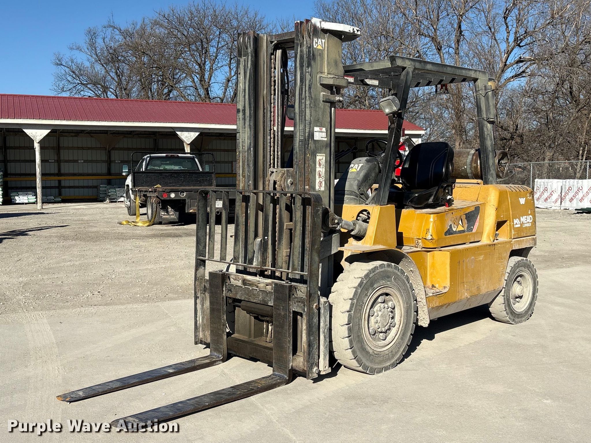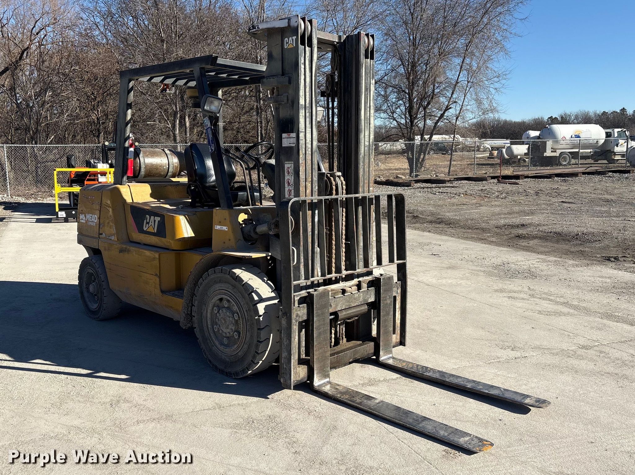 Caterpillar GP45K1 forklift. Hours: 7,431 on meter, Serial: AT29C80204. Engine Nissan TB45D, Displacement: 4.5L, Cylinders: 6, Fuel type: Gas, LPG, Dual fuel LP bottle: Not included. Transmission Automatic. Operators station Canopy. Features Maximum lift capacity: 9,800 lbs, Maximum lift height: 188", Collapsed mast height: 94", Mast stages: 3, Side shift, Mast tilt, Fork length: 47". Tires Front: 8.25-15, Rear: 7.00-12, Solid. Notes Clevis not included. Mead Lumber of Beatrice. Beatrice, NE 68310