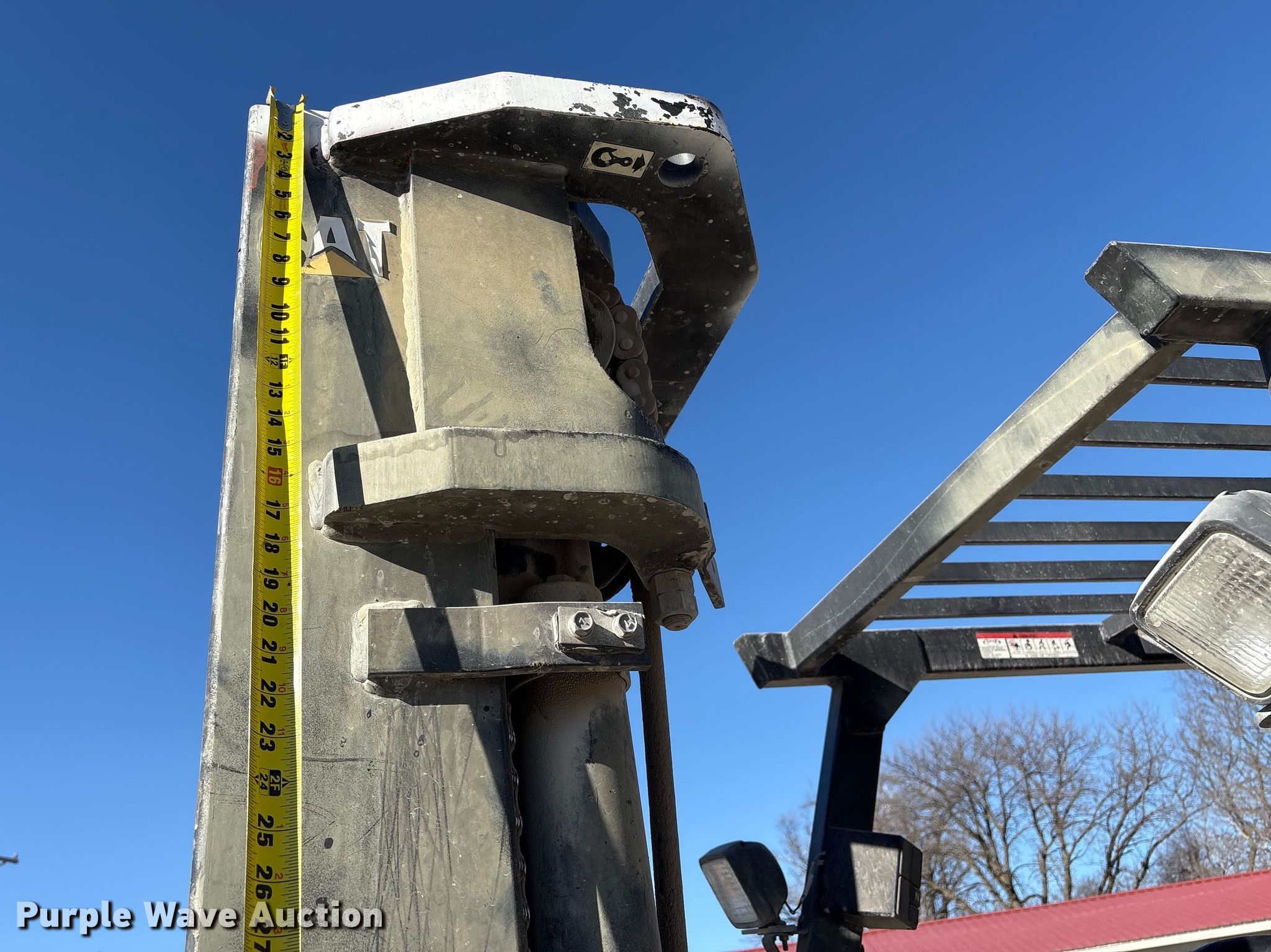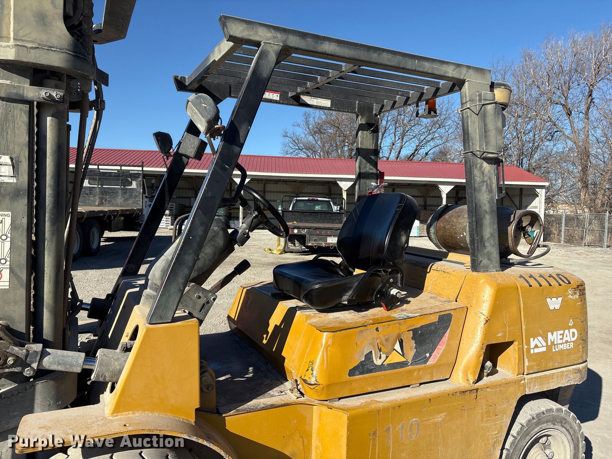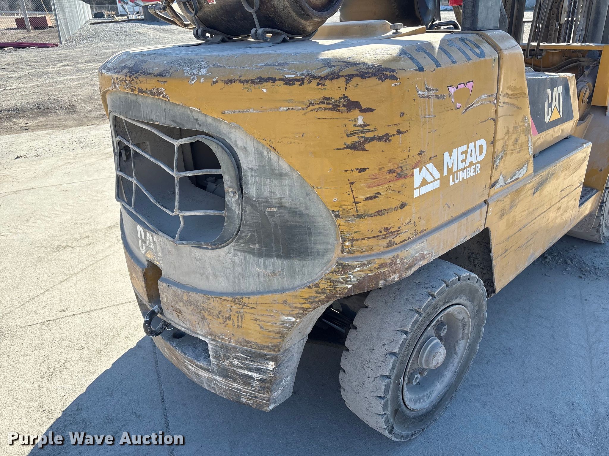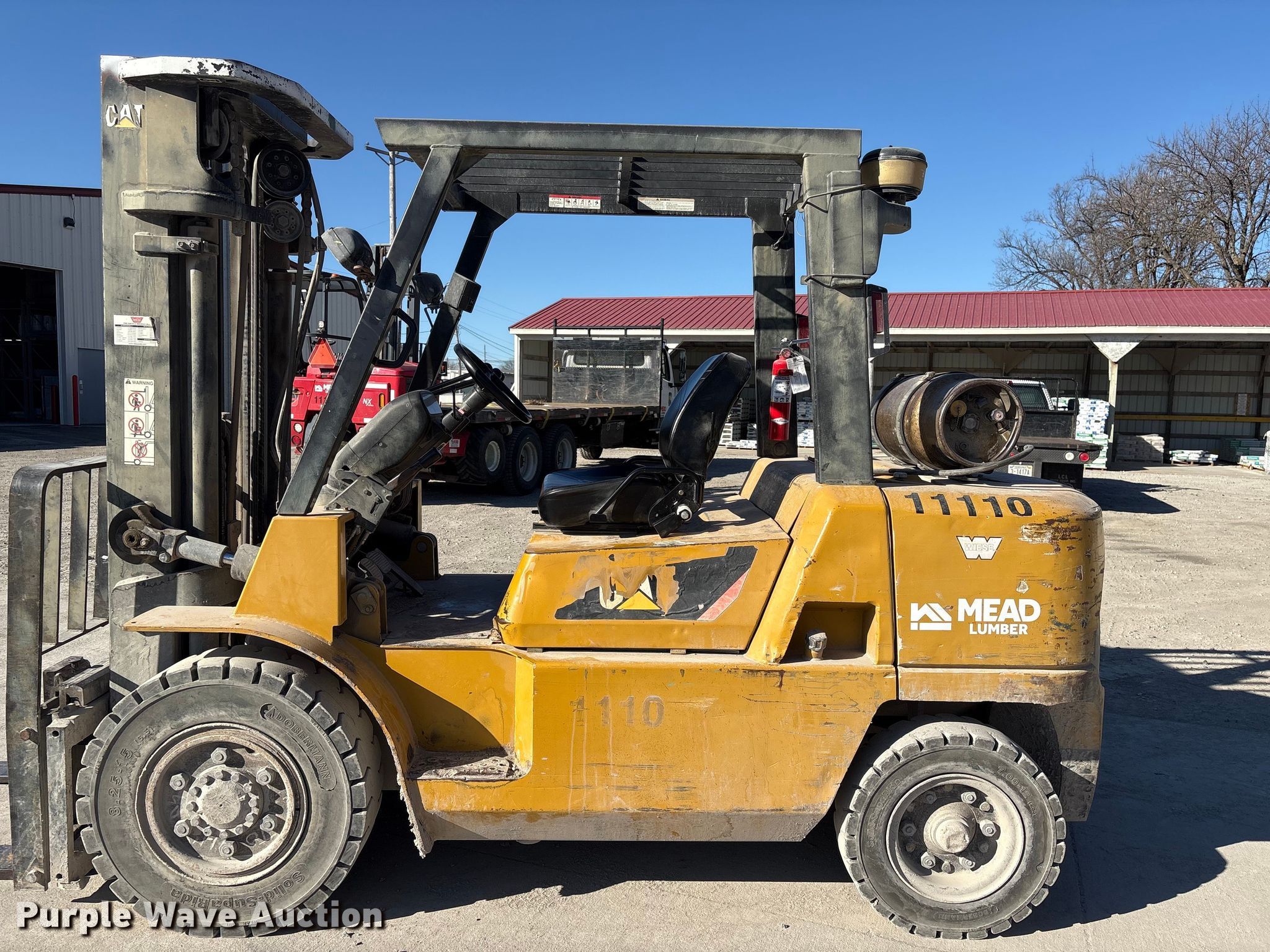 Caterpillar GP45K1 forklift. Hours: 7,431 on meter, Serial: AT29C80204. Engine Nissan TB45D, Displacement: 4.5L, Cylinders: 6, Fuel type: Gas, LPG, Dual fuel LP bottle: Not included. Transmission Automatic. Operators station Canopy. Features Maximum lift capacity: 9,800 lbs, Maximum lift height: 188", Collapsed mast height: 94", Mast stages: 3, Side shift, Mast tilt, Fork length: 47". Tires Front: 8.25-15, Rear: 7.00-12, Solid. Notes Clevis not included. Mead Lumber of Beatrice. Beatrice, NE 68310
