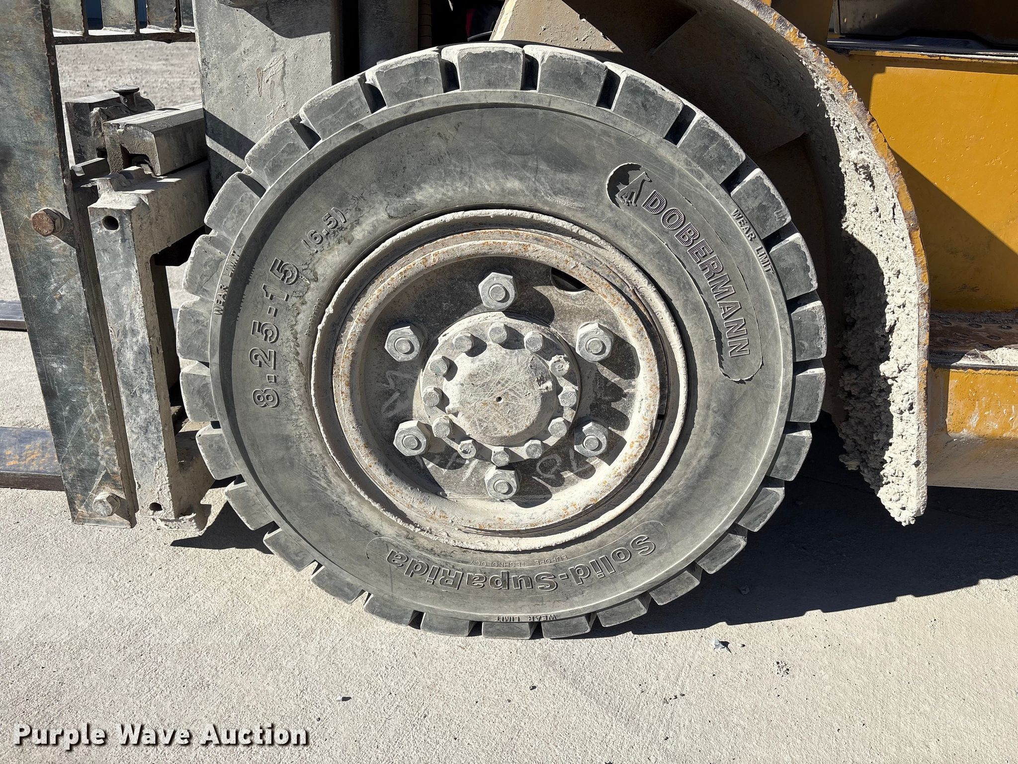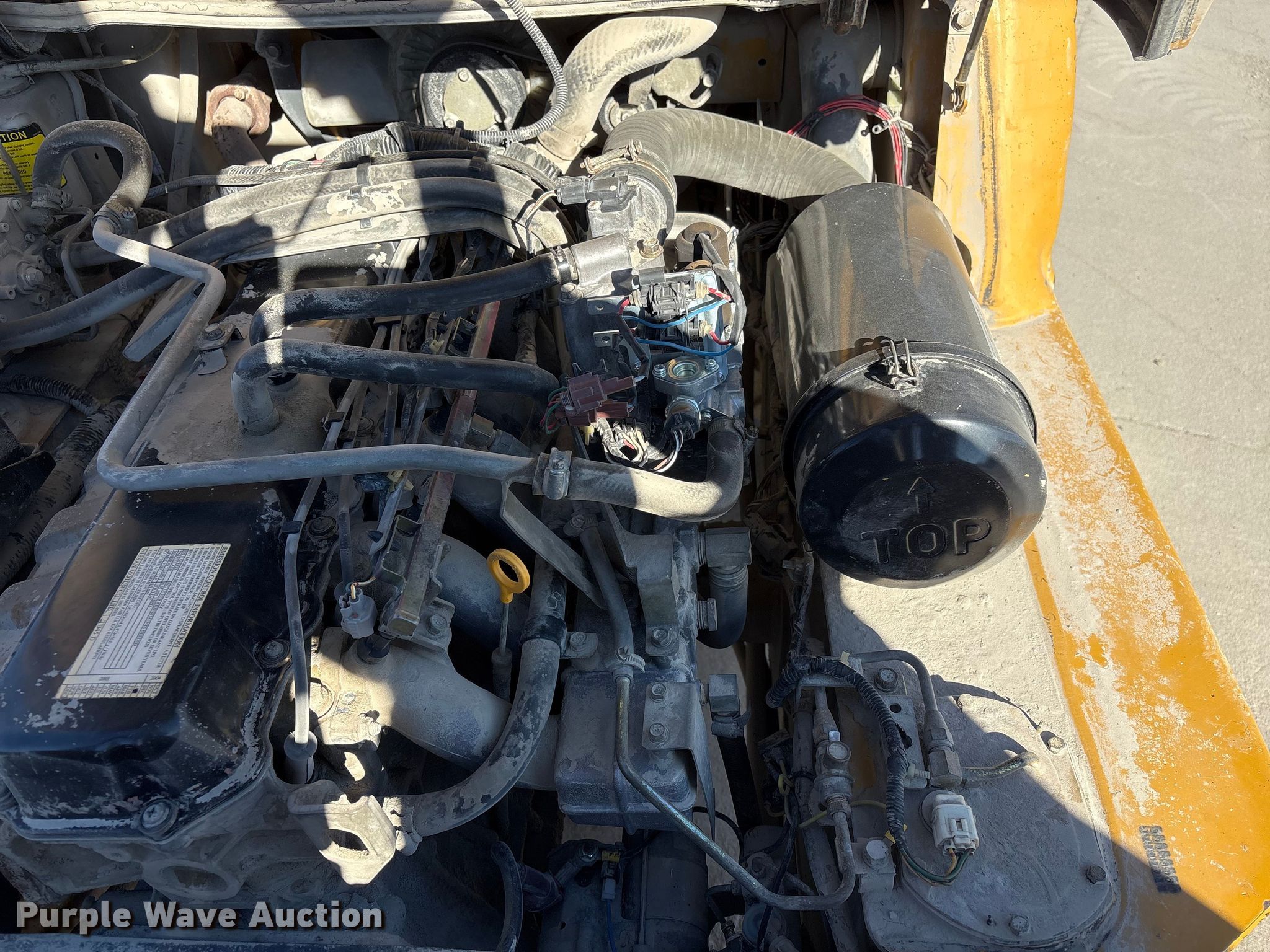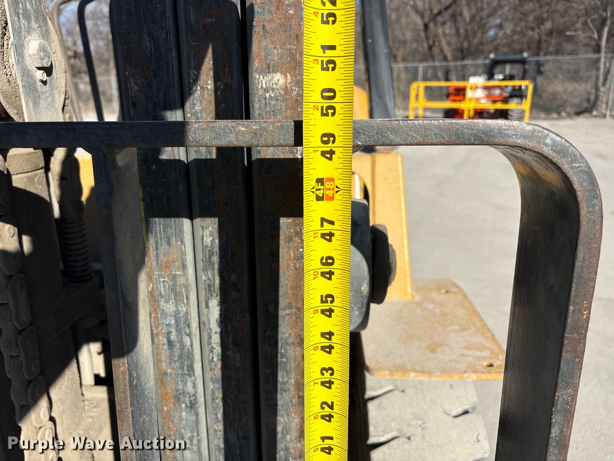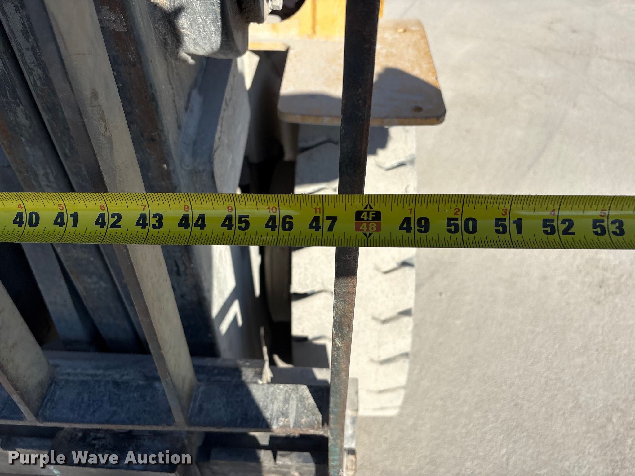 Caterpillar GP45K1 forklift. Hours: 7,431 on meter, Serial: AT29C80204. Engine Nissan TB45D, Displacement: 4.5L, Cylinders: 6, Fuel type: Gas, LPG, Dual fuel LP bottle: Not included. Transmission Automatic. Operators station Canopy. Features Maximum lift capacity: 9,800 lbs, Maximum lift height: 188", Collapsed mast height: 94", Mast stages: 3, Side shift, Mast tilt, Fork length: 47". Tires Front: 8.25-15, Rear: 7.00-12, Solid. Notes Clevis not included. Mead Lumber of Beatrice. Beatrice, NE 68310