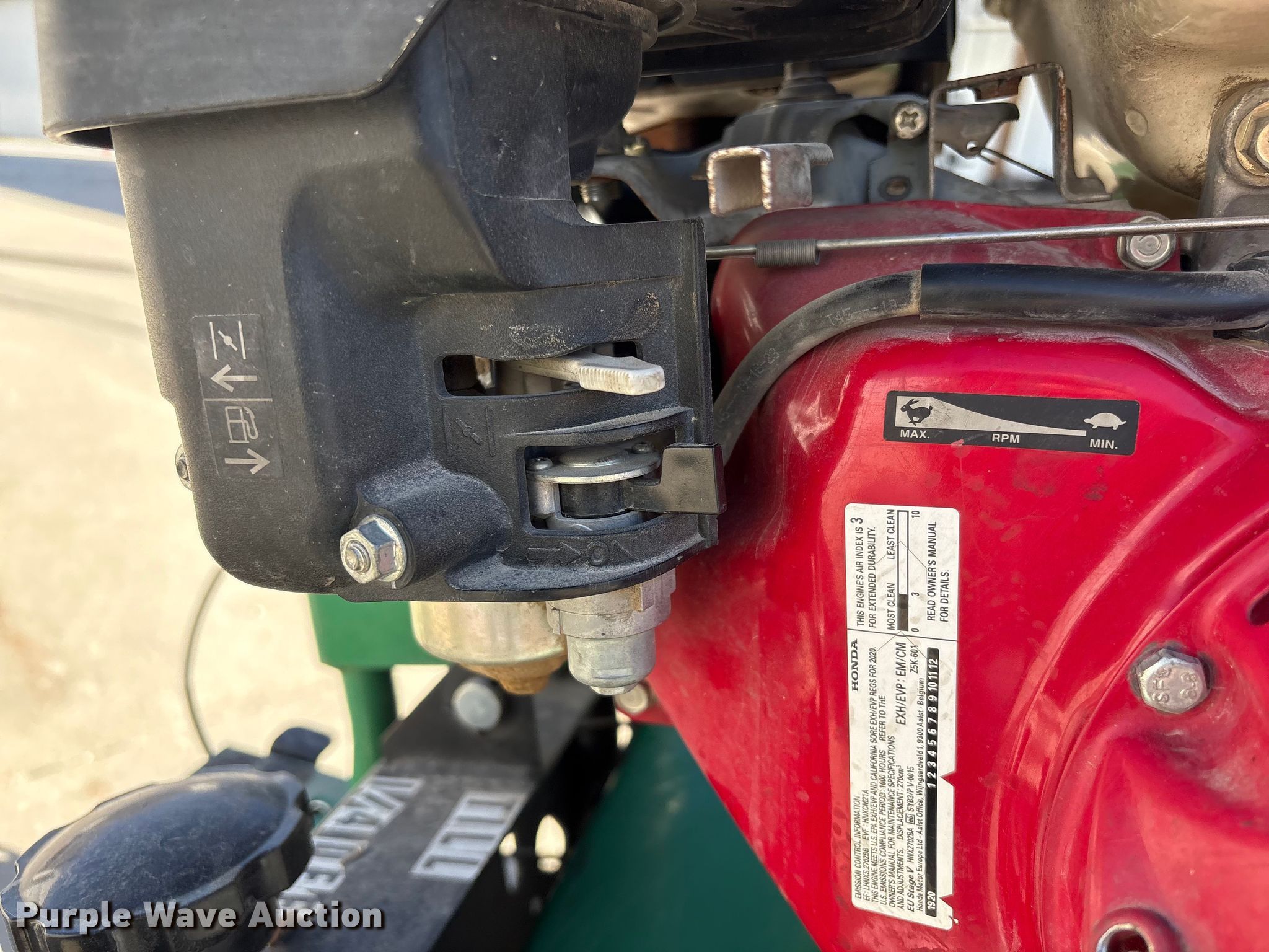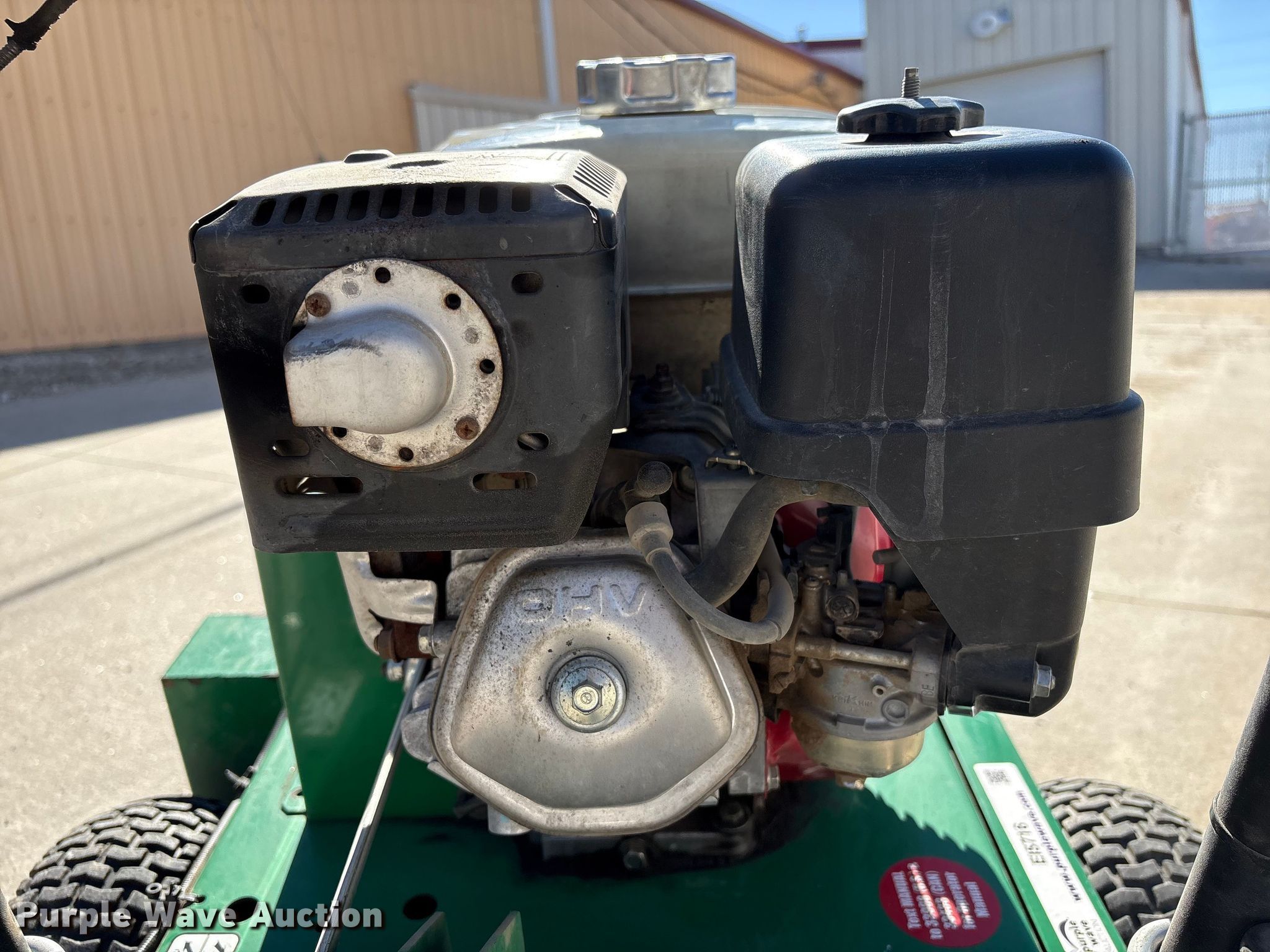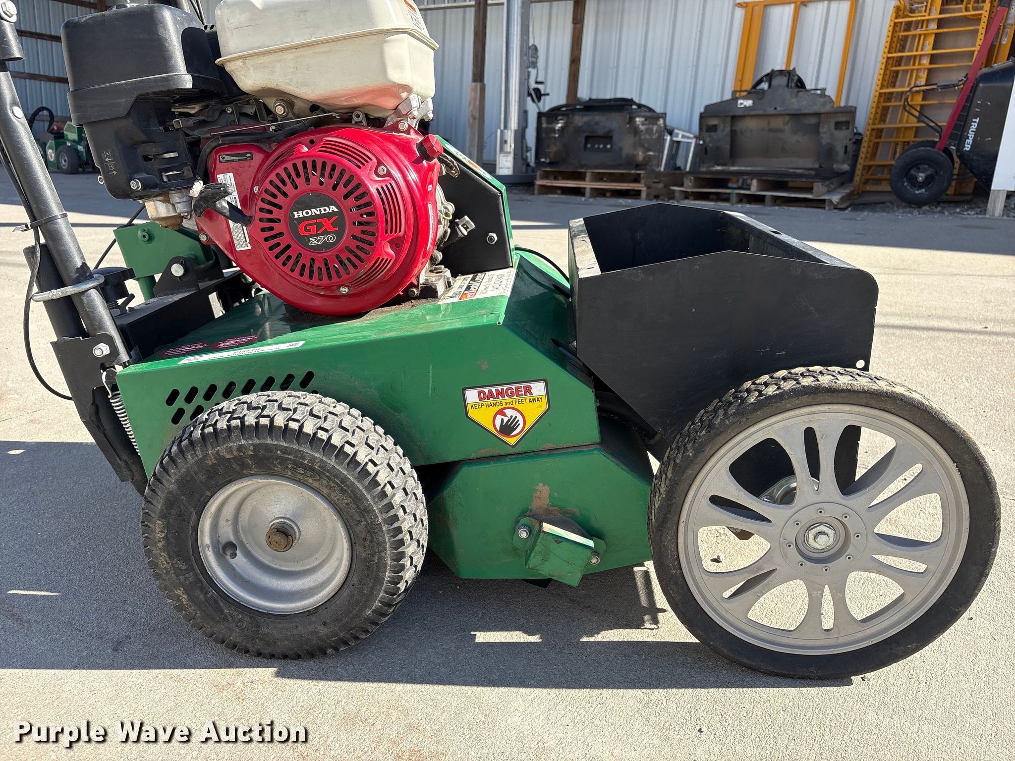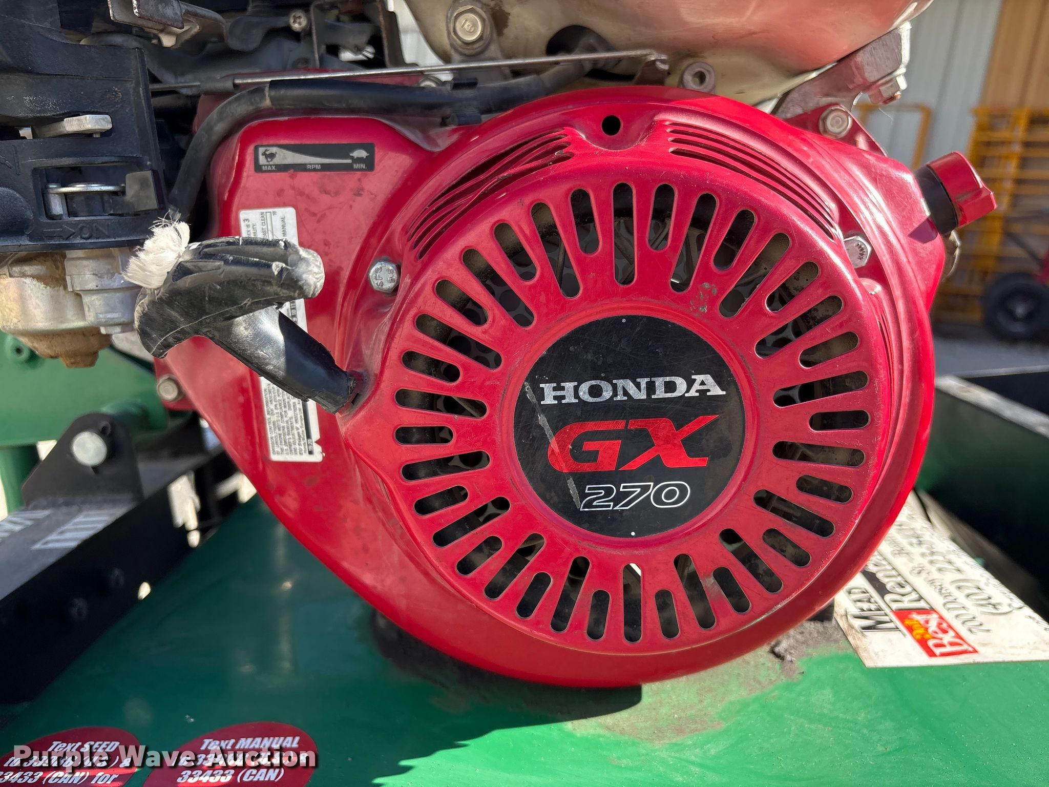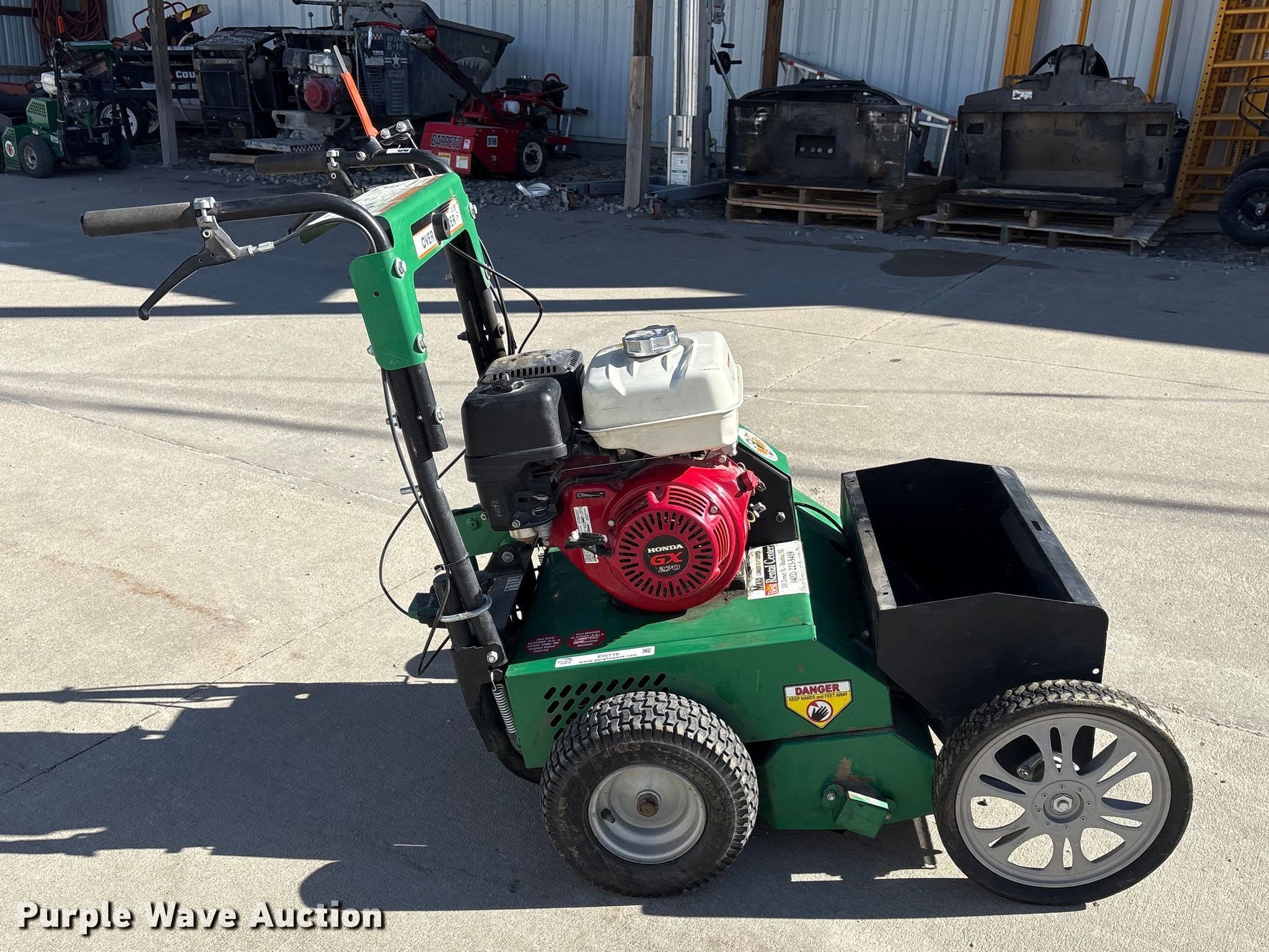 Billy Goat OS901SPH over seeder. Serial: 040620367. Dimensions Overall Length: 4' 9", Width: 30", Height: 46". Engine Honda GX270, Serial: GCBGT-2164558, Displacement: 270cc, Cylinders: 1, Fuel type: Gas. Transmission Hydrostatic. Mead Lumber of Beatrice. Beatrice, NE 68310