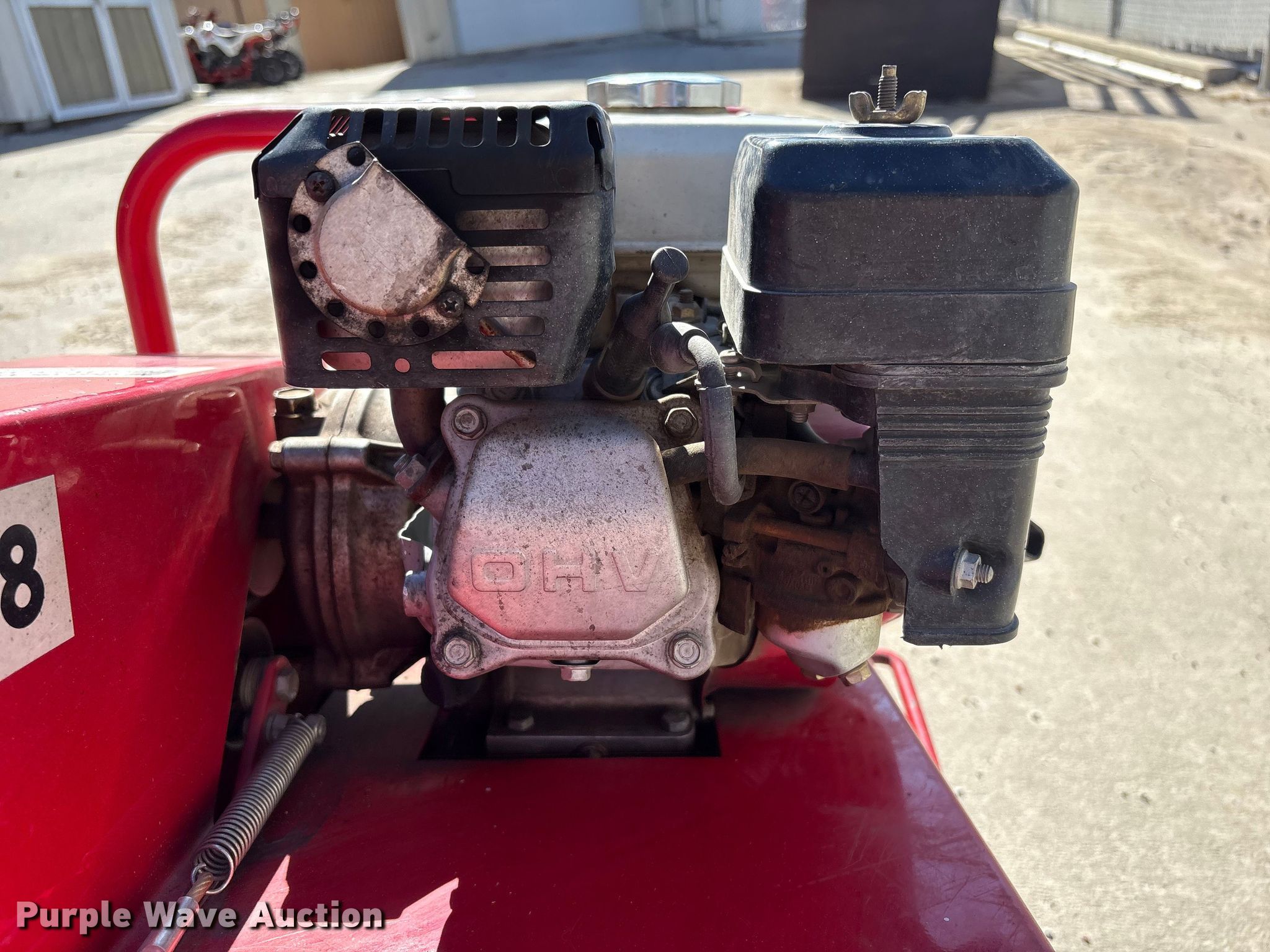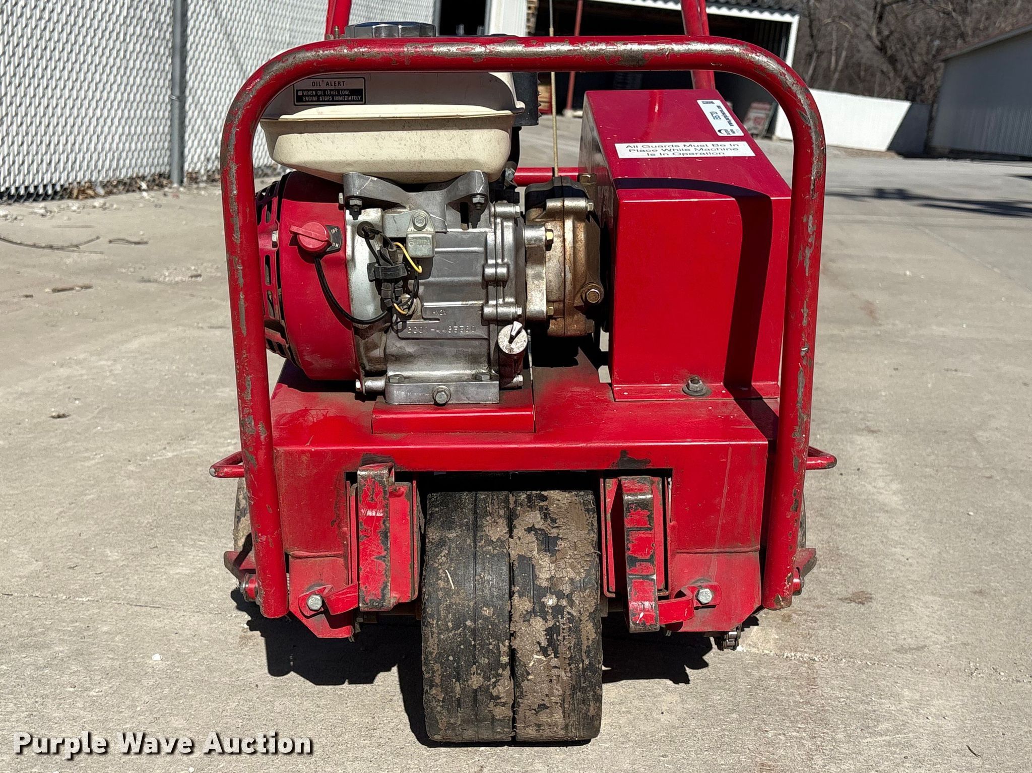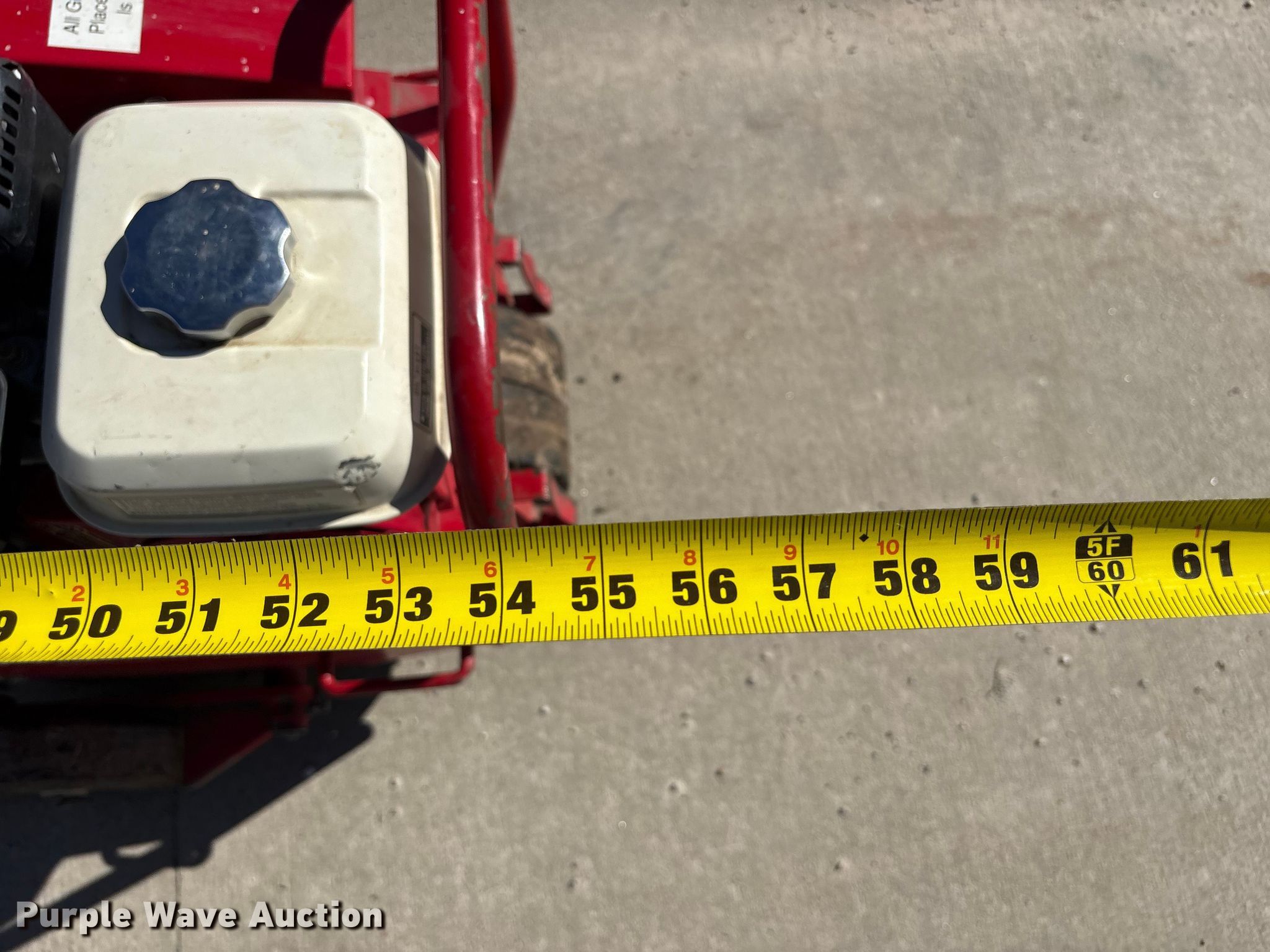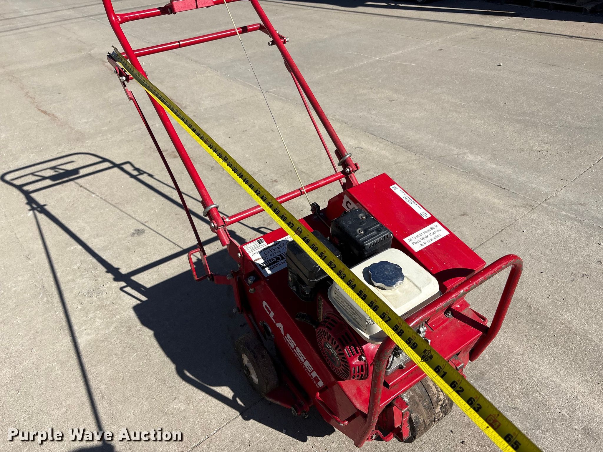 Classen CA-18 aerator. Serial: 001728. Dimensions Overall Length: 55", Width: 29", Height: 48". Engine Honda GX120, Serial: GC01-4435560, Cylinders: 1, Fuel type: Gas. Transmission Hydrostatic. Mead Lumber of Beatrice. Beatrice, NE 68310