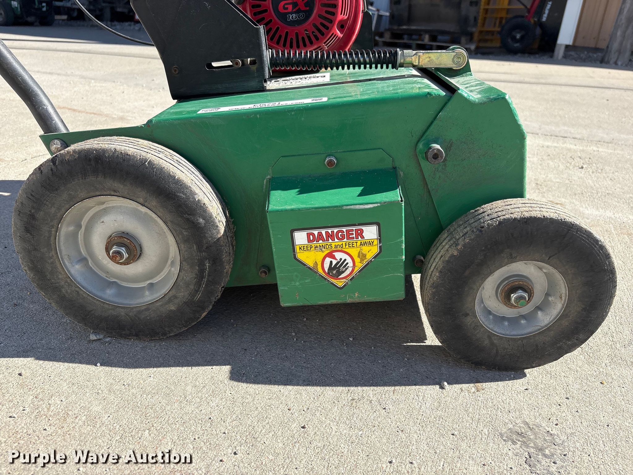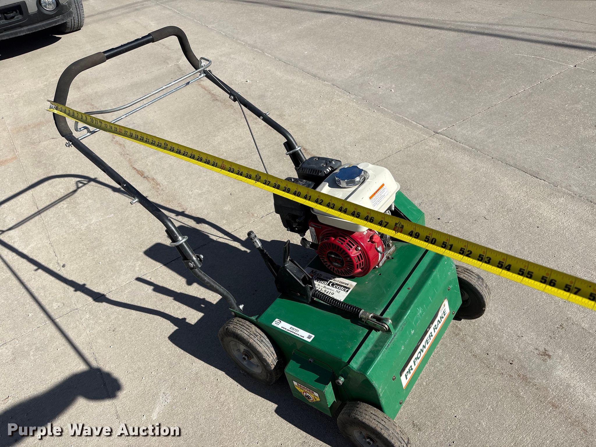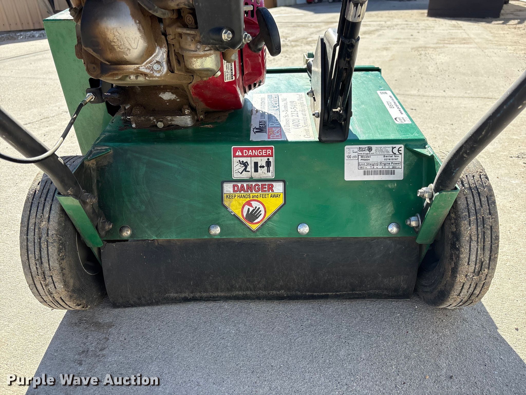 Billy Goat PR550H power rake. Serial: 021615167. Dimensions Overall Length: 4' 1", Width: 26", Height: 38". Engine Honda GX160, Serial: GCBPT-1950805, Displacement: 163cc, Cylinders: 1, Fuel type: Gas. Tires Front: 8x2.50, Rear: 10x2.75. Mead Lumber of Beatrice. Beatrice, NE 68310