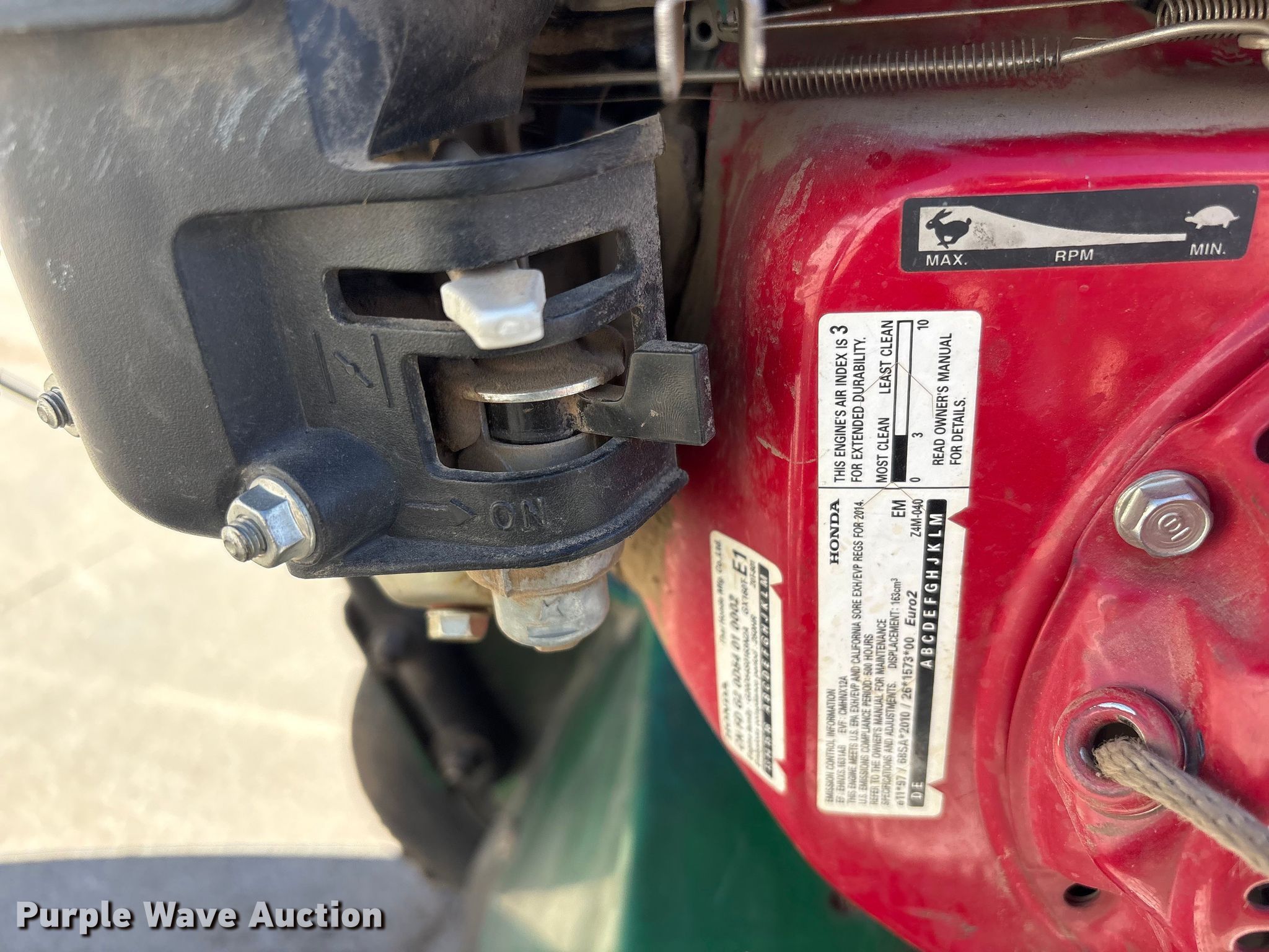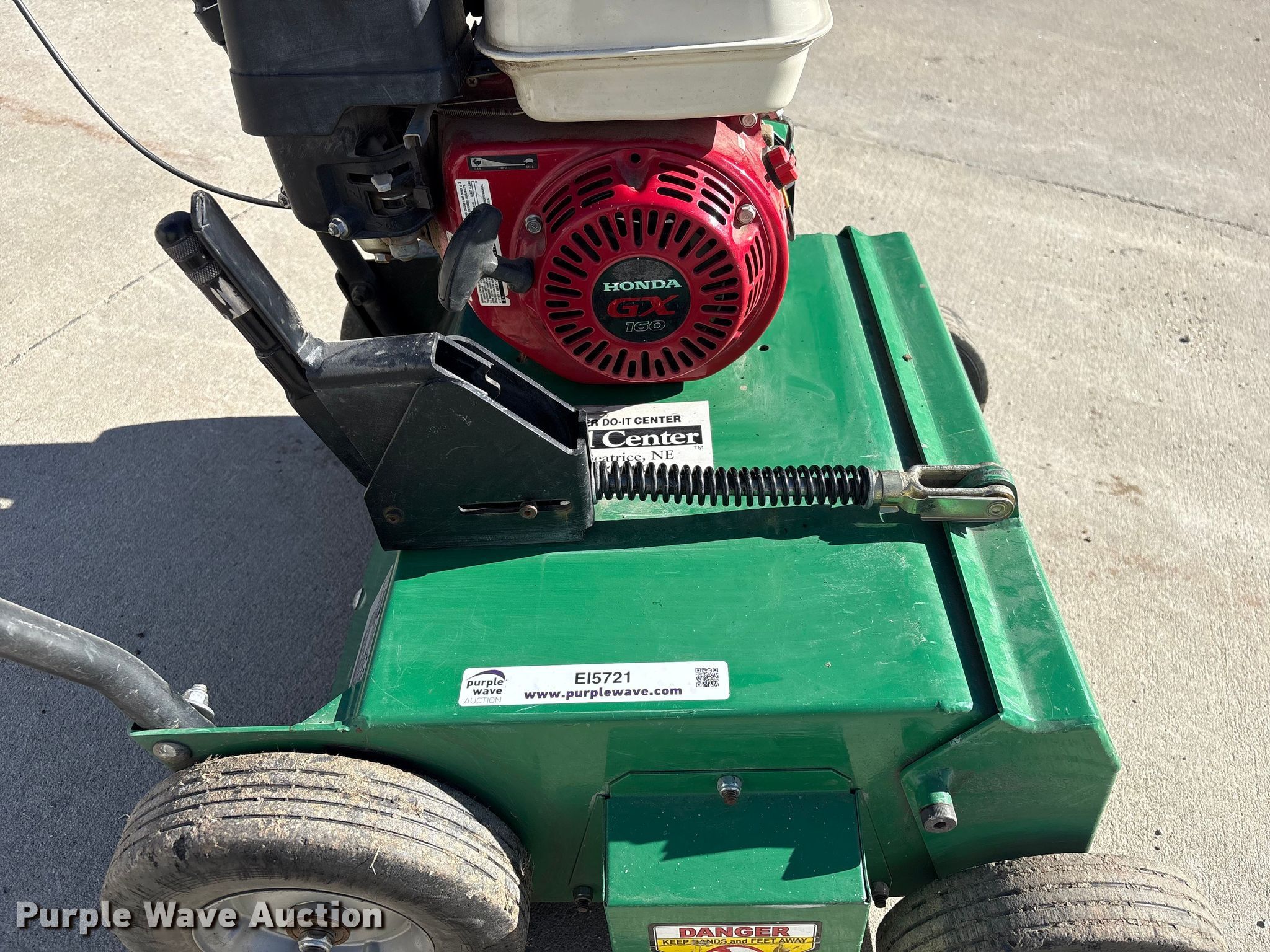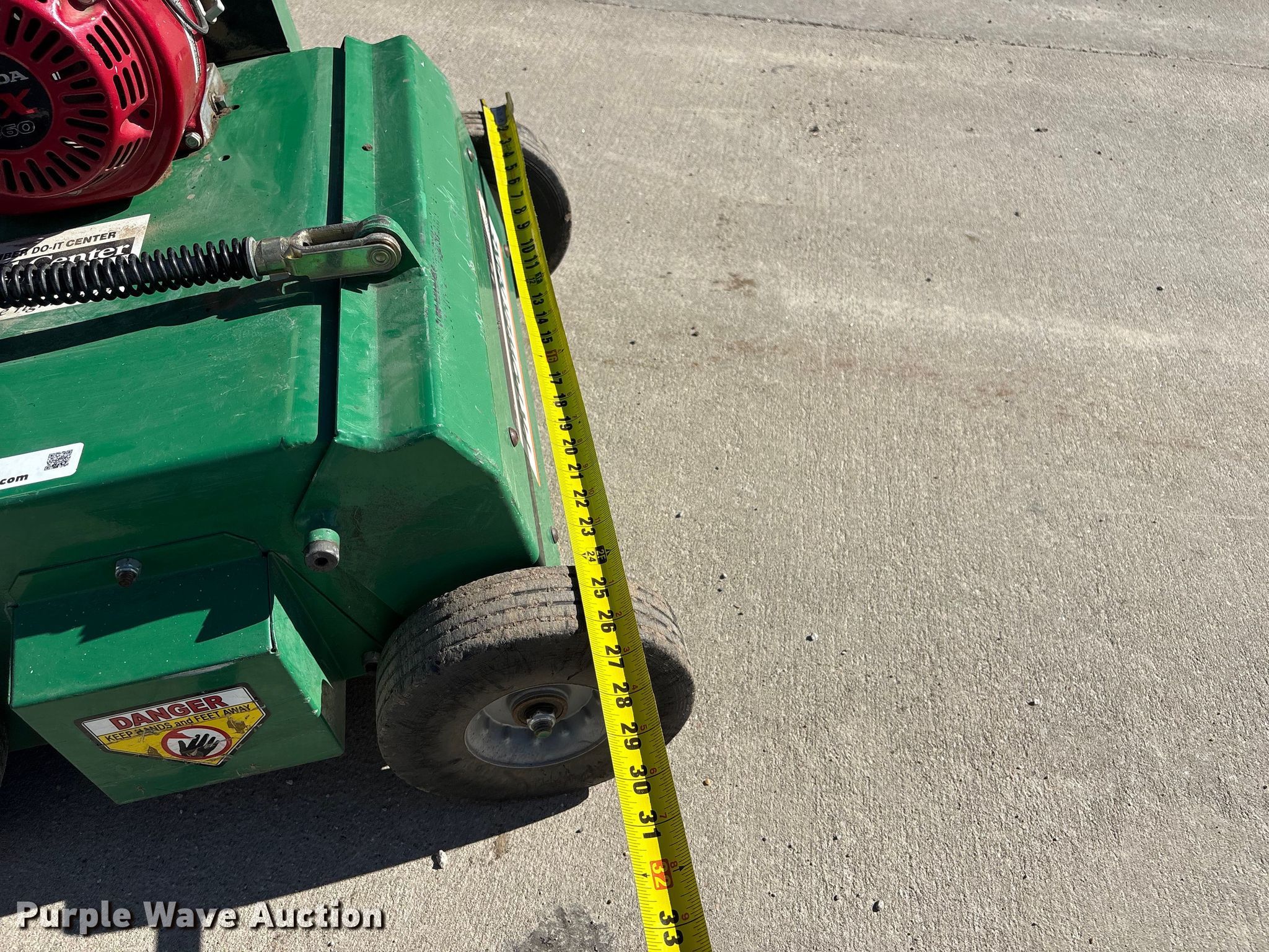 Billy Goat PR550H power rake. Serial: 021615167. Dimensions Overall Length: 4' 1", Width: 26", Height: 38". Engine Honda GX160, Serial: GCBPT-1950805, Displacement: 163cc, Cylinders: 1, Fuel type: Gas. Tires Front: 8x2.50, Rear: 10x2.75. Mead Lumber of Beatrice. Beatrice, NE 68310