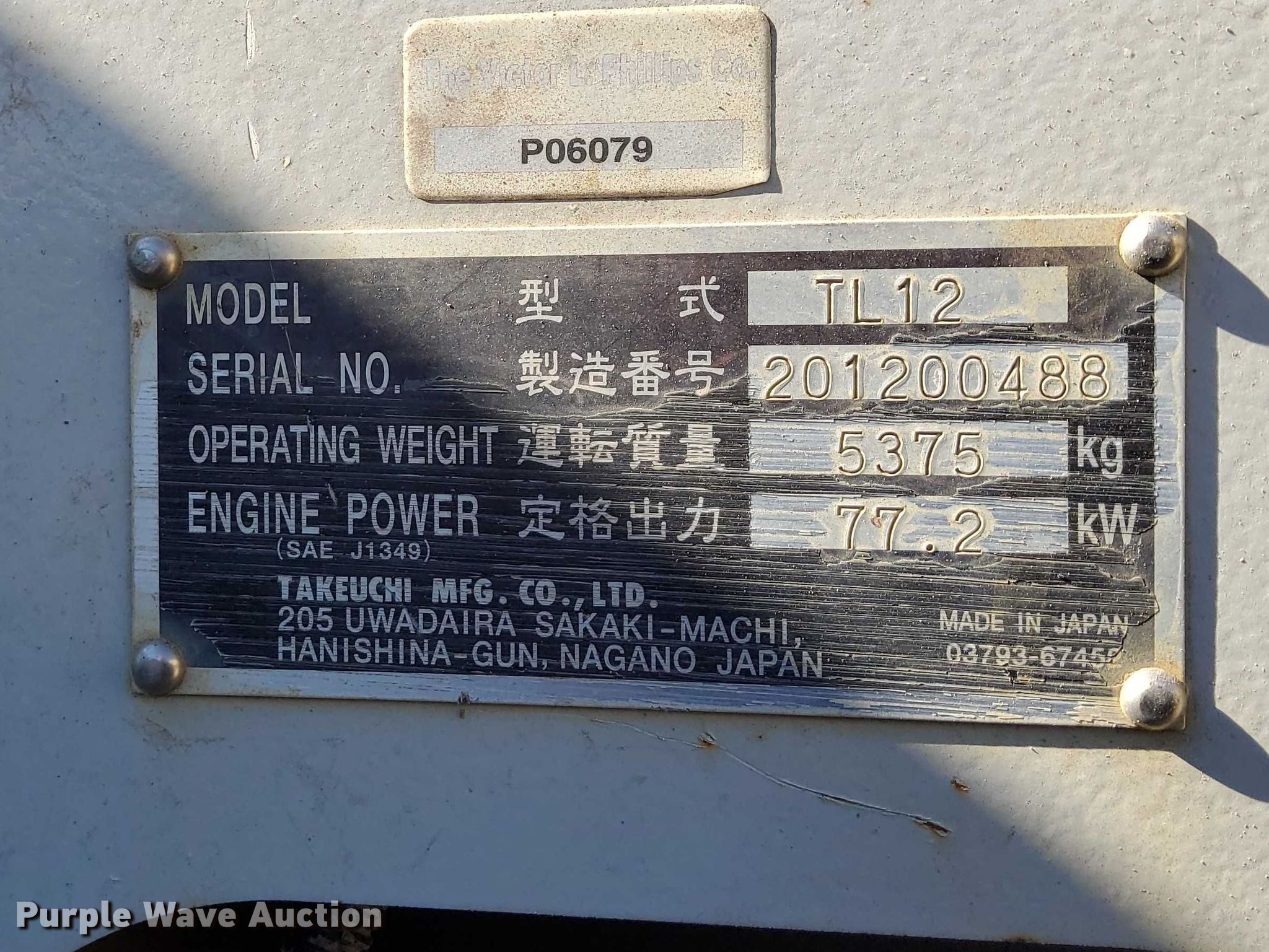 Purple Wave is selling a used Tracked Skid Steer Loader in Missouri. This item is a 2013 Takeuchi TL12 tracked skid steer loader with the following: Hours: Unknown, Serial: 201200488, Unit #: SS006