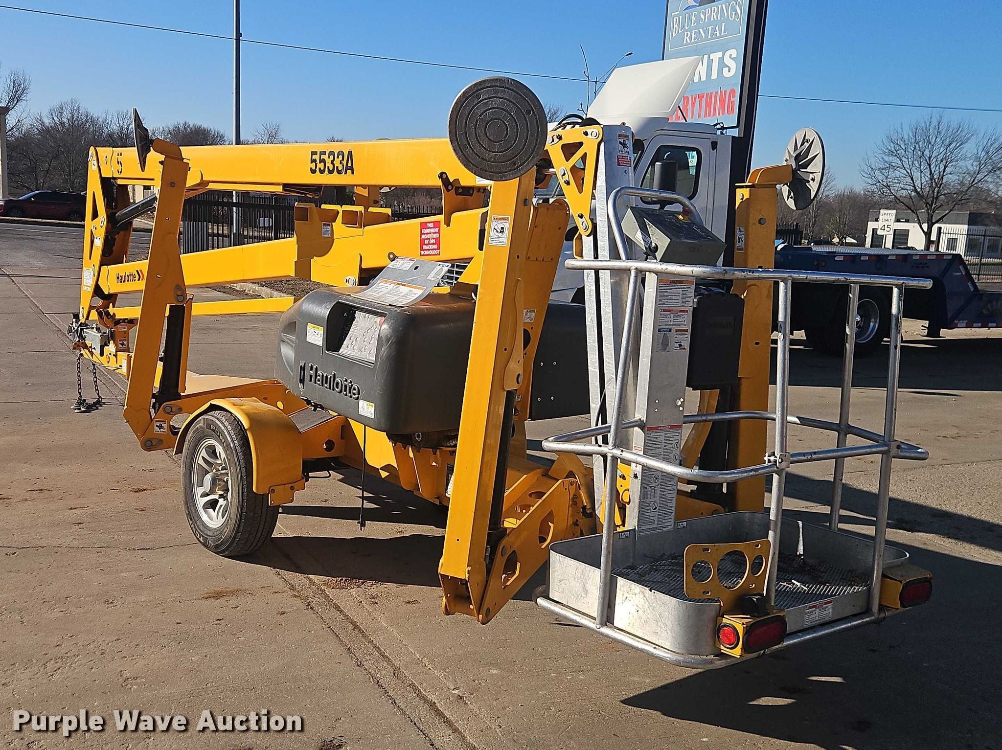2022 Haulotte 5533A boom lift. Hours: 1,848 on meter, VIN: 5CUAL2313NA000290, Serial: 2113226-00290, Unit #: 5. Electric Motor Volts: 24. Features Tow behind, Boom type: Telescopic, Maximum lift capacity: 500 lbs, Maximum reach length: 33', Maximum lift height: 55', Hydraulic outriggers, Hydraulic extendable jib, Hydraulic leveling, Platform: 27" L x 47" W, AC power outlet, Air outlet, Controls: Platform, Ground. Tires Tire size: 225/75R15. This is worksite support equipment and will not come with a title. Transfer of ownership documentation will be a bill of sale. Blue Springs Rental. Blue Springs, MO 64015