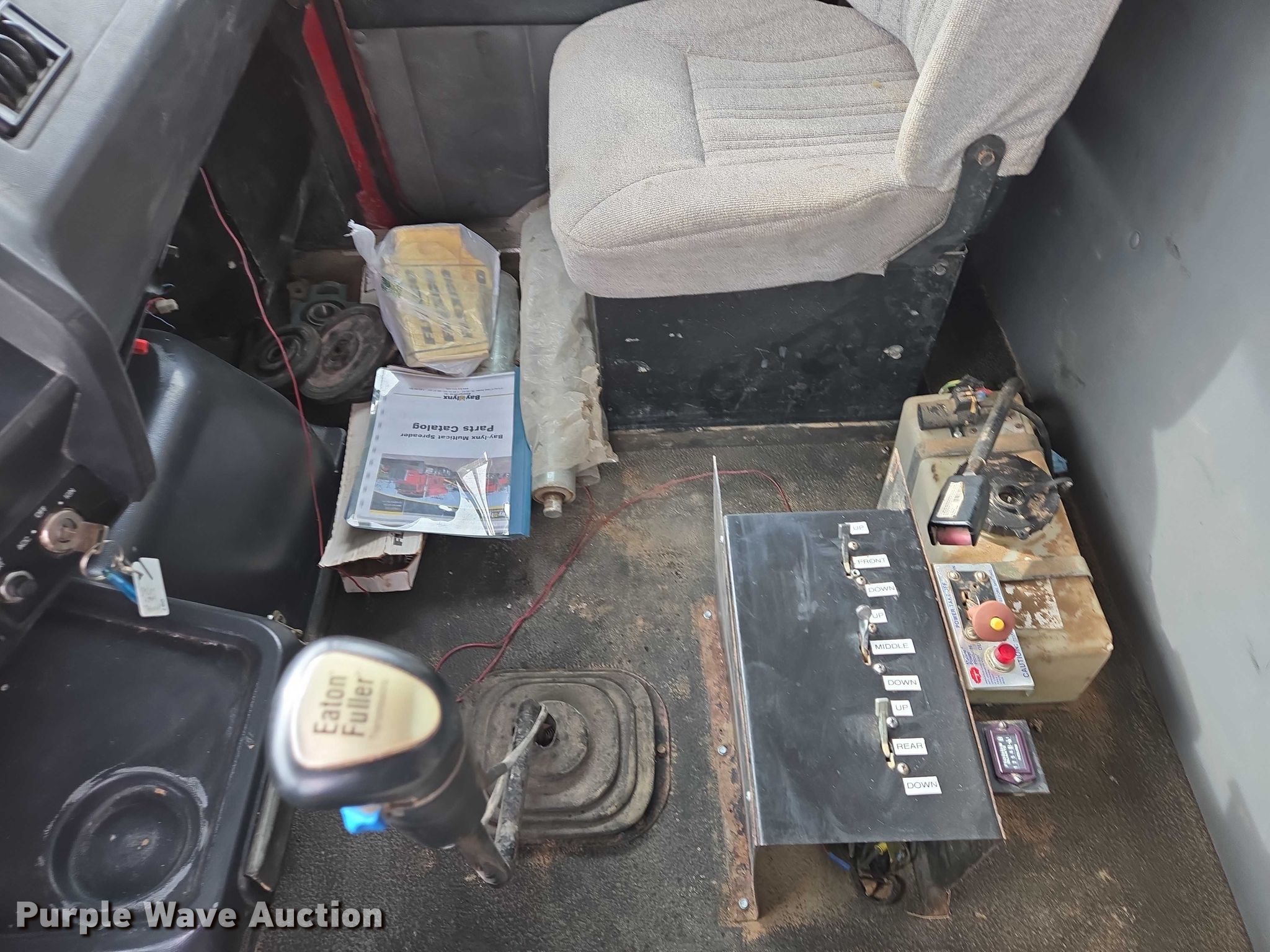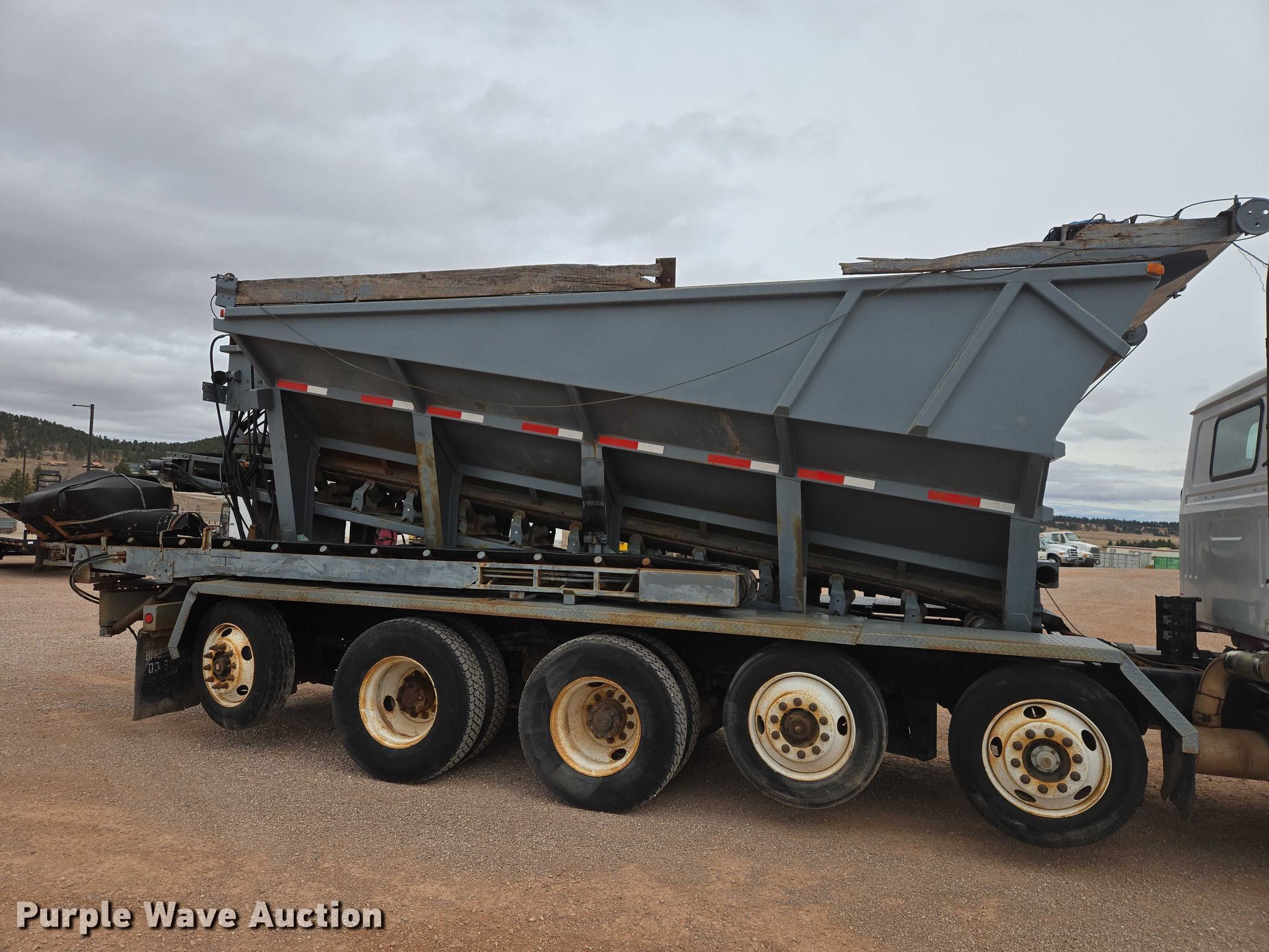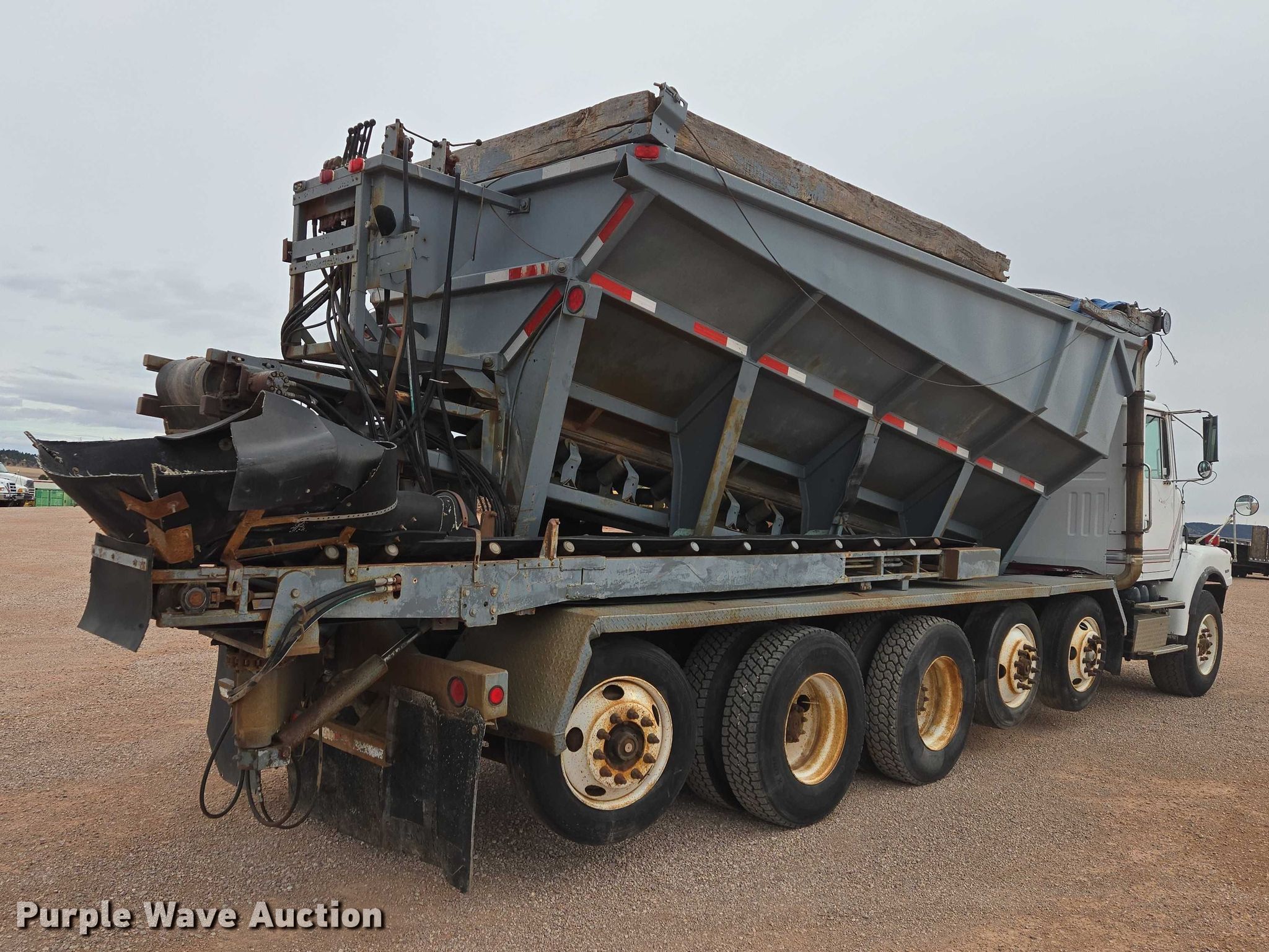 1999 Volvo WG rock slinger. Miles: 1,085 on odometer, Actual miles: Unknown, Hours: 197 on meter, Hours: 1256 on second meter, VIN: 4VHJCCJF7XN867721. Engine Cummins N14, Displacement: 14.0L, Cylinders: 6, Fuel type: Diesel, Engine brake. Transmission Eaton Fuller 8LL, Manual, Speed: 10. Chassis Axles: 5, Pusher axle Steerable, Tag axle, Differential lock: Full, Suspension: Spring over walking beam, Brakes: Air, PTO. Interior AC, Heat, Heated mirrors, Cruise control. Features Bed Bay Lynx XL18D-19, Serial: 9811136, Length: 19', Width: 98", Bed type: Steel, Bed vibrator, Liner, Roll tarp, Rear conveyor Length: 19', Width: 18". Tires Front: 385/65R22.6, Rear: 11R22.5, Lift axle: 255/70R22.5. Notes Owner's manual. South Dakota title. Title distribution may be delayed up to 30 days from verification of funds. Tru-Form Construction. Black Hawk, SD 57718
