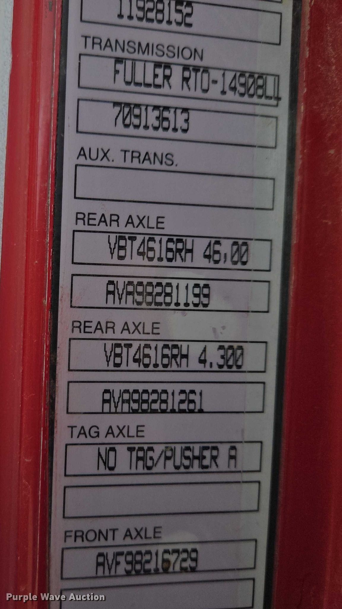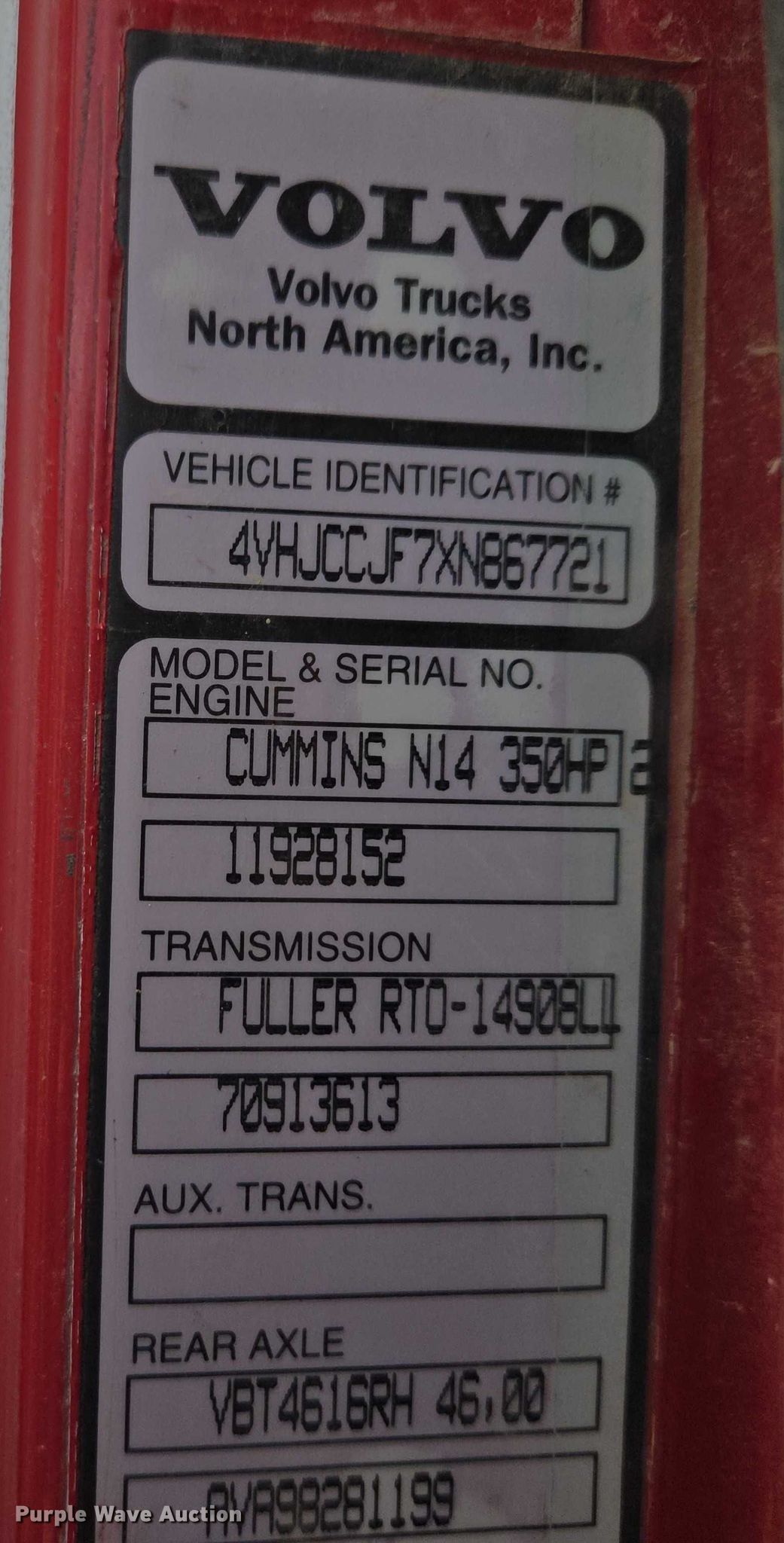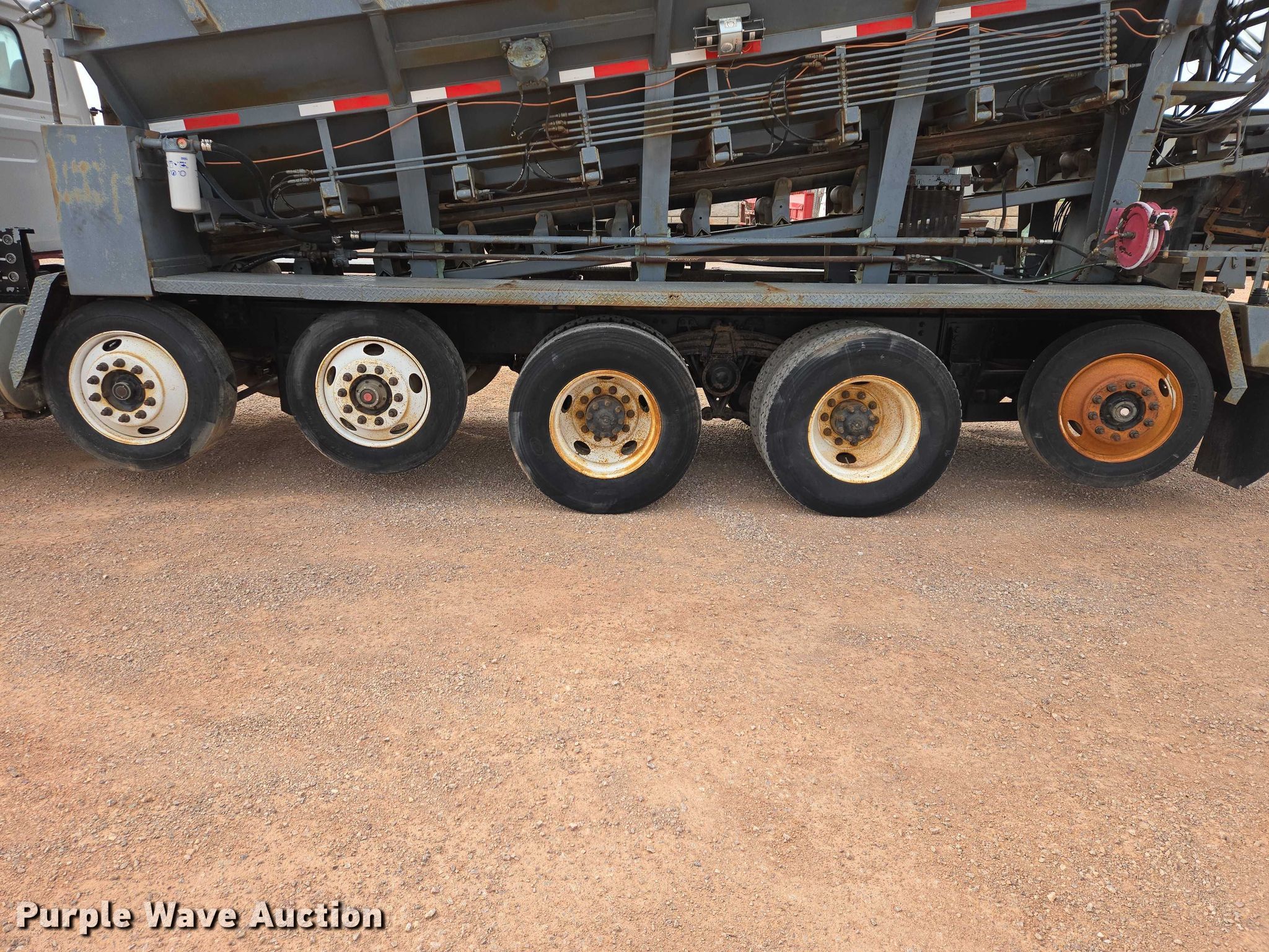 1999 Volvo WG rock slinger. Miles: 1,085 on odometer, Actual miles: Unknown, Hours: 197 on meter, Hours: 1256 on second meter, VIN: 4VHJCCJF7XN867721. Engine Cummins N14, Displacement: 14.0L, Cylinders: 6, Fuel type: Diesel, Engine brake. Transmission Eaton Fuller 8LL, Manual, Speed: 10. Chassis Axles: 5, Pusher axle Steerable, Tag axle, Differential lock: Full, Suspension: Spring over walking beam, Brakes: Air, PTO. Interior AC, Heat, Heated mirrors, Cruise control. Features Bed Bay Lynx XL18D-19, Serial: 9811136, Length: 19', Width: 98", Bed type: Steel, Bed vibrator, Liner, Roll tarp, Rear conveyor Length: 19', Width: 18". Tires Front: 385/65R22.6, Rear: 11R22.5, Lift axle: 255/70R22.5. Notes Owner's manual. South Dakota title. Title distribution may be delayed up to 30 days from verification of funds. Tru-Form Construction. Black Hawk, SD 57718
