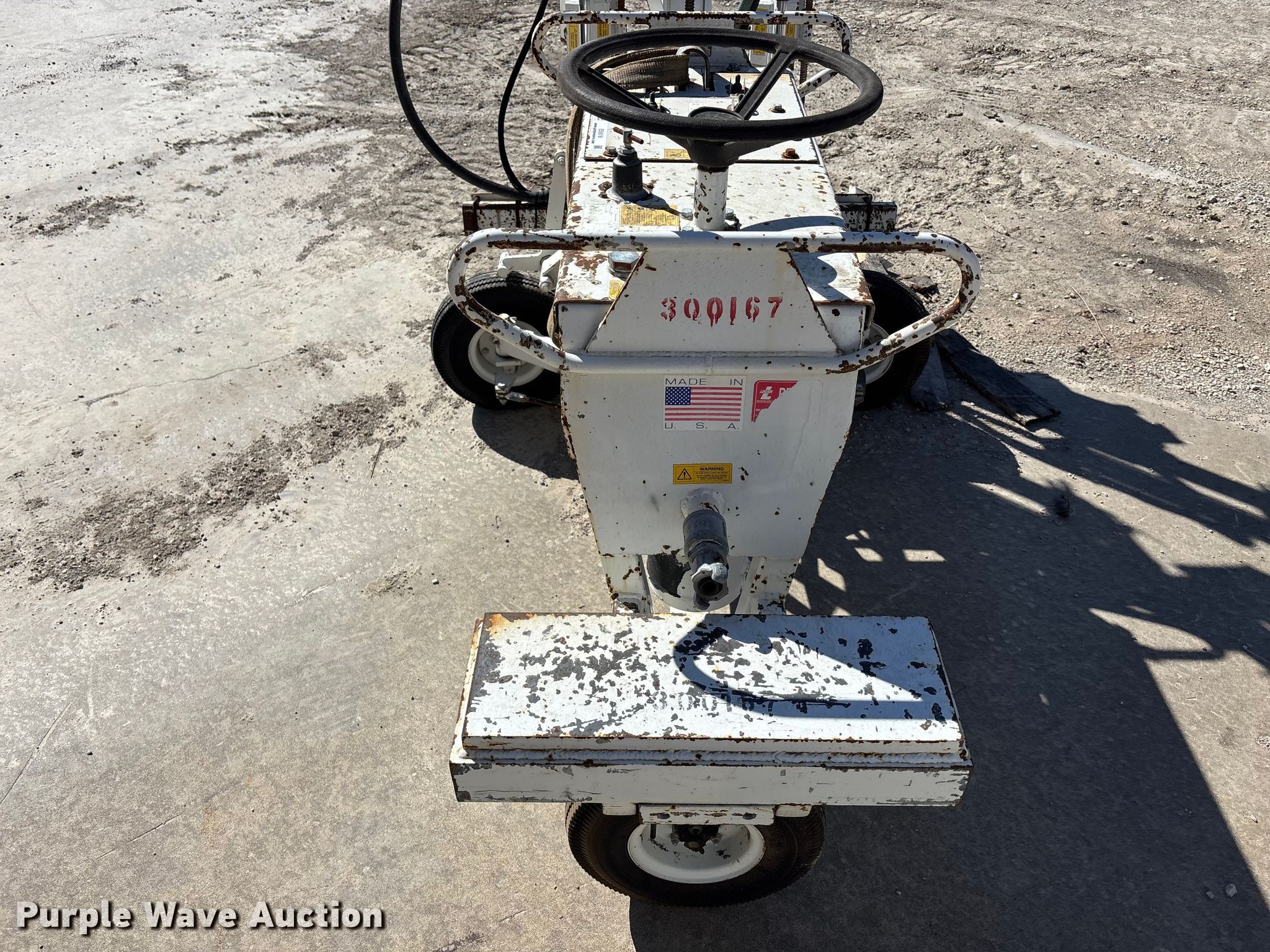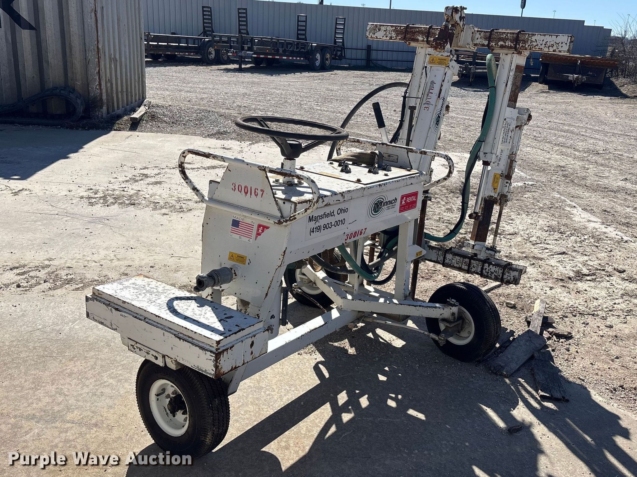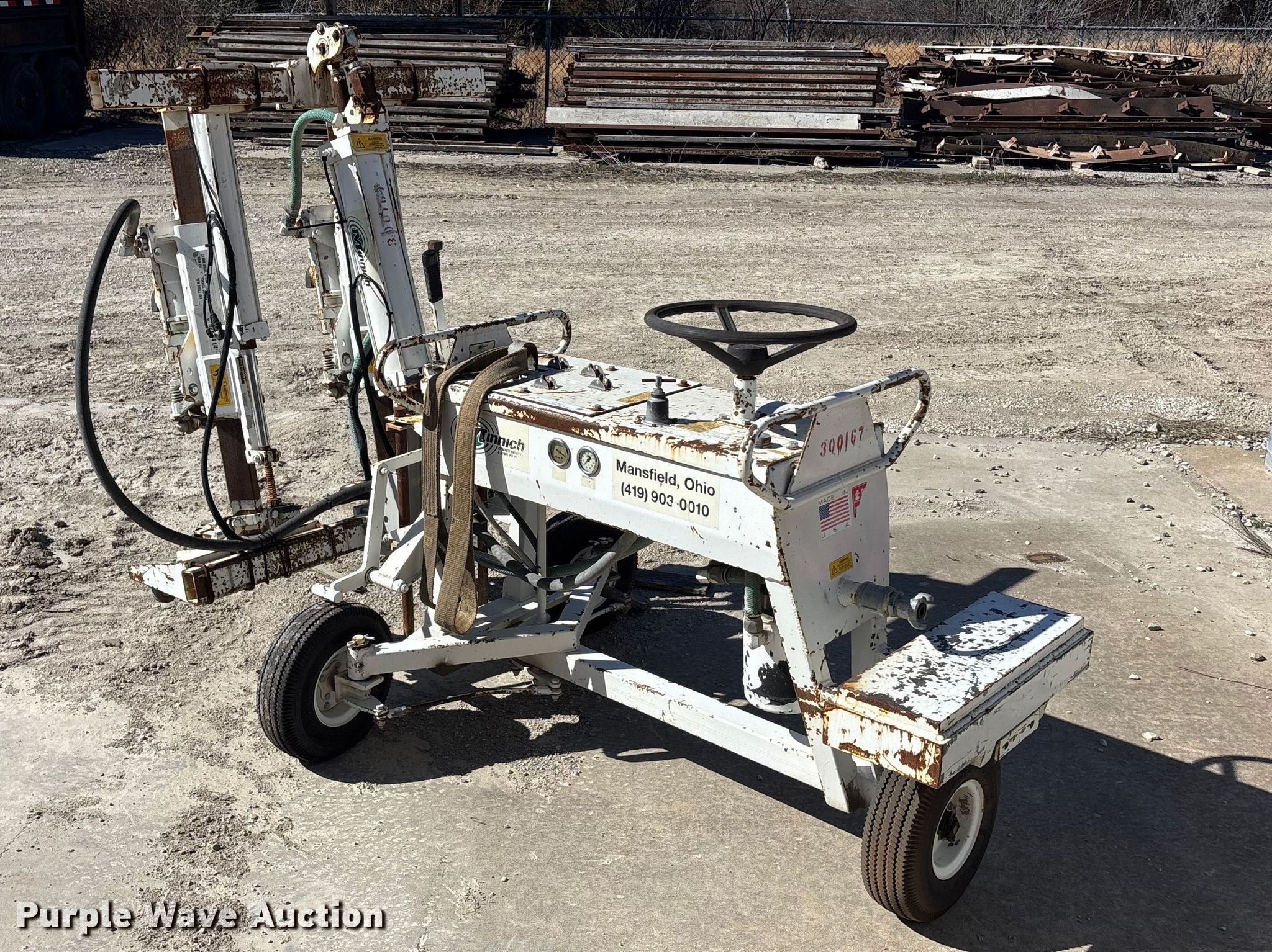 Minnich A-2C dowel pin drill. Serial: 104-3883-30. Tires Size: 5.30-4.5-6. SeCon Construction, Inc.. Oak Grove, MO 64075