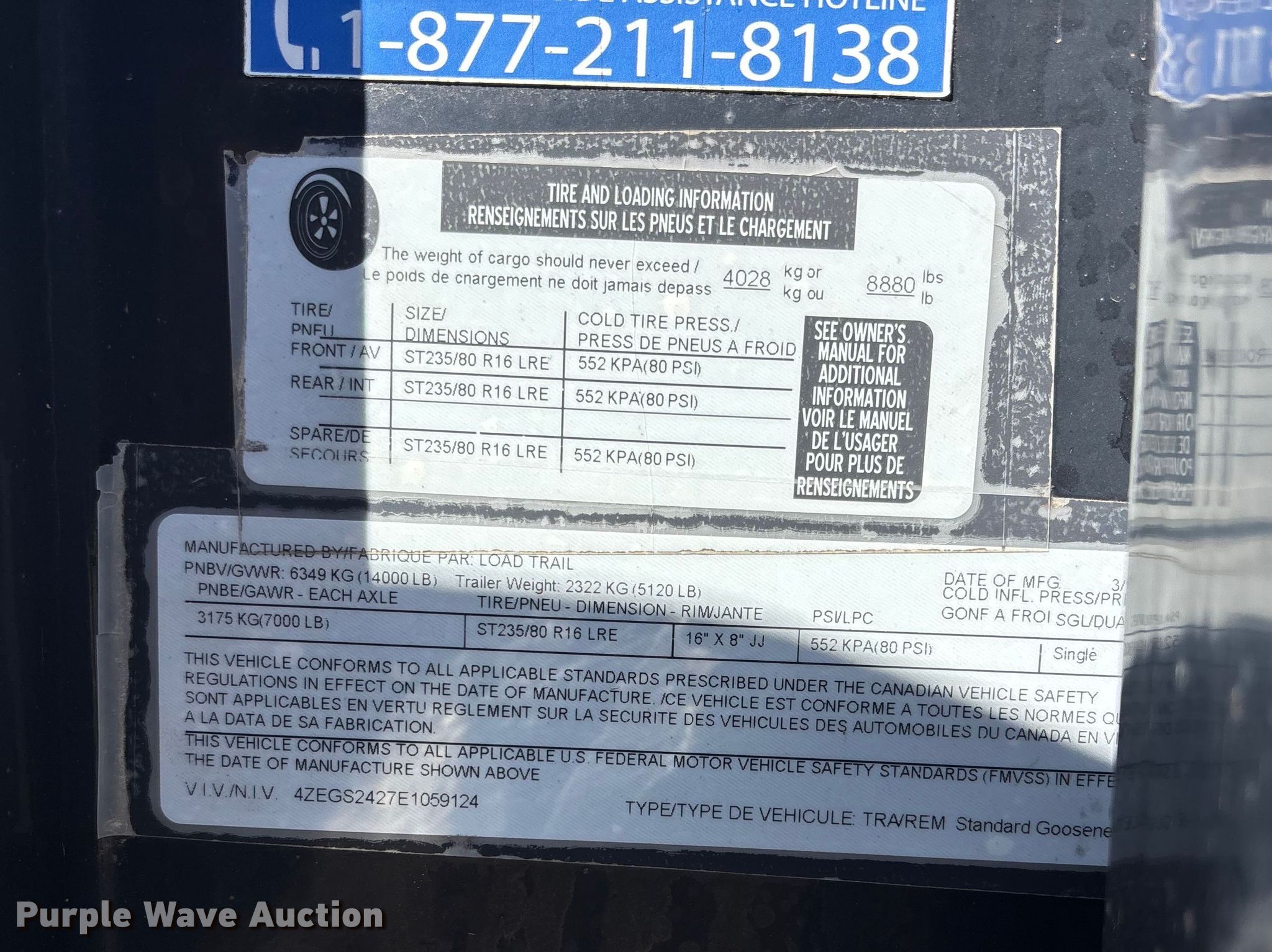 2014 Load Trail Load Max equipment trailer. VIN: 4ZEGS2427E1059124. Dimensions Overall Length: 33', Width: 102", Deck Length: 24', Width: 102", Top deck length: 19', Tail length: 5', Ramps: Manual Length: 5'. Features Deck type: Wood. Chassis Hitch: Gooseneck, Landing gear: Dual, Suspension: Spring, Brakes: Electric, Axles: Tandem, GVWR: 14,000 lbs. Tires Steel wheels, Size: 7.50R16. Missouri title. Title distribution may be delayed up to 14 days from verification of funds. SeCon Construction, Inc.. Oak Grove, MO 64075