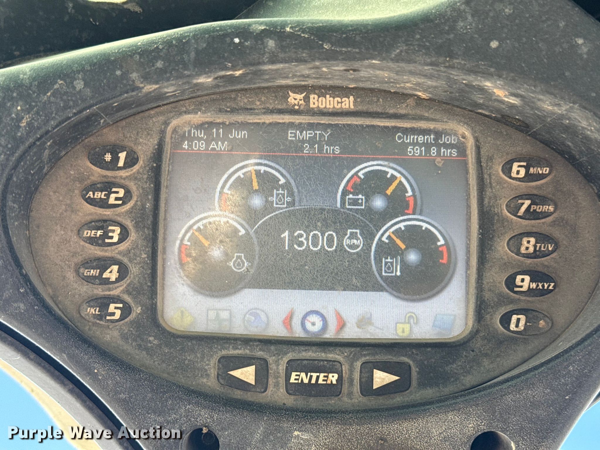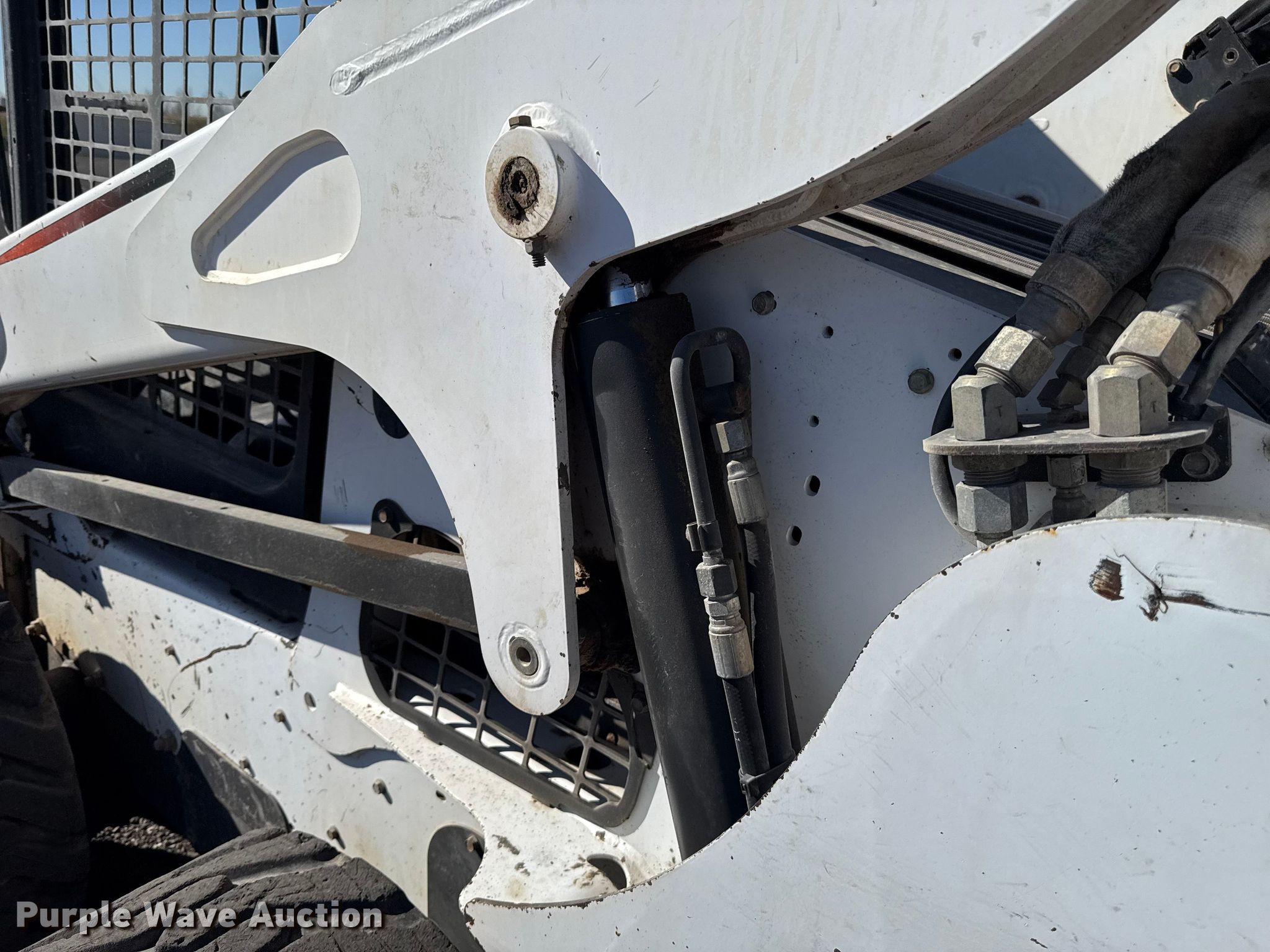 2014 Bobcat S770 skid steer loader. Hours: 5,223 on meter, Serial: ATF212393, Unit #: 564-254. Engine Cylinders: 4, Fuel type: Diesel. Transmission Hydrostatic, Two speed travel. Operators station OROPS, Bucket control: Hand, Pattern changer, Electronic Monitoring System panel. Features Auxiliary hydraulics, Quick coupler: Manual, Bucket John Deere C78, Width: 78", Low profile, Cutting edge: Bolt-on. Tires Size: 12N16.5, Brand: Michelin X Tweel, Solid. Duit Holdings Inc.. Edmond, OK 73034