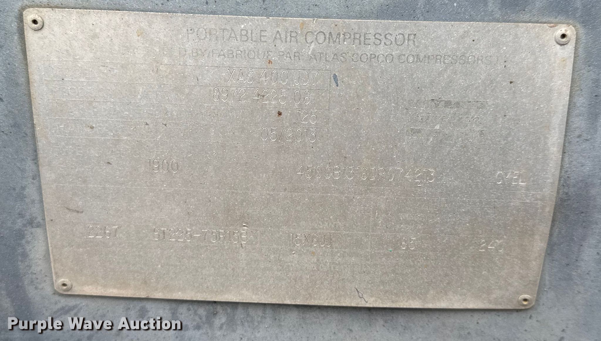 Purple Wave is selling a used Air Compressor in Kansas. This item is a 2013 Altas Copco XAS400JD7 Tier 4 air compressor with the following: Hours: 6,250 on meter, VIN: 4500B1316DR074213