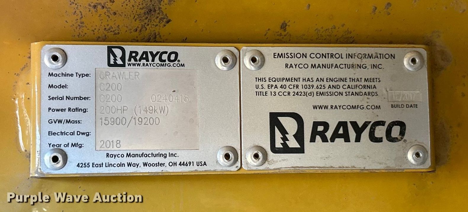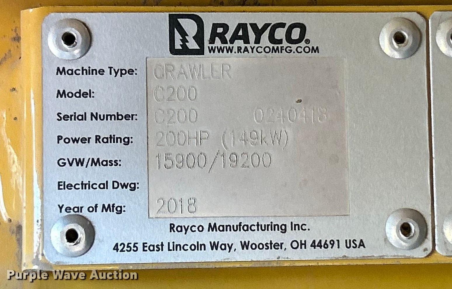 Purple Wave is selling a used Brush Mower in Missouri. This item is a 2018 Rayco C200 forestry mulcher with the following: Hours: 931 on meter, Serial: C200 0240418