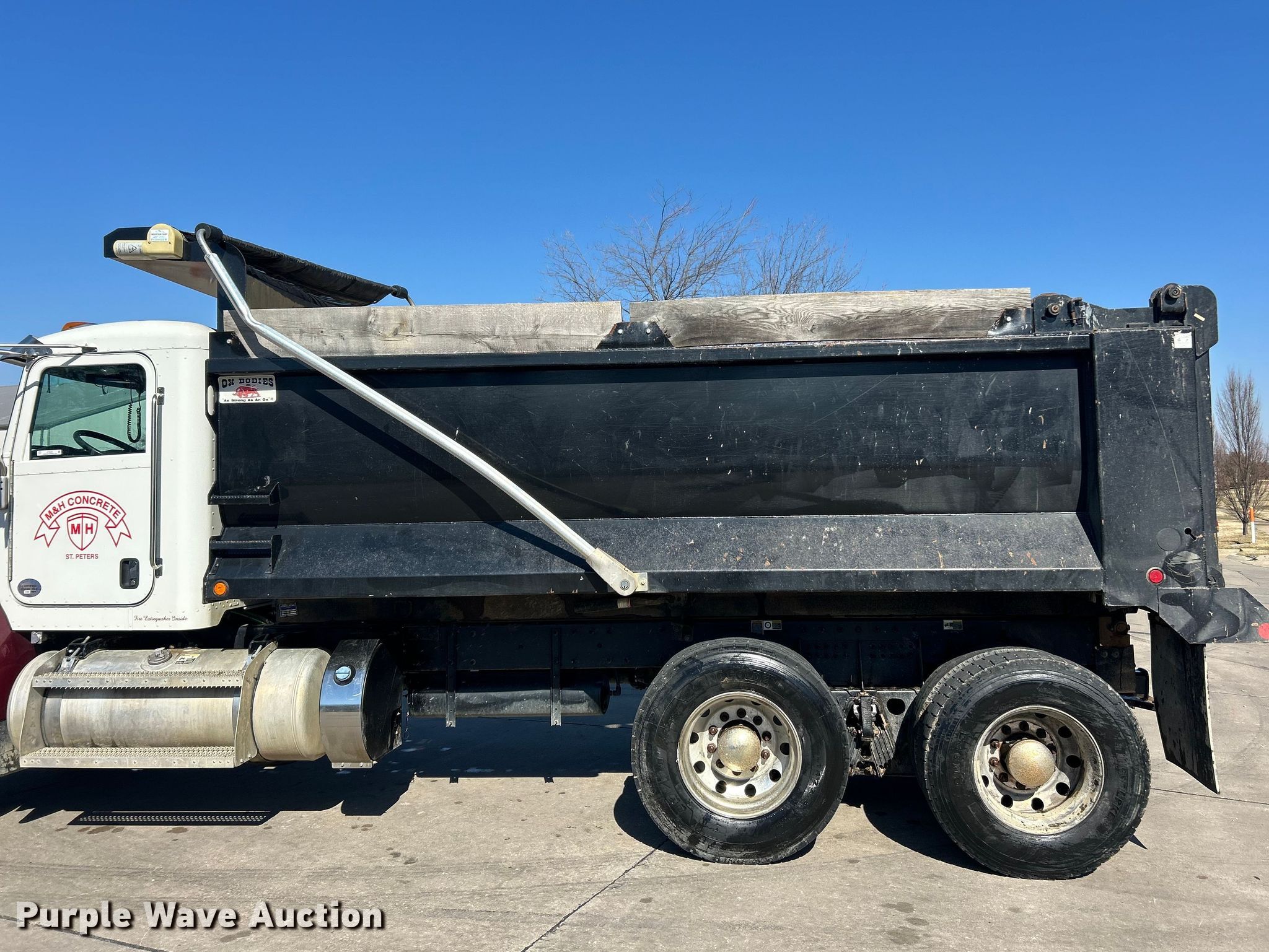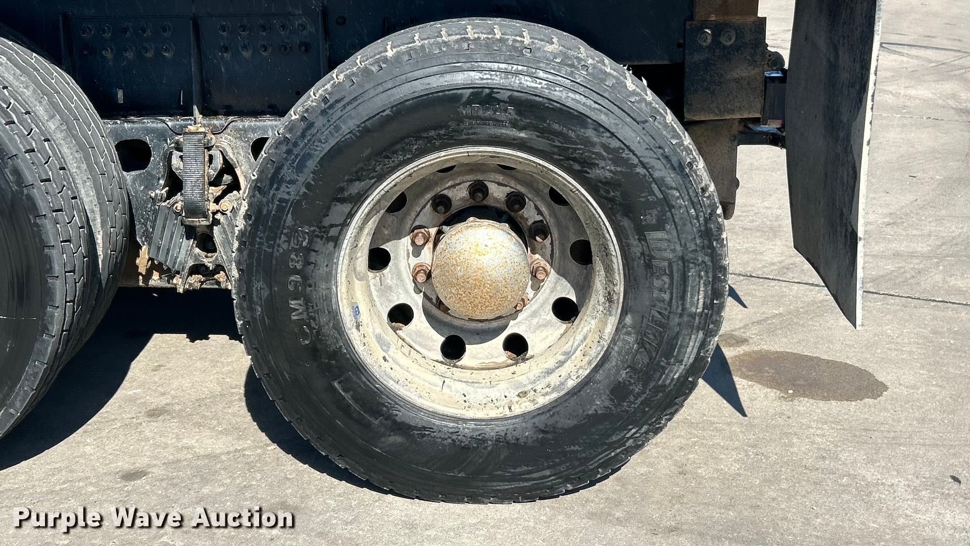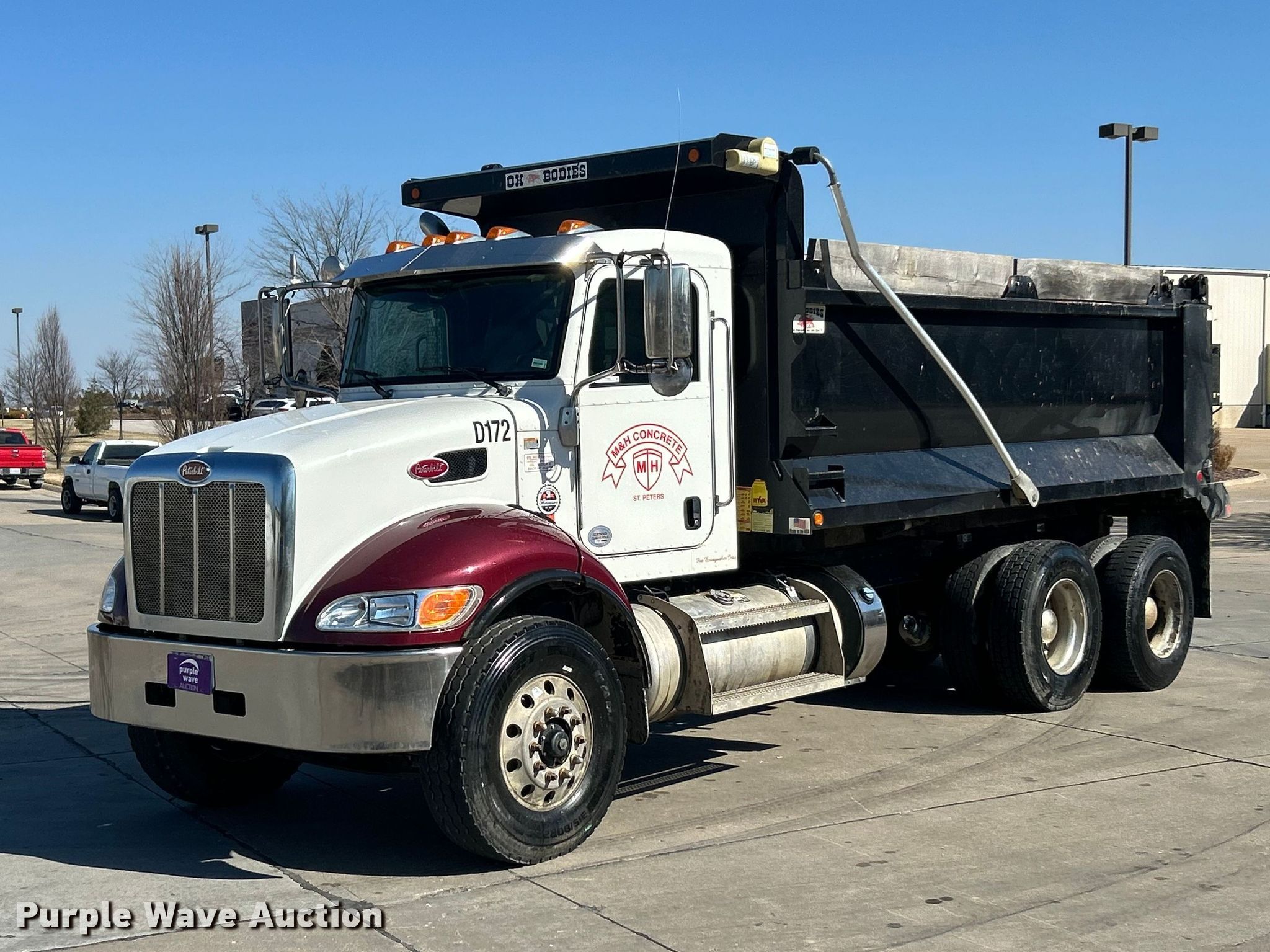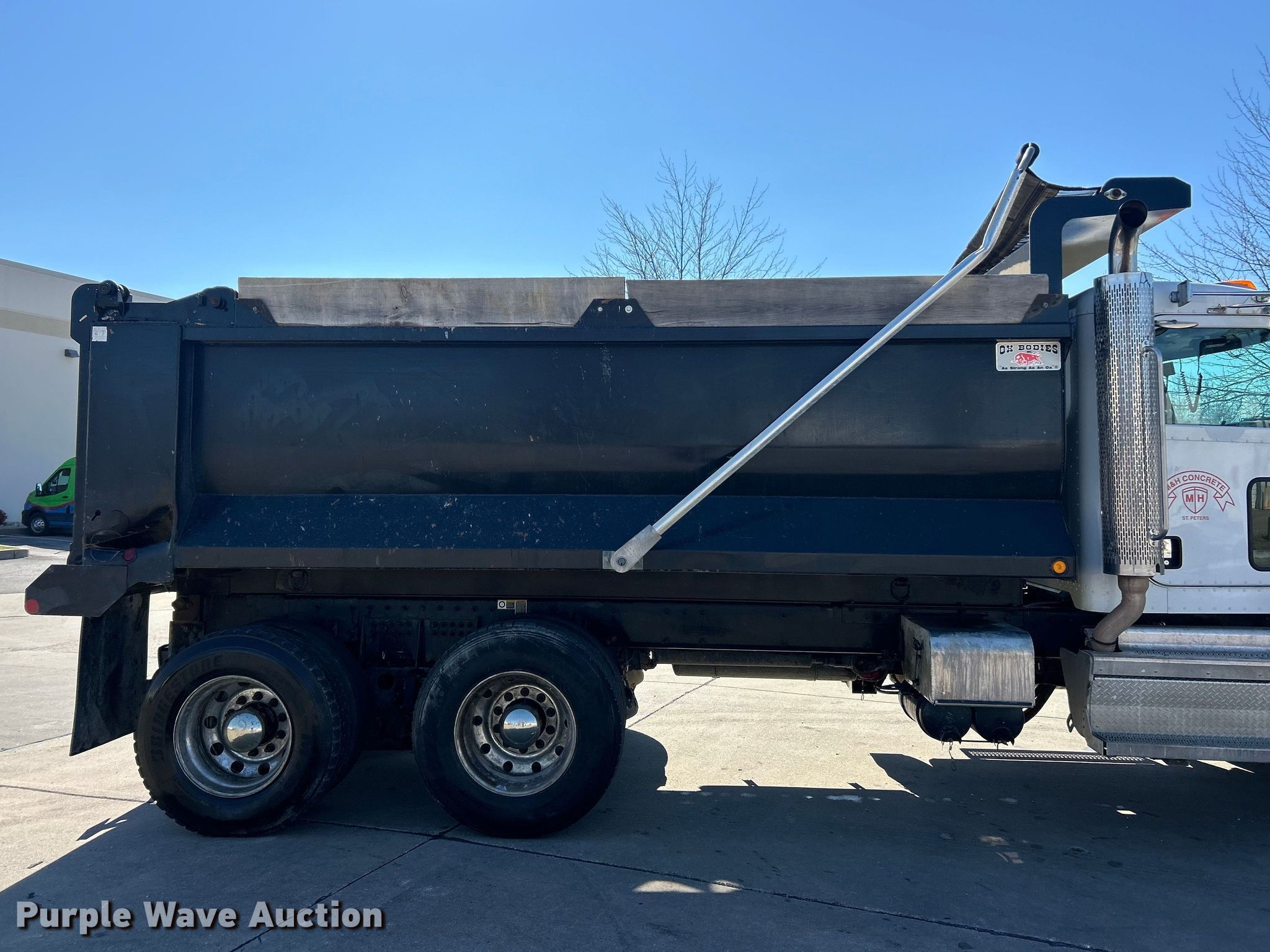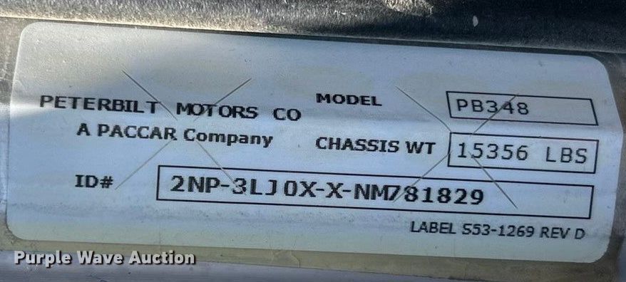 2022 Peterbilt 348 dump truck. Miles: 112,663 on odometer, Hours: 4,872 on meter, VIN: 2NP3LJ0XXNM781829. Engine Paccar PX-9, Displacement: 8.9L, Cylinders: 6, Fuel type: Diesel, Engine brake. Transmission Automatic. Chassis Axles: Tandem, Differential lock: Inter-axle, Suspension: Spring over walking beam, Brakes: Air, PTO, GVWR: 64,180 lbs FAWR: 18,180 lbs, IAWR: 23,000 lbs, RAWR: 23,000 lbs. Interior AC, Heat, Heated mirrors, Power windows, Cruise control. Features Bed Dump bed, Ox Bodies, Length: 16', Width: 96", Side height: 48", Side board height: 10", Bed type: Steel, Barrel, Roll tarp, Ram: Single, End gate: Air operated. Tires Front: 315/80R22.5, Rear: 11R22.5. Notes Windshield chipped or cracked. Missouri title. Title distribution may be delayed up to 14 days from verification of funds. M&H Concrete Contractors Inc.. St. Peters, MO 63376