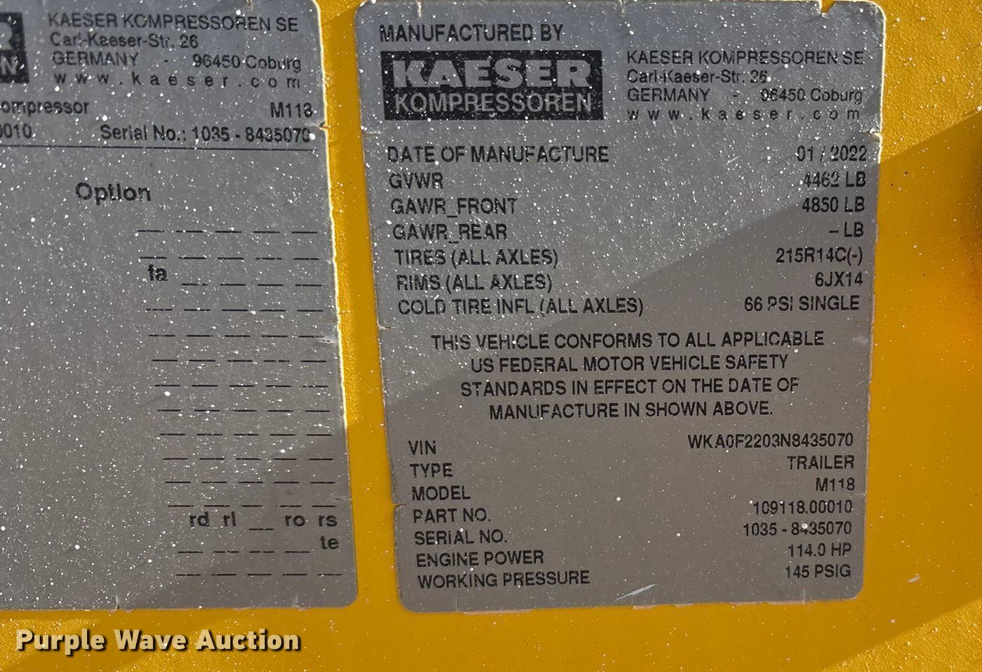 Purple Wave is selling a used Air Compressor in Texas. This item is a Kaeser M118 air compressor with the following: Hours: 1,935 on meter, VIN: WKA0F2203N8435070, Serial: 1035 - 8835070