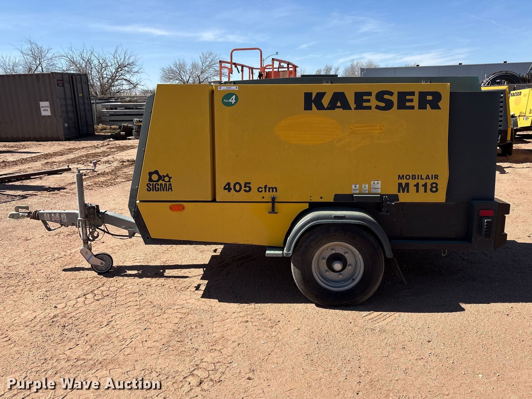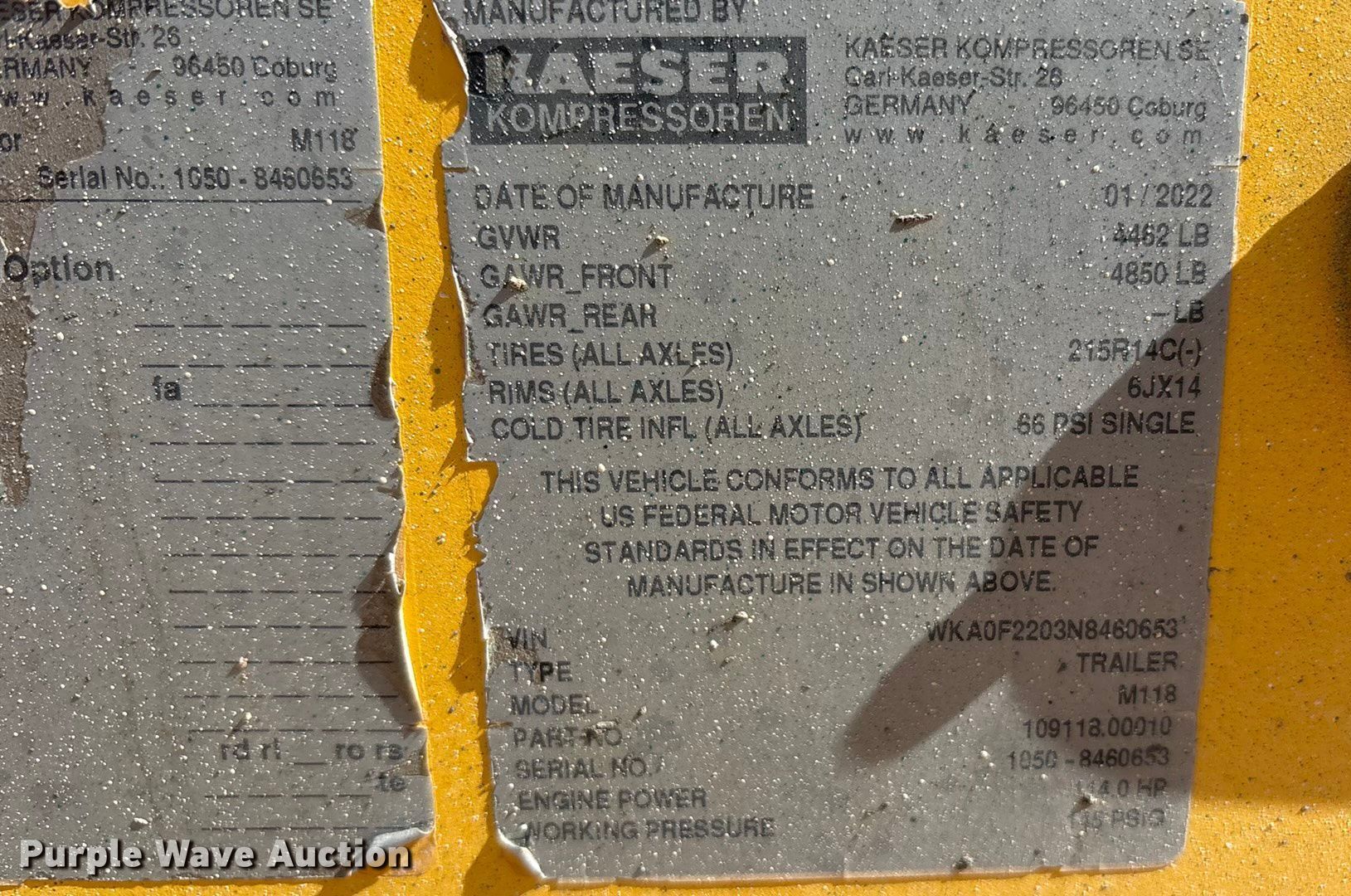 2022 Kaeser M118 air compressor. Hours: 3,588 on meter, VIN: WKAOF2203N8460653, Serial: 1050 - 8460653. Engine Deutz TCD, Serial: 12497273, Displacement: 3.621L, Cylinders: 4, Fuel type: Diesel. Features Air compressor Kaeser M118, CFM: 405, PSI: 145. Trailer Ball hitch size: 2", Suspension: Torsion, Brakes: Hydraulic, Axles: Single, Tire size: 215R14C, GVWR: 4,462 lbs, GAWR: 4,850 lbs. This is worksite support equipment and will not come with a title. Transfer of ownership documentation will be a bill of sale. ASCO Equipment. Midland, TX 79701