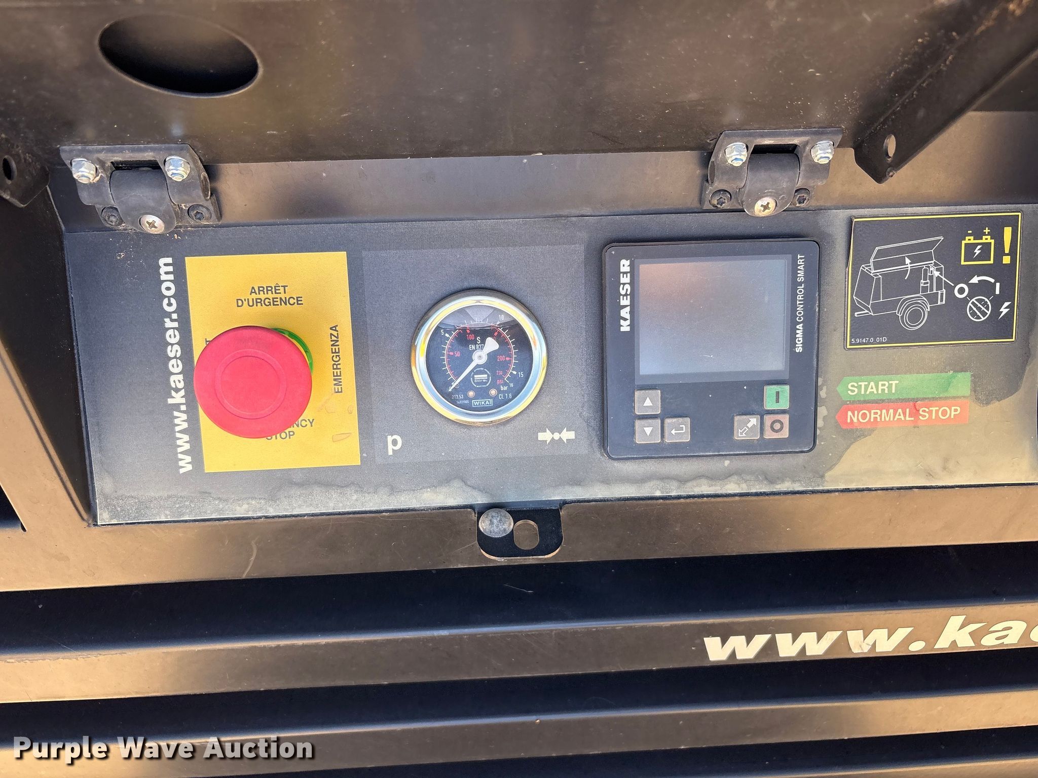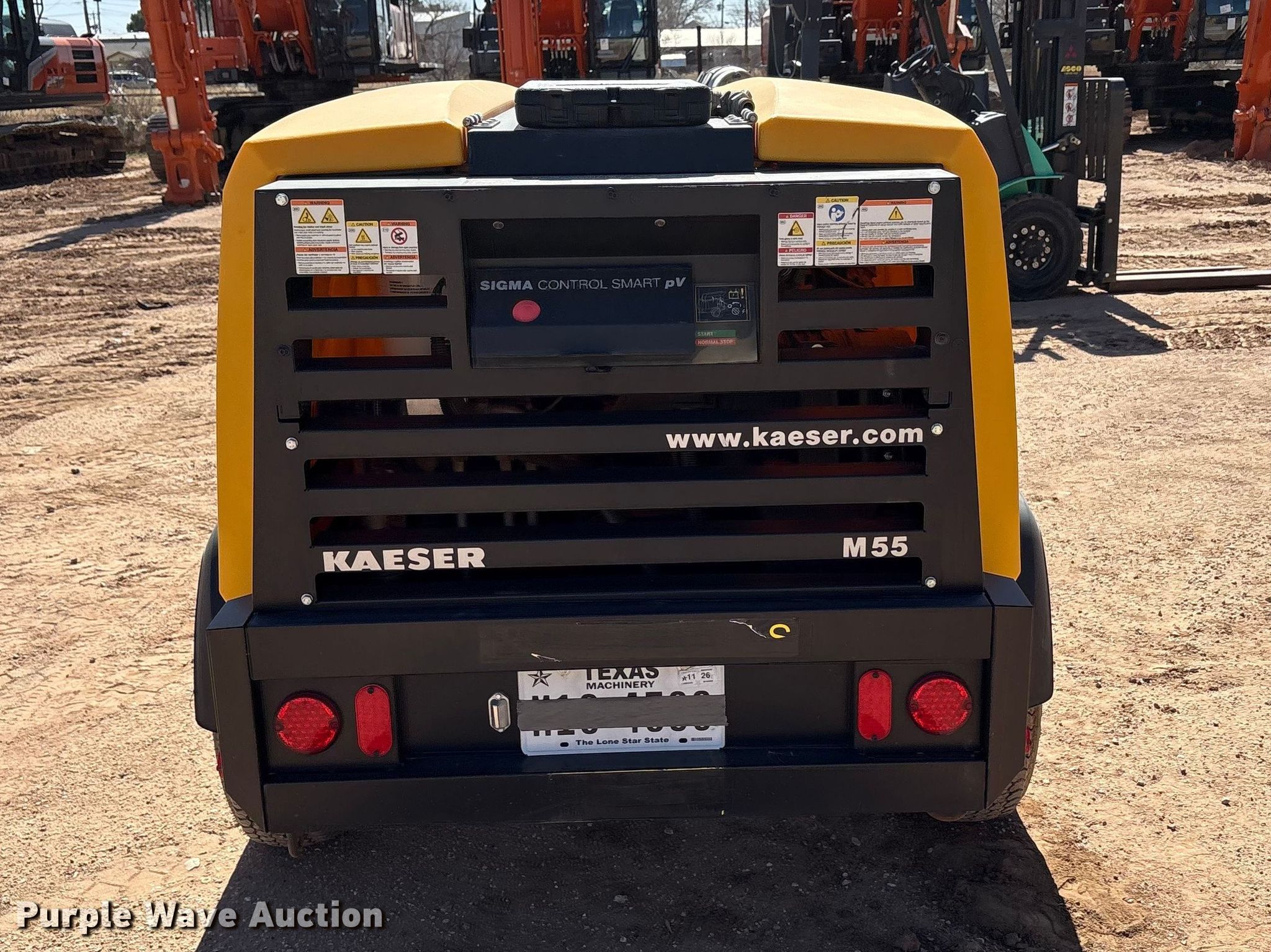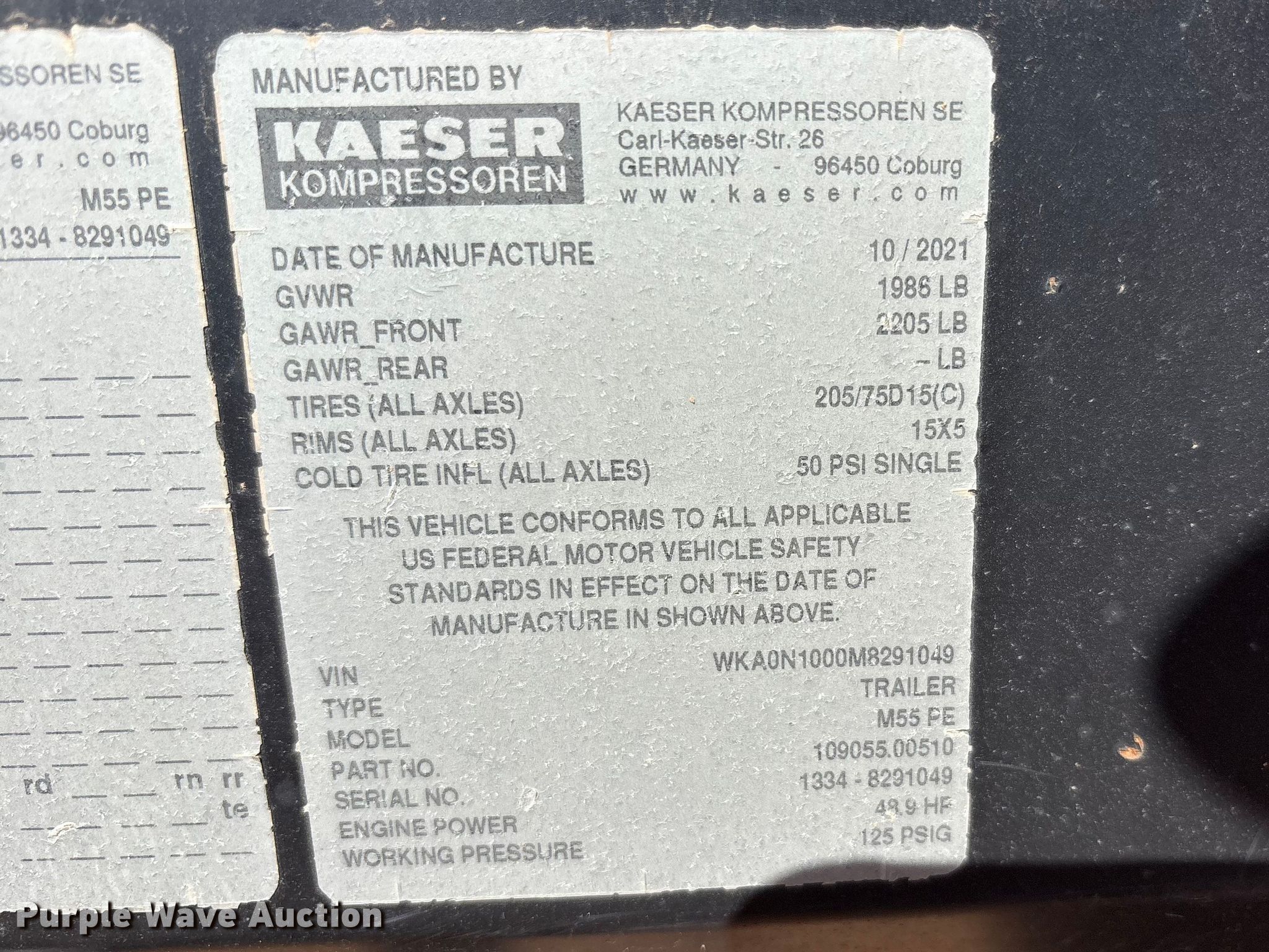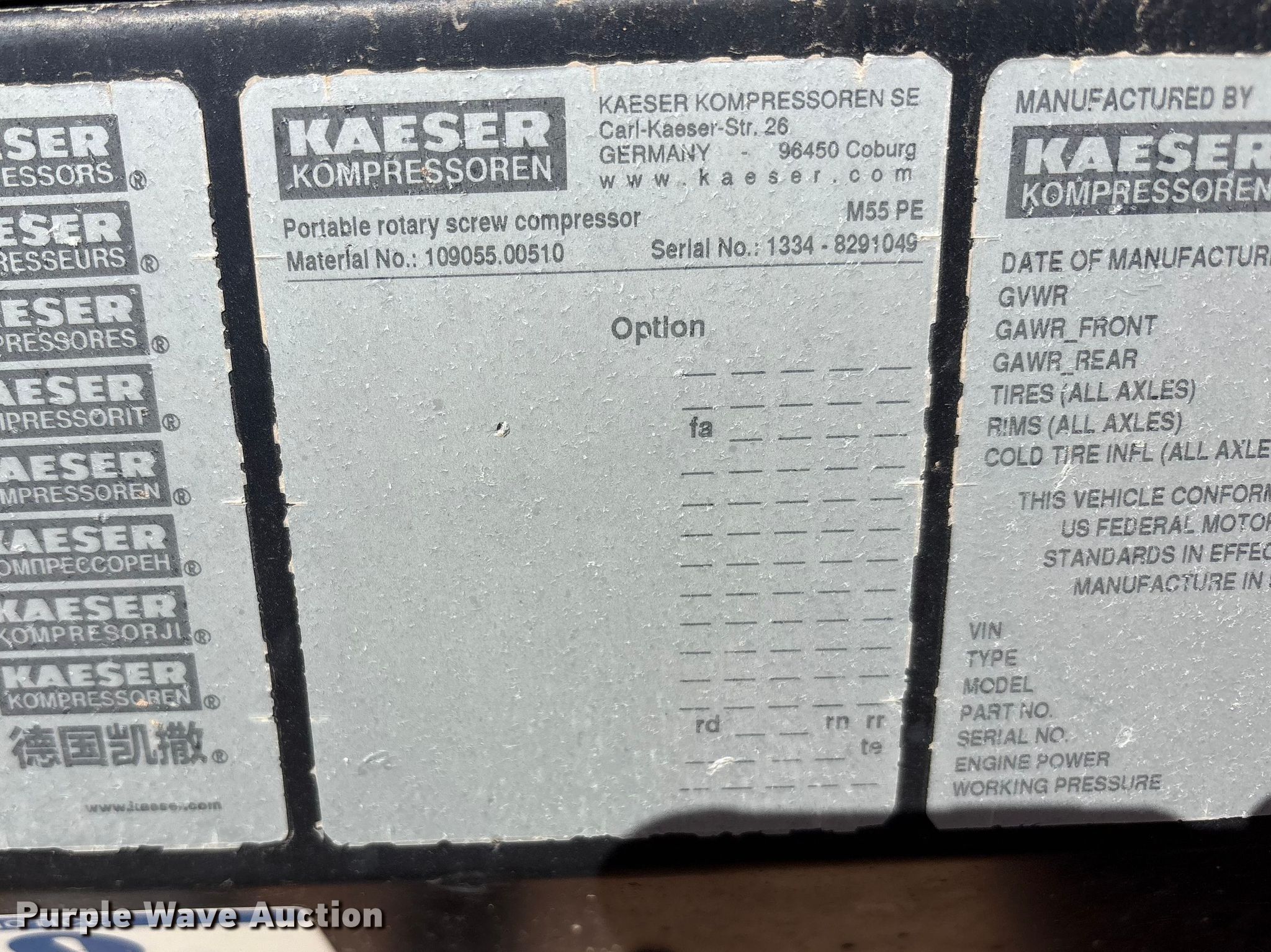 Purple Wave is selling a used Air Compressor in Texas. This item is a Kaeser M55 air compressor with the following: Hours: 911 on meter, VIN: WKAON1000M8291049, Serial: 1334 - 8291049