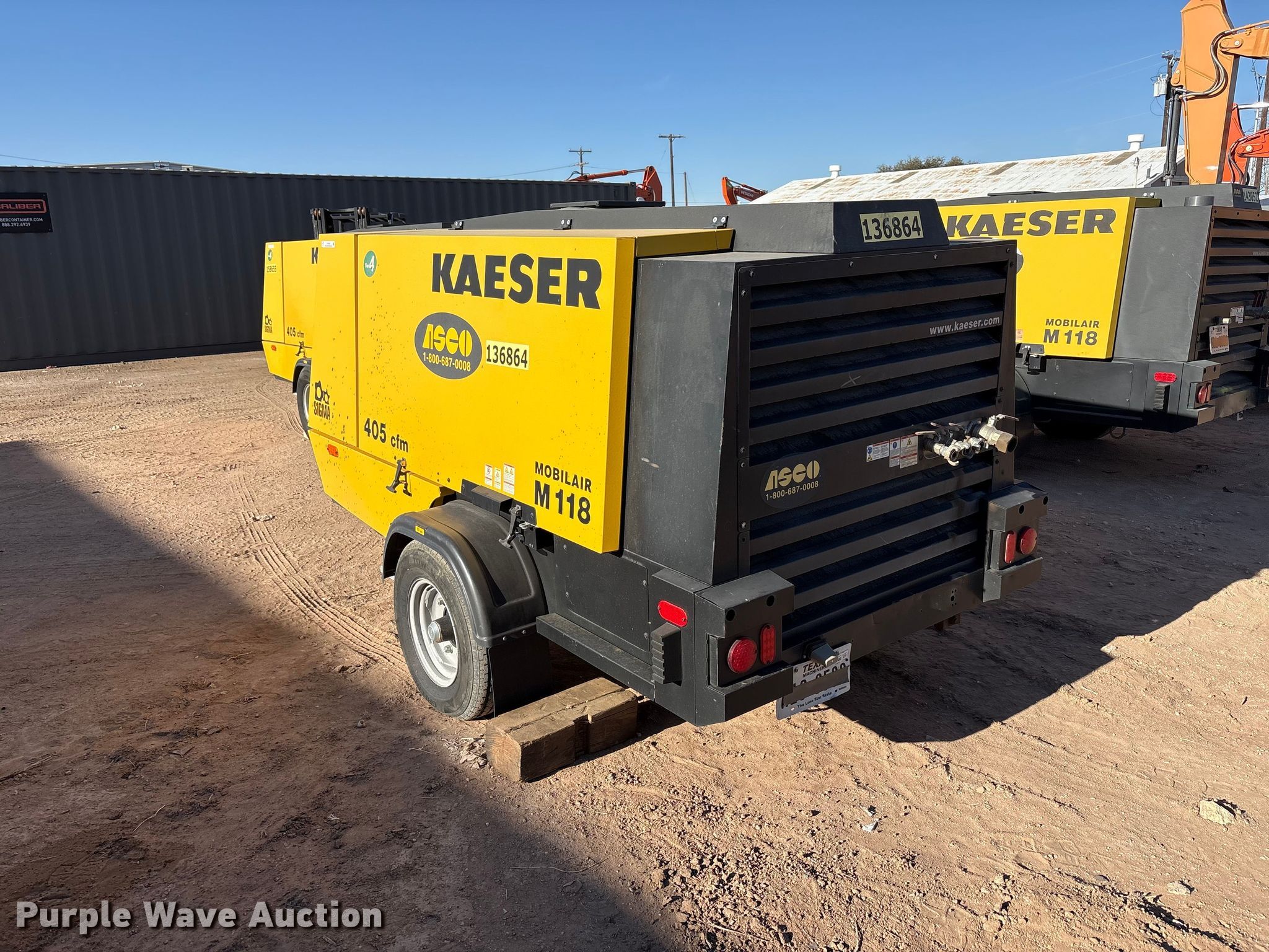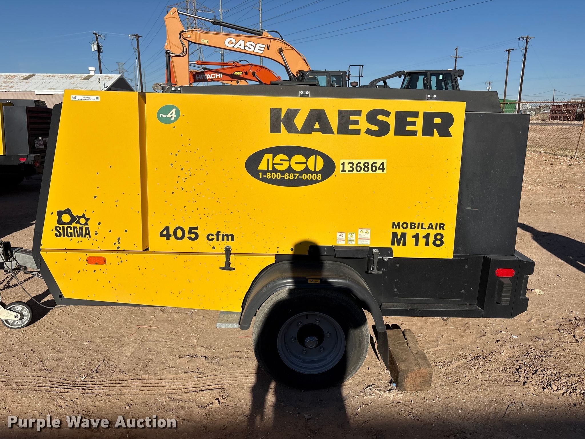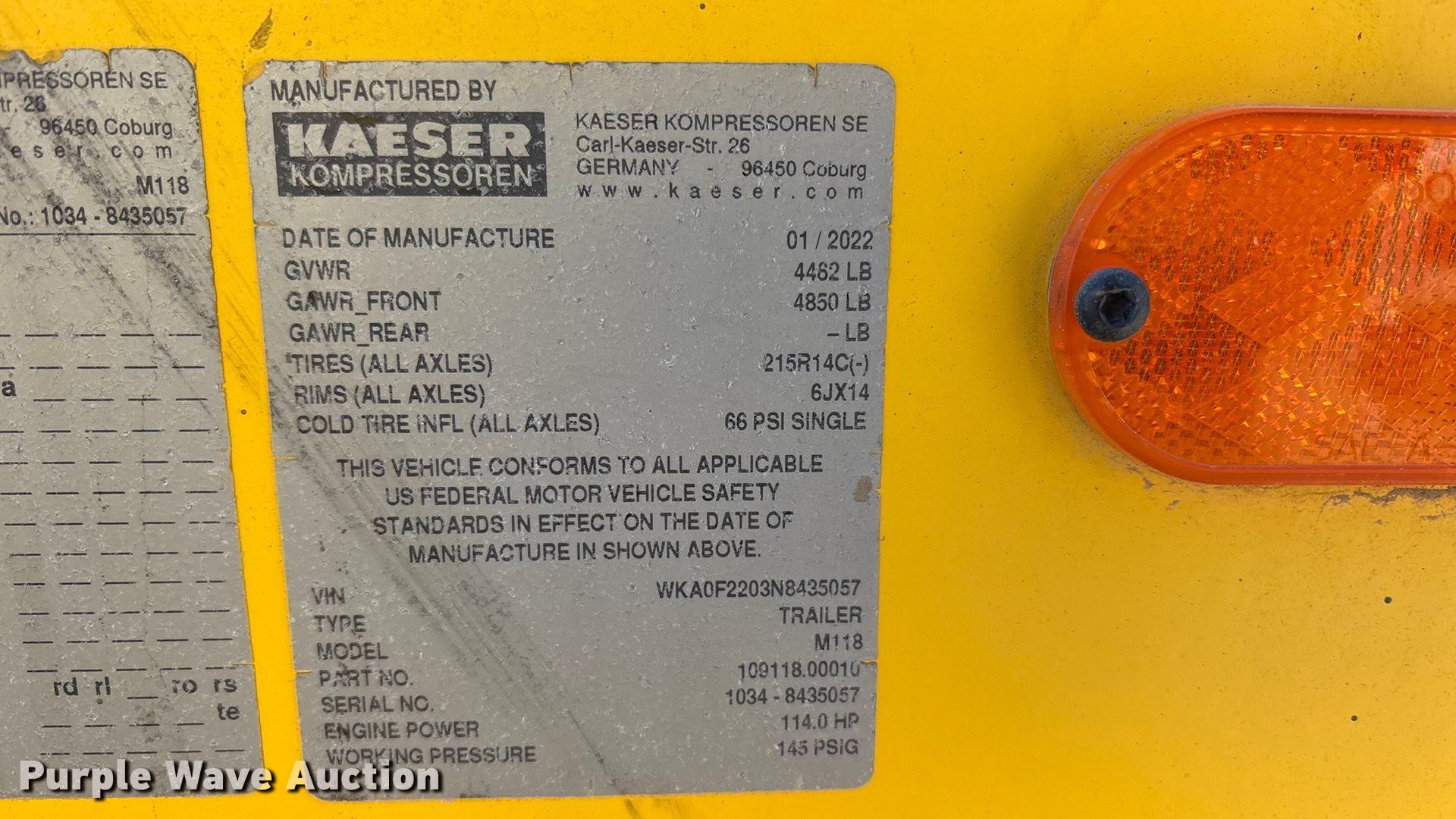 2021 Kaeser M118 air compressor. Hours: 259 on meter, VIN: WKAOF2203N8435057, Serial: 1034 - 8435057, Unit #: 136864. Engine Deutz TCD 3.6 L4, Serial: 12485768, Displacement: 3.621 L, Cylinders: 4, Fuel type: Diesel. Features Air compressor Kaeser Kompressoren M118, CFM: 405, PSI: 145. Trailer Ball hitch size: 2", Suspension: Torsion, Brakes: Hydraulic, Axles: Single, Tire size: 215R14C, GVWR: 4,482 lbs, GAWR: 4,850 lbs. Notes Jump start required during on-site data collection. This is worksite support equipment and will not come with a title. Transfer of ownership documentation will be a bill of sale. ASCO Equipment. Odessa, TX 79764