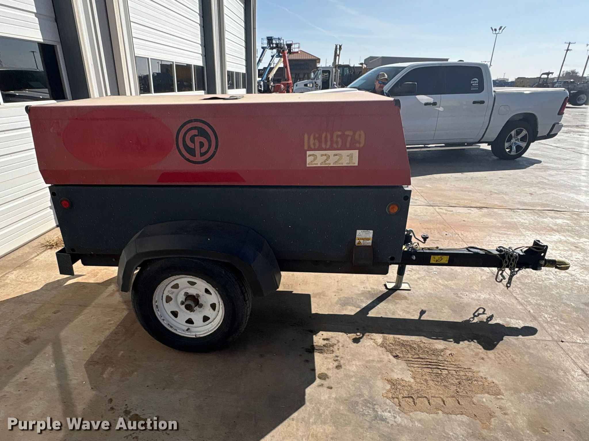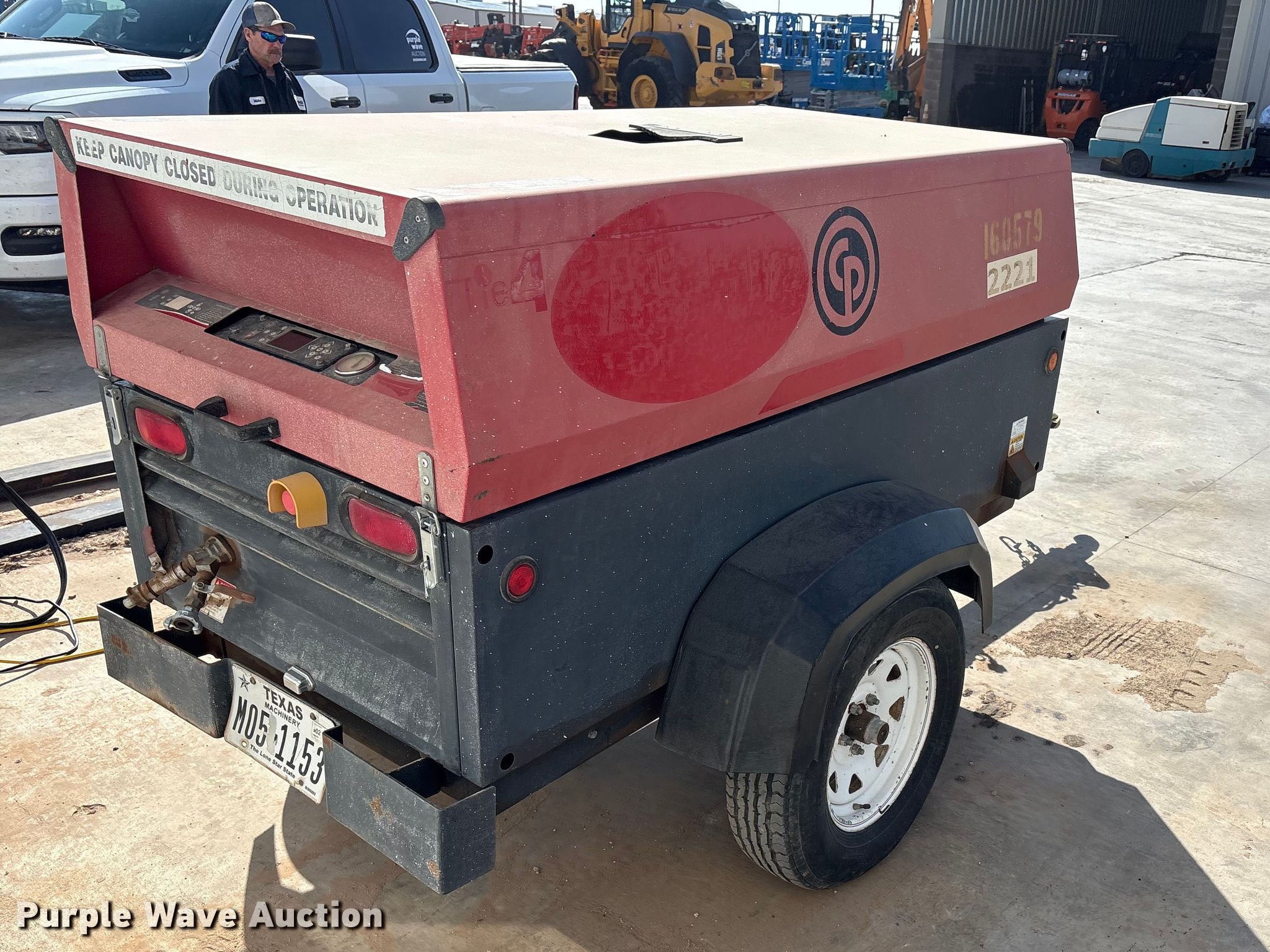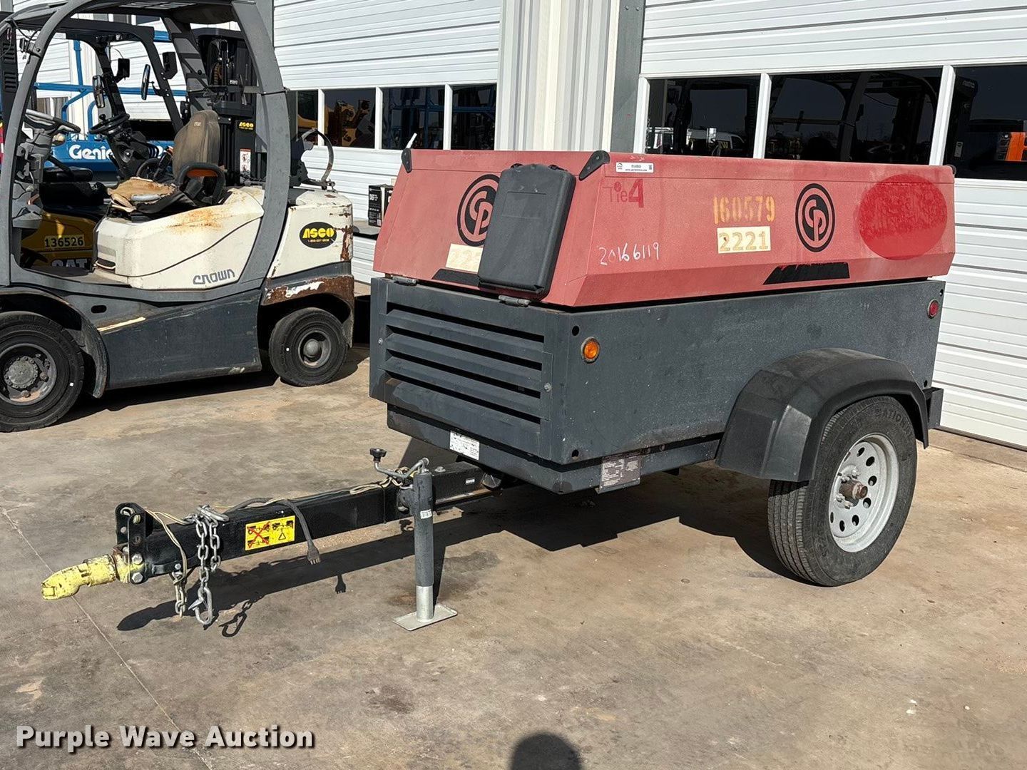 Purple Wave is selling a used Air Compressor in Texas. This item is a 2016 Chicago Pneumatic CPS 185 KD7 SLT T4L air compressor with the following: Hours: 3,636 on meter, VIN: 4500A1011GR052518, Serial: ?OP052518, Unit #: 160579