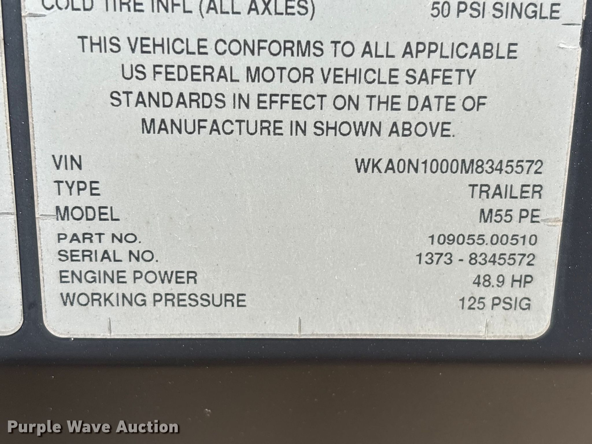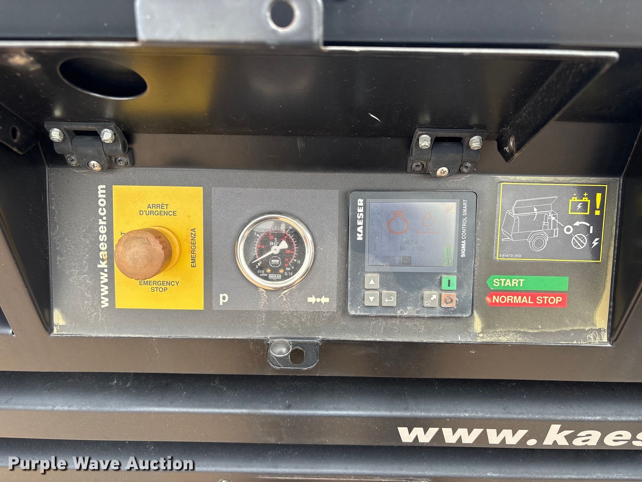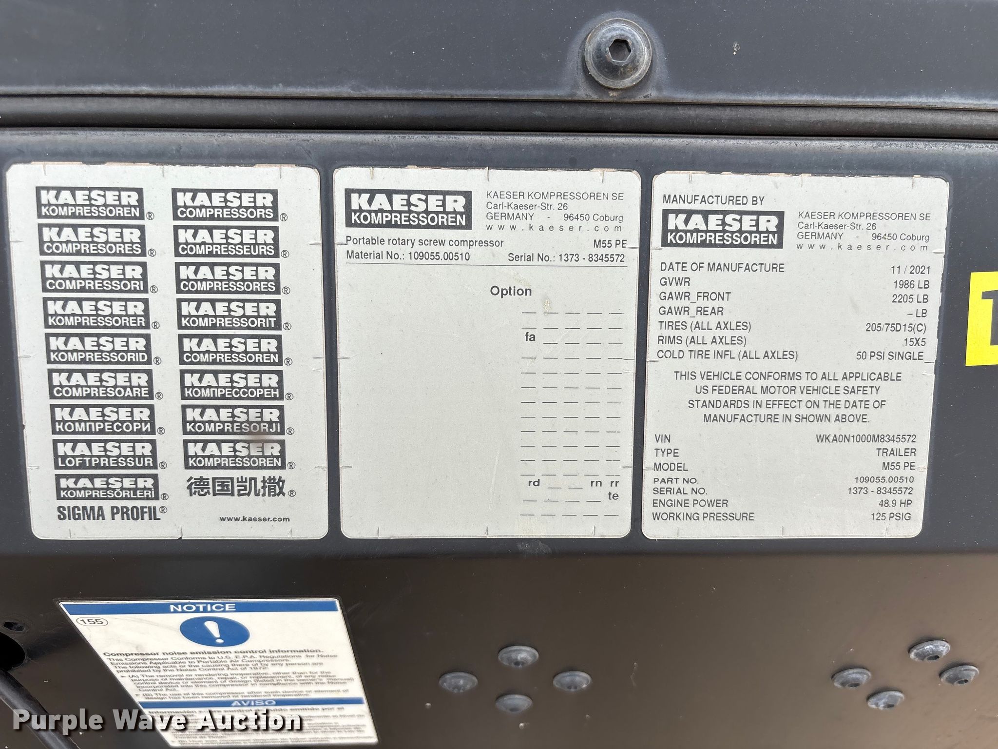 Purple Wave is selling a used Air Compressor in Texas. This item is a 2021 Kaeser M55 air compressor with the following: Hours: 852 on meter, VIN: WKA0N1000M8345572, Serial: 1373-8345572