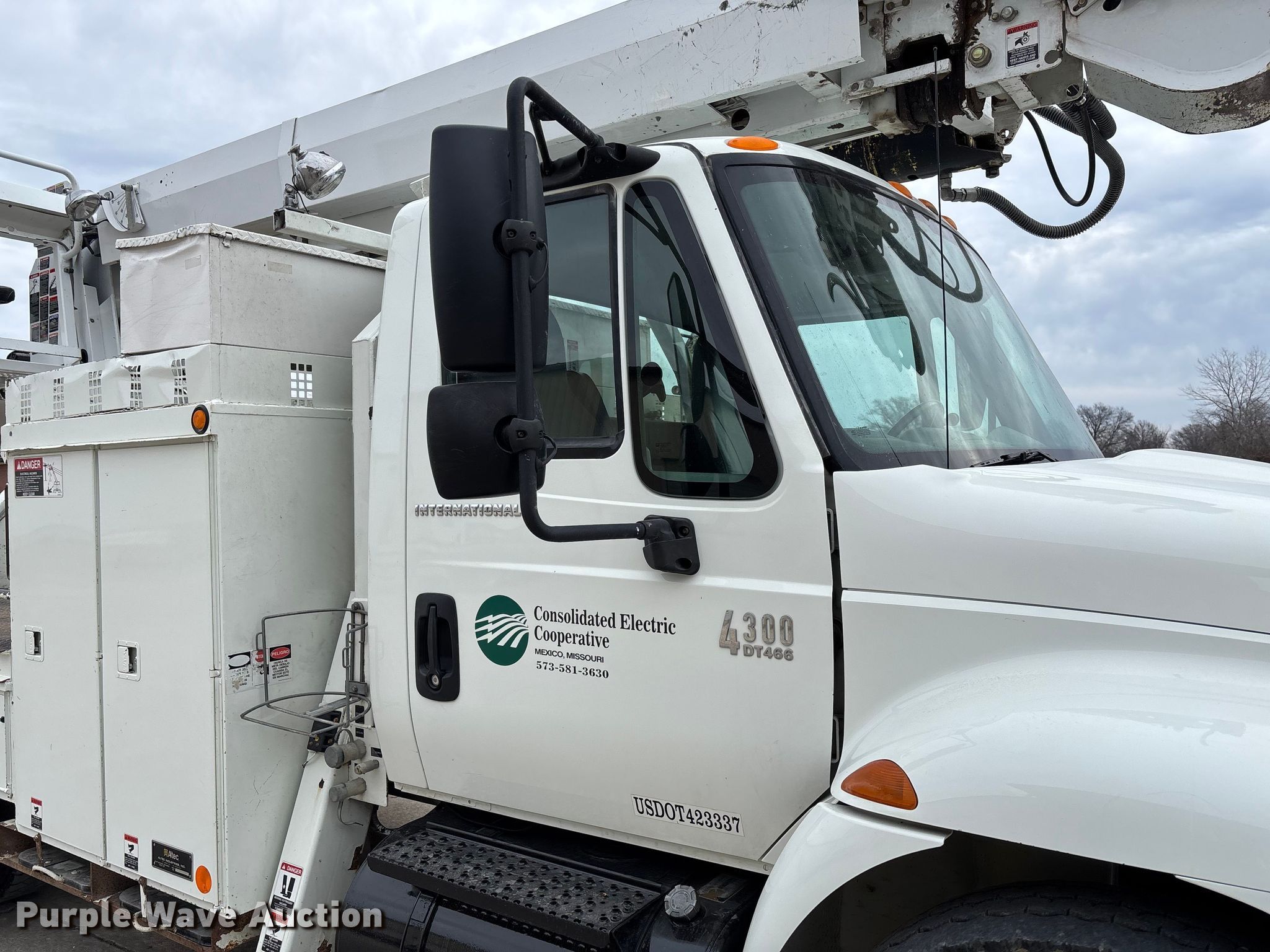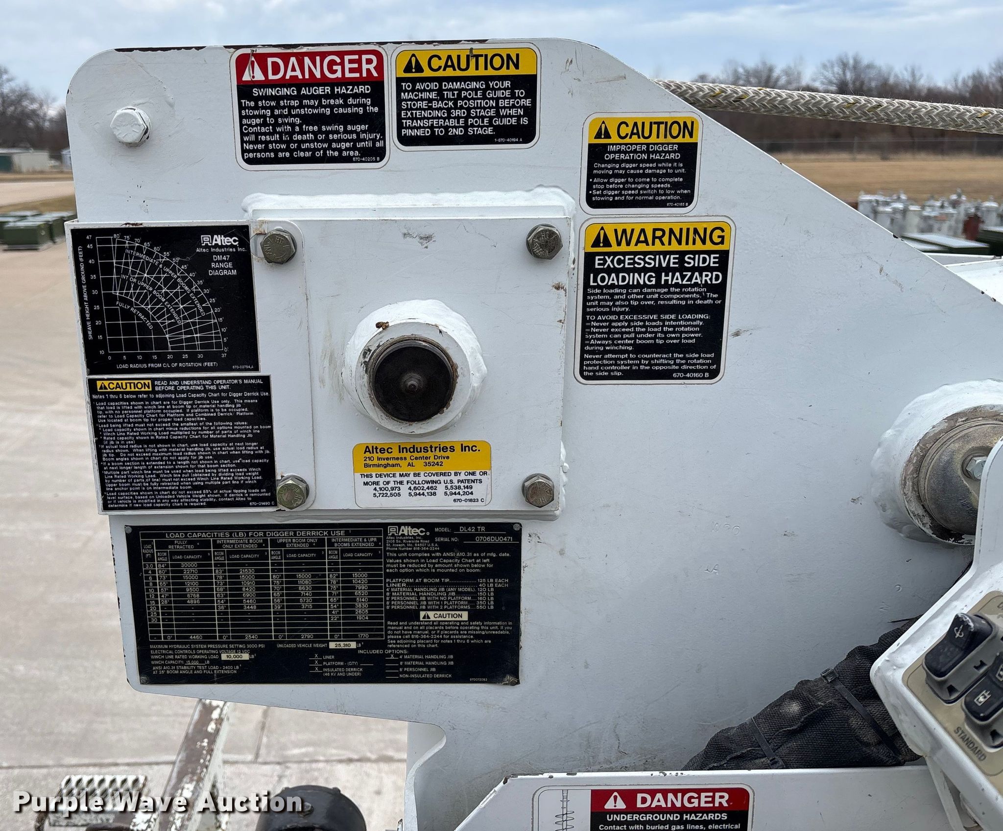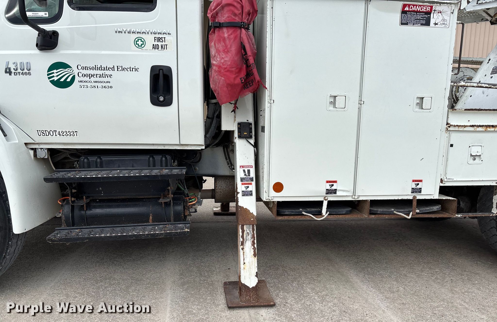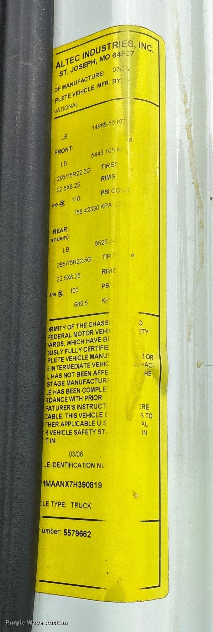 2007 International 4300 digger derrick truck. Miles: 137,179 on odometer, Hours: 11,272 on meter, Hours: 3,607 on second meter, VIN: 1HTMMAANX7H390819. Engine International DT466, Displacement: 7.64L, Cylinders: 6, Fuel type: Diesel. Transmission Automatic. Chassis Axles: Single, Suspension: Spring, Brakes: Air, PTO, GVWR: 33,000 lbs, Wheelbase: 179". Interior AC, Heat, Cruise control, Auxiliary controls, Brake controller. Features Bed Utility bed, Altec, Serial: 37-5579662, Length: 9' 5", Width: 8', Boom Altec DL42TR, Serial: 0706DU0471, Maximum lift capacity: 30,000 lbs, Maximum lift height: 42', Boom type: Insulated, Telescopic, Boom controls Platform, Material handler, Pole guide, Auger Diameter: 18".. Tires Front: 315/80R22.5, Rear: 11R22.5. Missouri title. Title distribution may be delayed up to 14 days from verification of funds. Consolidated Electric Cooperative. Mexico, MO 65265